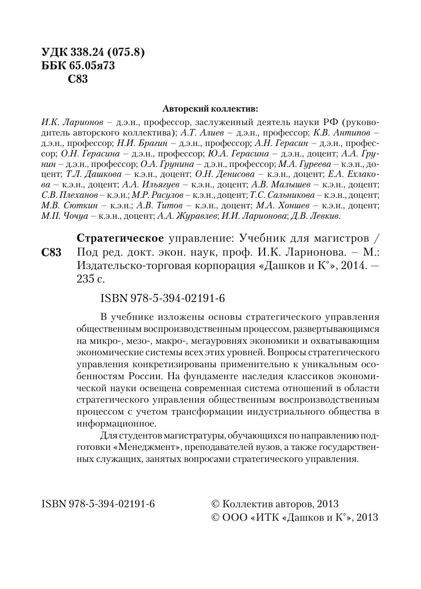В учебнике изложены основы стратегического управления общественным воспроизводственным процессом, развертывающимся на микро-, мезо-, макро-, мегауровнях экономики и охватывающим экономические системы всех этих уровней. Вопросы стратегического управления конкретизированы применительно к уникальным особенностям России. На фундаменте наследия классиков экономической науки освещена современная система отношений в области стратегического управления общественным воспроизводственным процессом с учетом трансформации индустриального общества в информационное.Для студентов магистратуры, обучающихся по направлению подготовки "Менеджмент", преподавателей вузов, а также государственных служащих, занятых вопросами стратегического управления. Гриф.