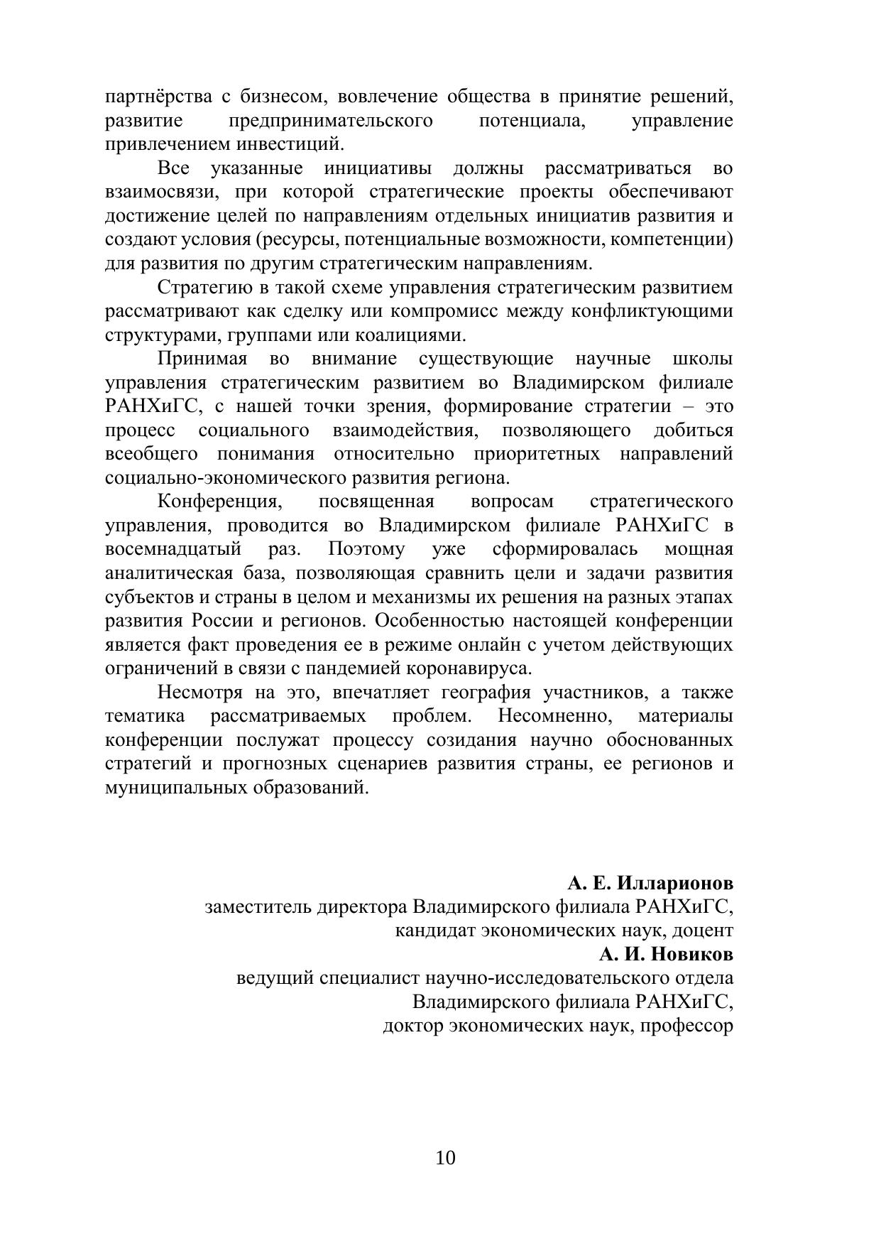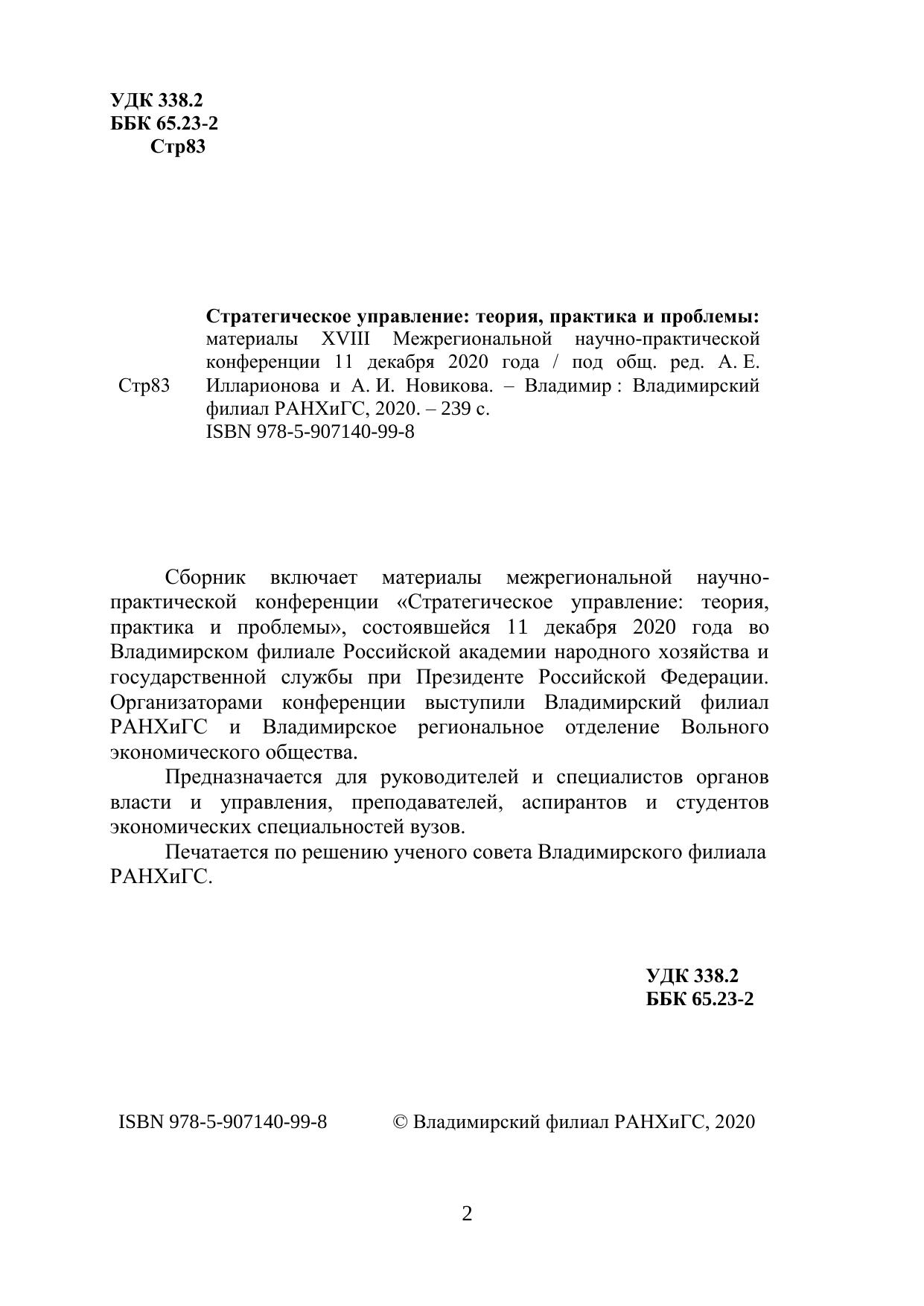 Сборник включает материалы межрегиональной научно-практической конференции «Стратегическое управление: теория, практика и проблемы», состоявшейся 11 декабря 2020 года во Владимирском филиале Российской академии народного хозяйства и государственной службы при Президенте Российской Федерации. Организаторами конференции выступили Владимирский филиал РАНХиГС и Владимирское региональное отделение Вольного экономического общества. Предназначается для руководителей и специалистов органов власти и управления, преподавателей, аспирантов и студентов экономических специальностей вузов. Печатается по решению ученого совета Владимирского филиала РАНХиГС.