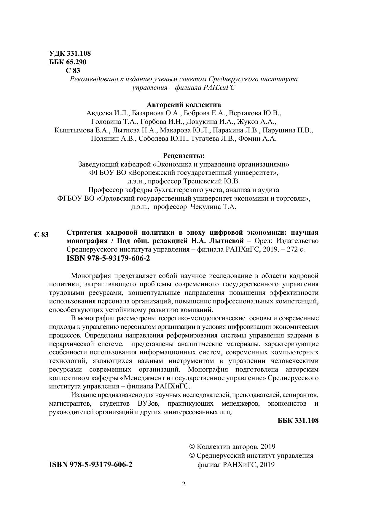 Монография представляет собой научное исследование в области кадровой политики, затрагивающего проблемы современного государственного управления трудовыми ресурсами, концептуальные направления повышения эффективности использования персонала организаций, повышение профессиональных компетенций, способствующих устойчивому развитию компаний. В монографии рассмотрены теоретико-методологические основы и современные подходы к управлению персоналом организации в условия цифровизации экономических процессов. Определены направления реформирования системы управления кадрами в иерархической системе, представлены аналитические материалы, характеризующие особенности использования информационных систем, современных компьютерных технологий, являющихся важным инструментом в управлении человеческими ресурсами современных организаций. Монография подготовлена авторским коллективом кафедры «Менеджмент и государственное управление» Среднерусского института управления – филиала РАНХиГС. Издание предназначено для научных исследователей, преподавателей, аспирантов, магистрантов, студентов ВУЗов, практикующих менеджеров, экономистов и руководителей организаций и других заинтересованных лиц.