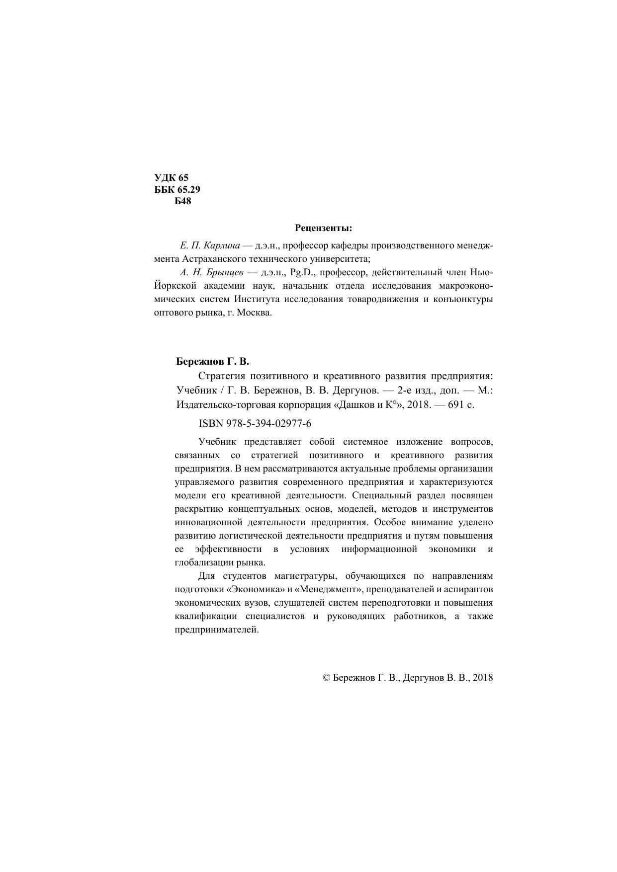 Учебник представляет собой системное изложение вопросов, связанных со стратегией позитивного и креативного развития предприятия. В нем рассматриваются актуальные проблемы организации управляемого развития современного предприятия и характеризуются модели его креативной деятельности. Специальный раздел посвящен раскрытию концептуальных основ, моделей, методов и инструментов инновационной деятельности предприятия. Особое внимание уделено развитию логистической деятельности предприятия и путям повышения ее эффективности в условиях информационной экономики и глобализации рынка. Для студентов магистратуры, обучающихся по направлениям подготовки «Экономика» и «Менеджмент», преподавателей и аспирантов экономических вузов, слушателей систем переподготовки и повышения квалификации специалистов и руководящих работников, а также предпринимателей.