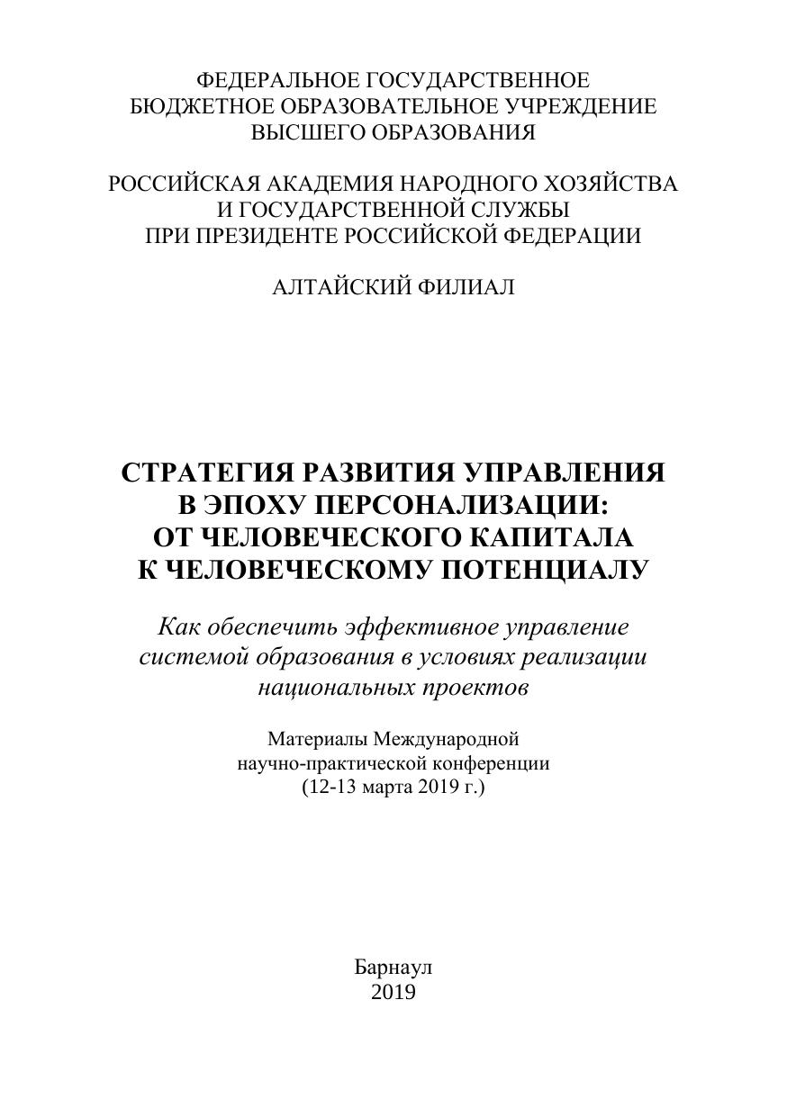 Стратегия развития управления в эпоху персонализации: от человеческого капитала к человеческому потенциалу (Как обеспечить эффективное управление системой образования в условиях реализации национальных проектов) / материалы Международной научно-практической конференции: (12-13 марта 2019 г.)