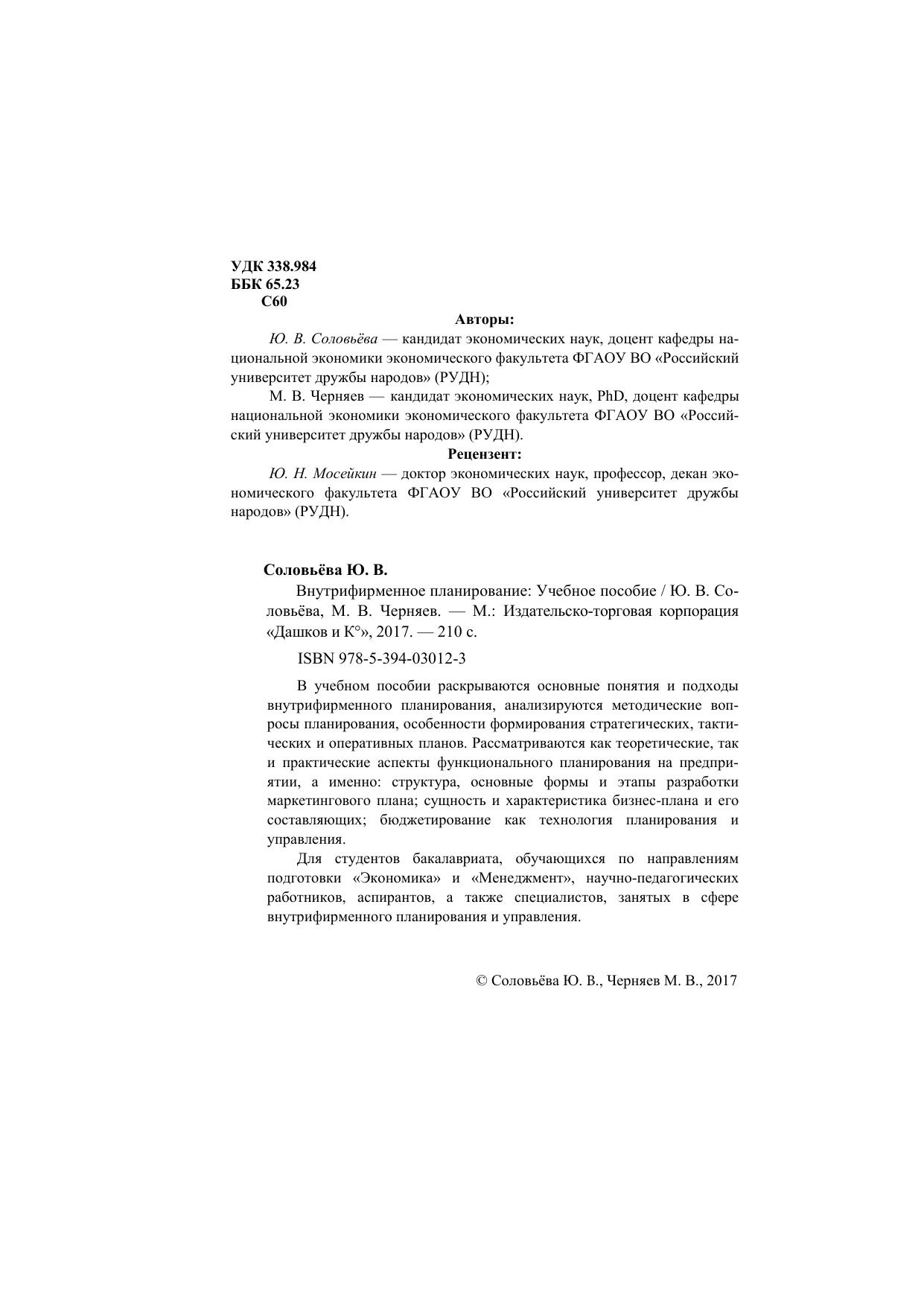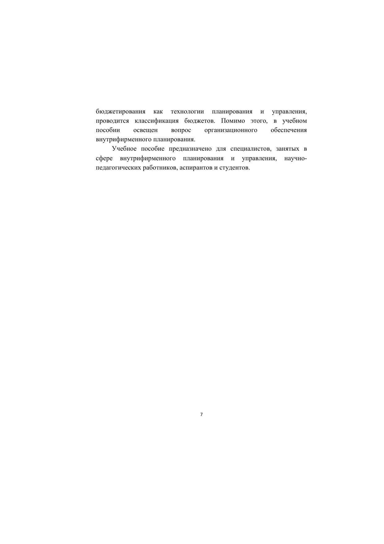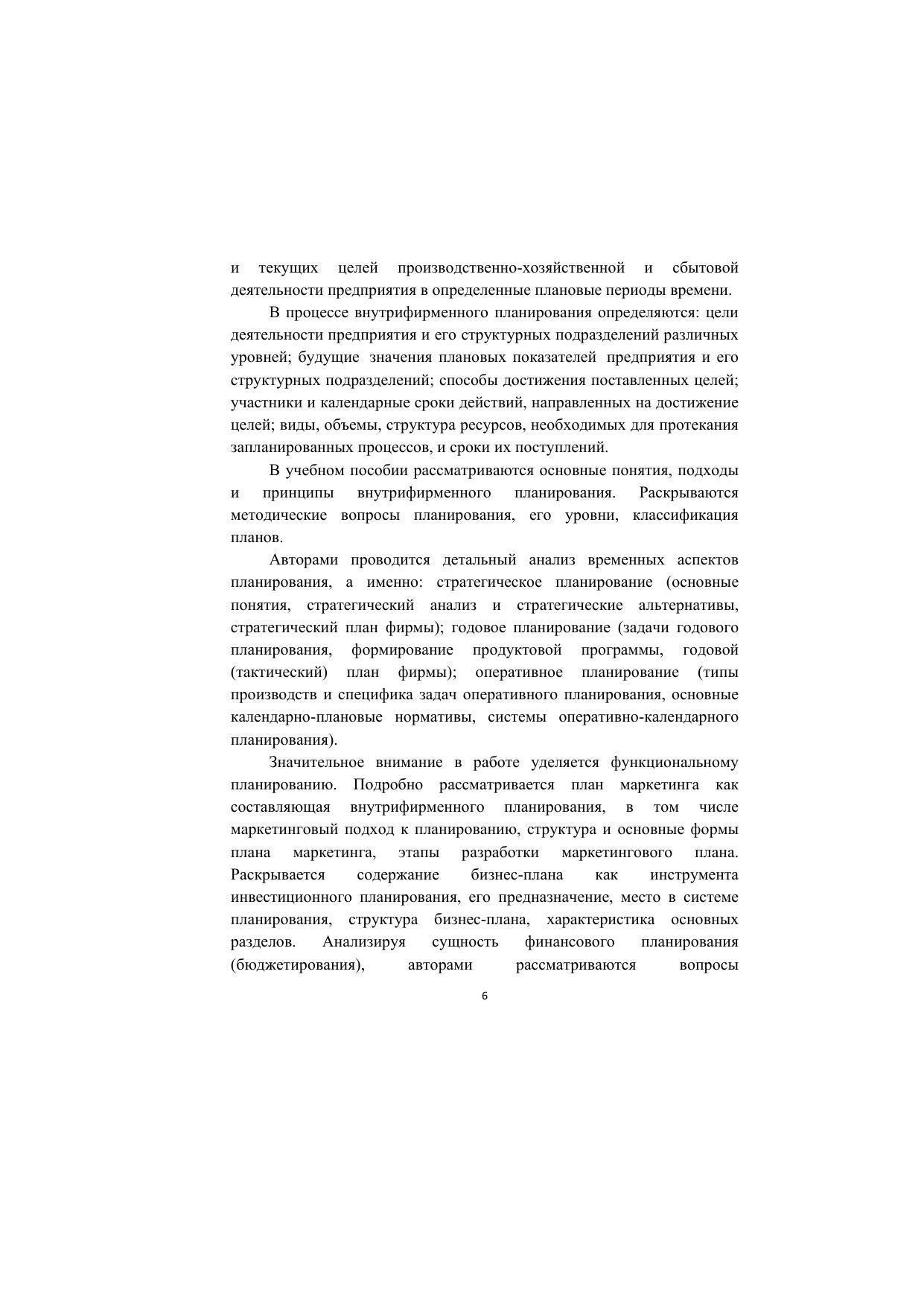 В учебном пособии раскрываются основные понятия и подходы внутрифирменного планирования, анализируются методические вопросы планирования, особенности формирования стратегических, тактических и оперативных планов. Рассматриваются как теоретические, так и практические аспекты функционального планирования на предприятии, а именно: структура, основные формы и этапы разработки маркетингового плана; сущность и характеристика бизнес-плана и его составляющих; бюджетирование как технология планирования и управления. Для студентов бакалавриата, обучающихся по направлениям подготовки «Экономика» и «Менеджмент», научно-педагогических работников, аспирантов, а также специалистов, занятых в сфере внутрифирменного планирования и управления.