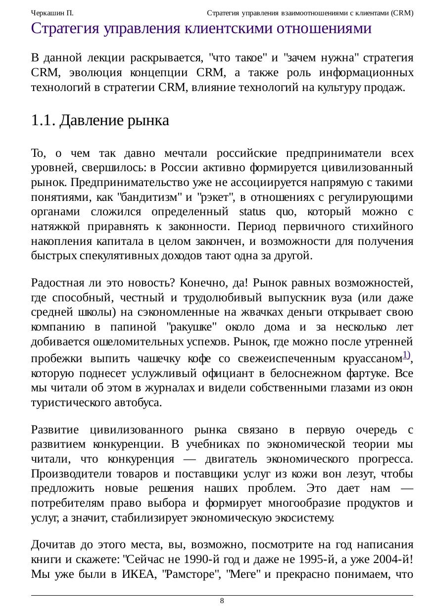 CRM - новомодная концепция построения бизнеса вокруг своих клиентов, в соответствии с их требованиями и ожиданиями. Это возможность "индустриализировать" процессы взаимодействия с клиентами, сделать их управляемыми и предсказуемыми. В курсе даются четкие и понятные ответы на ряд вопросов связанных с качеством обслуживания клиентов, оценкой эффективности маркетинговых инициатив, использования возможности Интернета для клиентского самообслуживания.