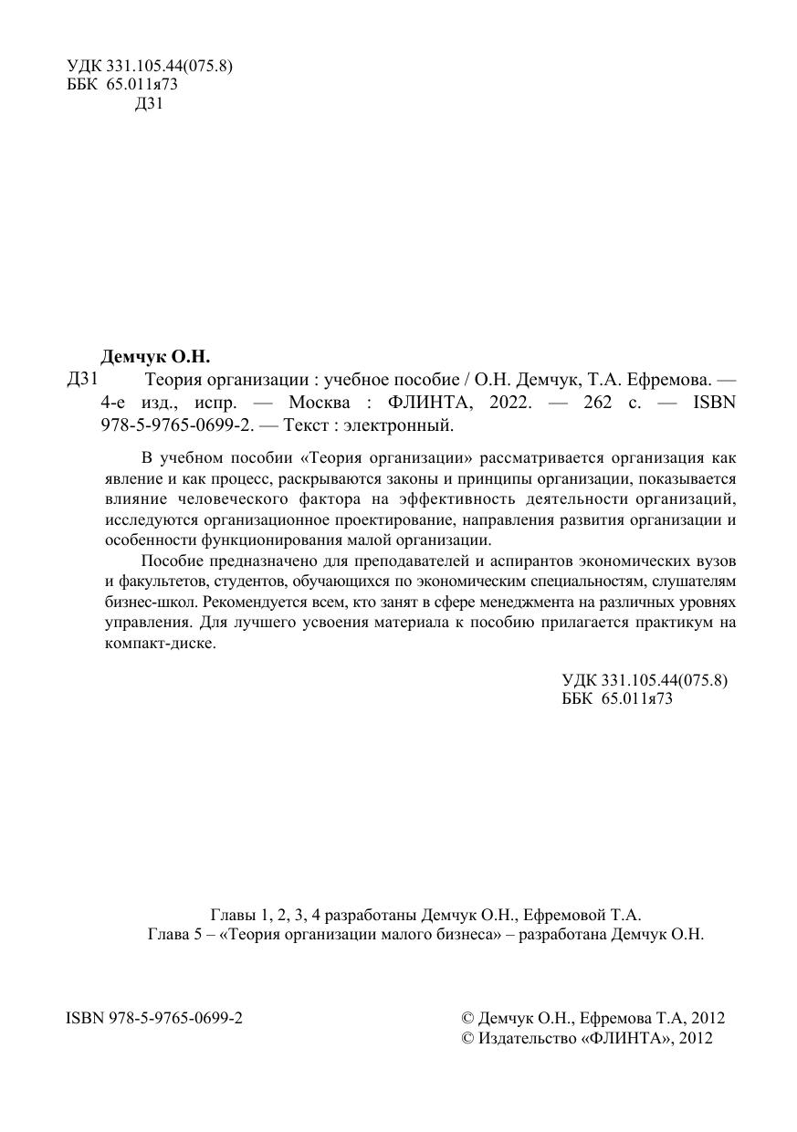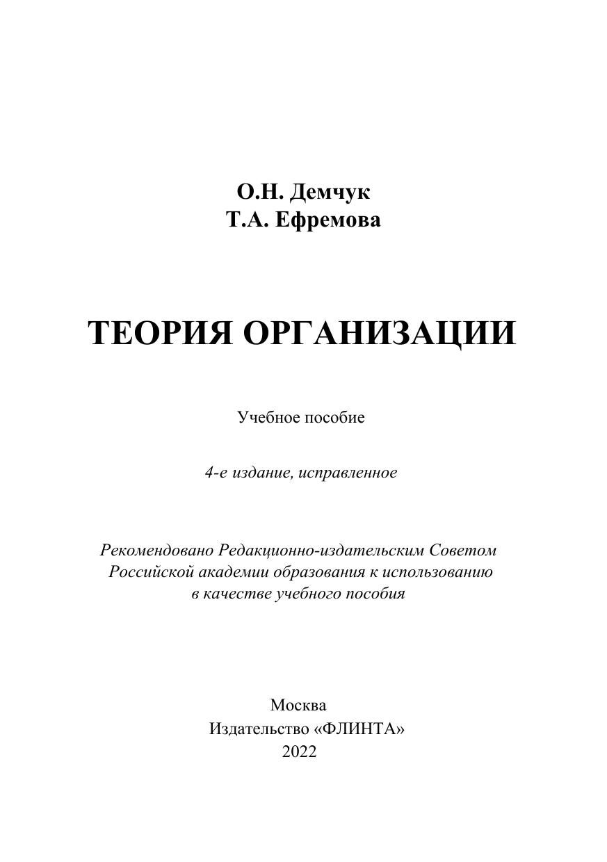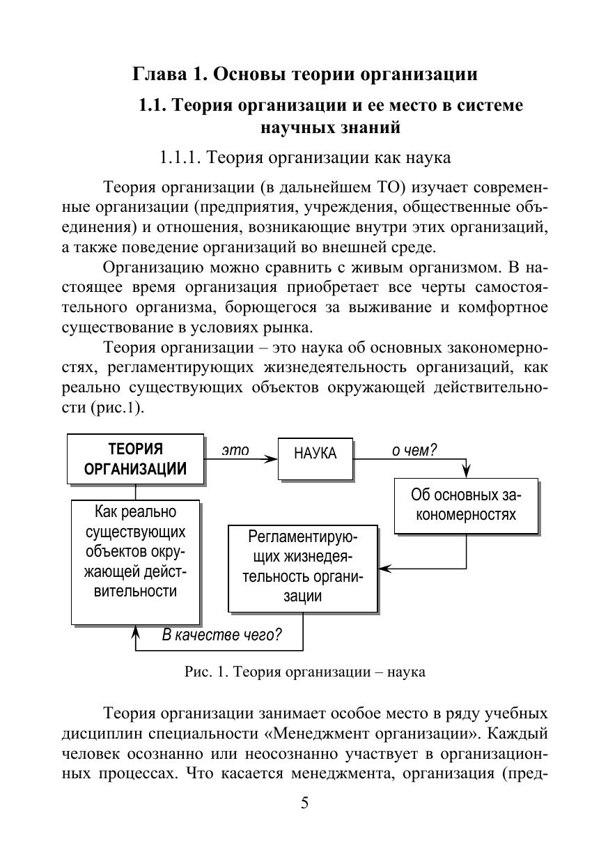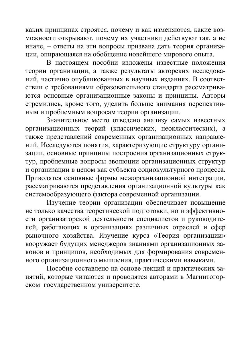 В учебном пособии «Теория организации» рассматривается организация как явление и как процесс, раскрываются законы и принципы организации, показывается влияние человеческого фактора на эффективность деятельности организаций, исследуются организационное проектирование, направления развития организации и особенности функционирования малой организации.