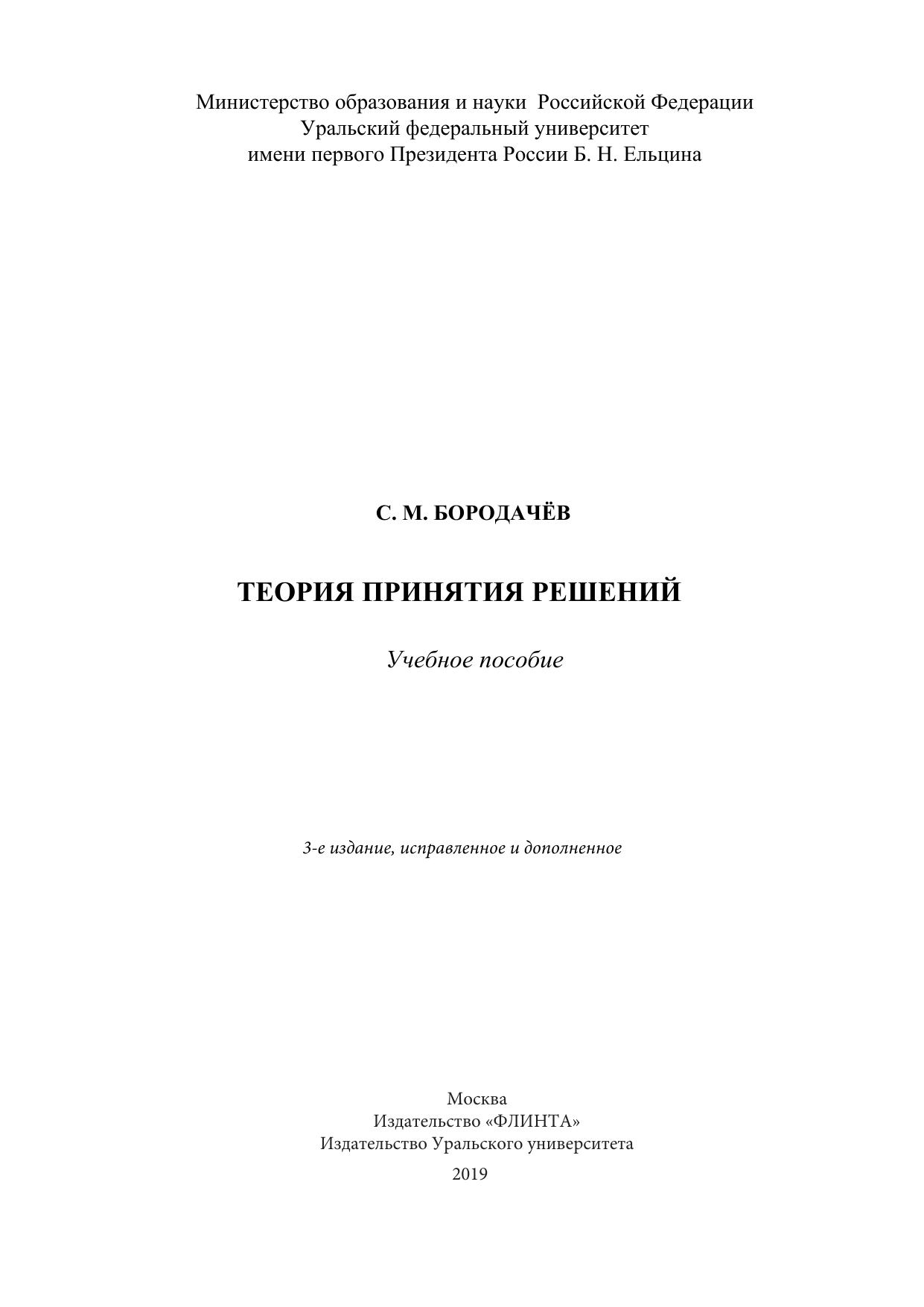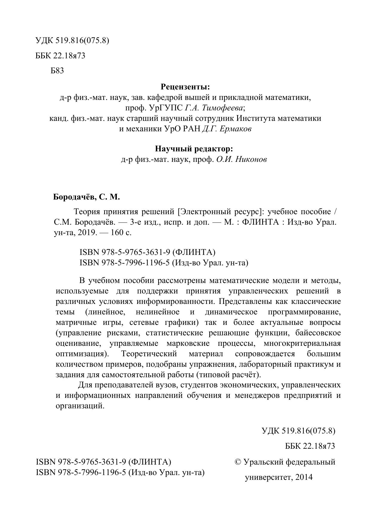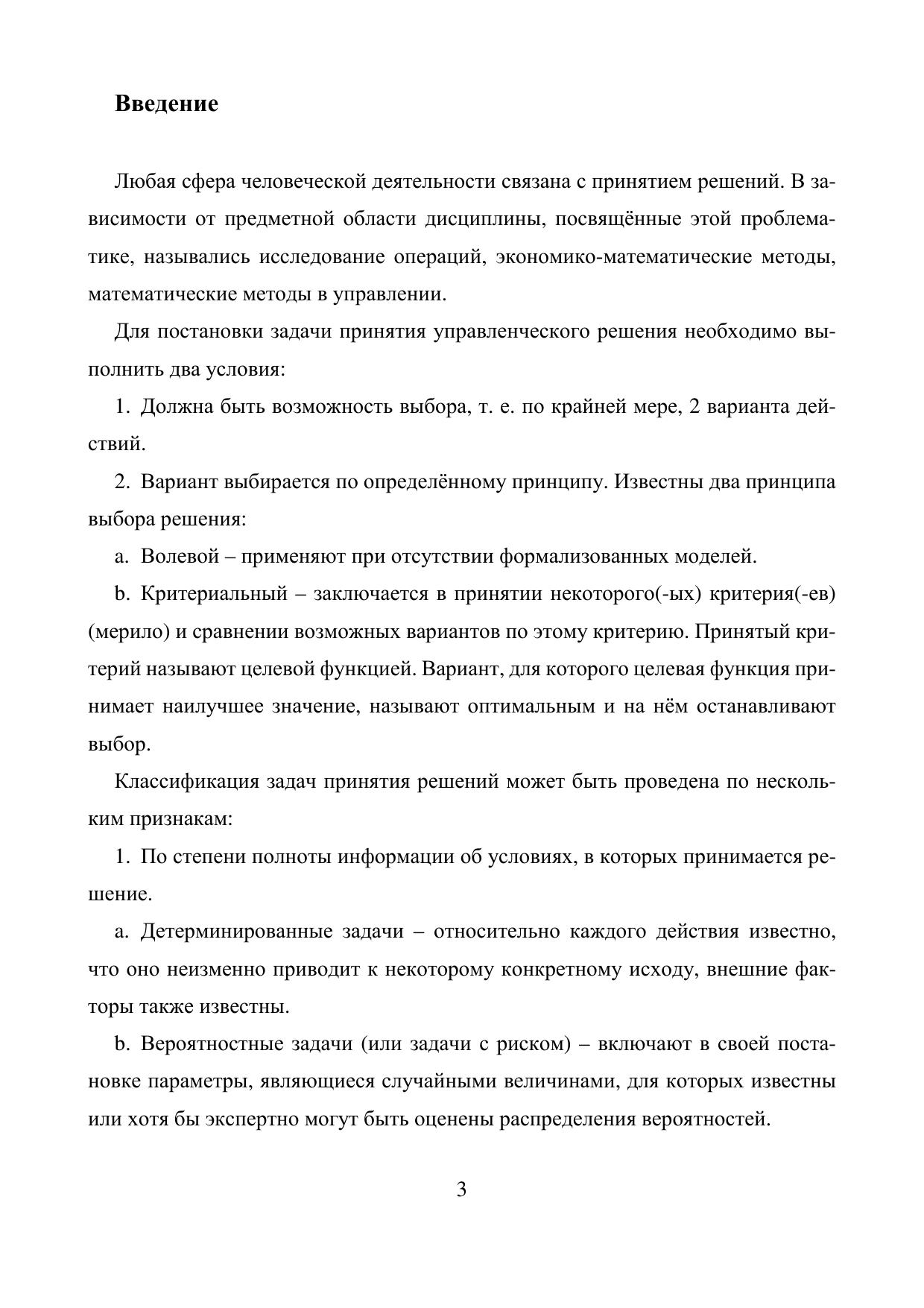 В учебном пособии рассмотрены математические модели и методы, используемые для поддержки принятия управленческих решений в различных условиях информированности. Представлены как классические темы (линейное, нелинейное и динамическое программирование, матричные игры, сетевые графики) так и более актуальные вопросы (управление рисками, статистические решающие функции, байесовское оценивание, управляемые марковские процессы, многокритериальная оптимизация). Теоретический материал сопровождается большим количеством примеров, подобраны упражнения, лабораторный практикум и задания для самостоятельной работы (типовой расчёт).