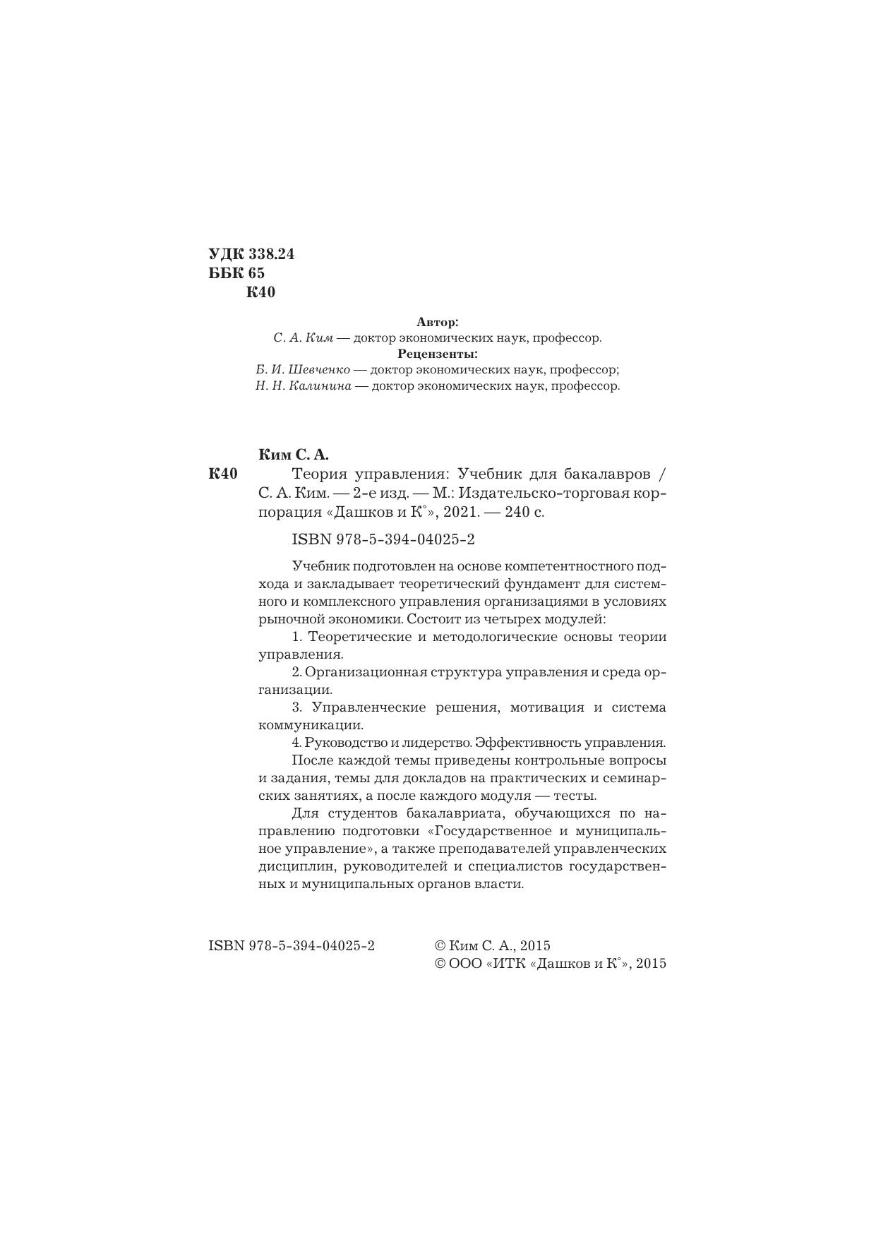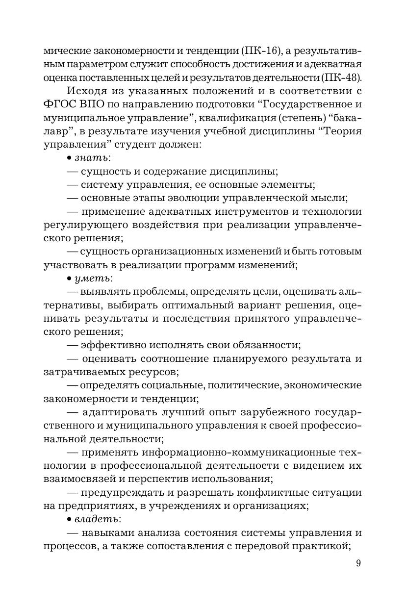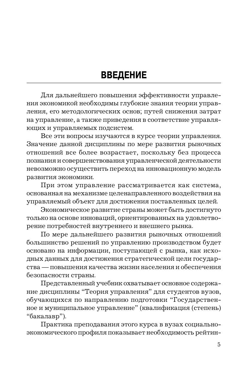 Учебник подготовлен на основе компетентностного подхода и закладывает теоретический фундамент для системного и комплексного управления организациями в условиях рыночной экономики. Состоит из четырех модулей: 1. Теоретические и методологические основы теории управления. 2. Организационная структура управления и среда организации. 3. Управленческие решения, мотивация и система коммуникации. 4. Руководство и лидерство. Эффективность управления. После каждой темы приведены контрольные вопросы и задания, темы для докладов на практических и семинарских занятиях, а после каждого модуля-тесты. Для студентов бакалавриата, обучающихся по направлению подготовки "Государственное и муниципальное управление", а также преподавателей управленческих дисциплин, руководителей и специалистов государственных и муниципальных органов власти.