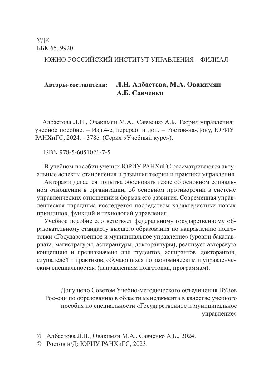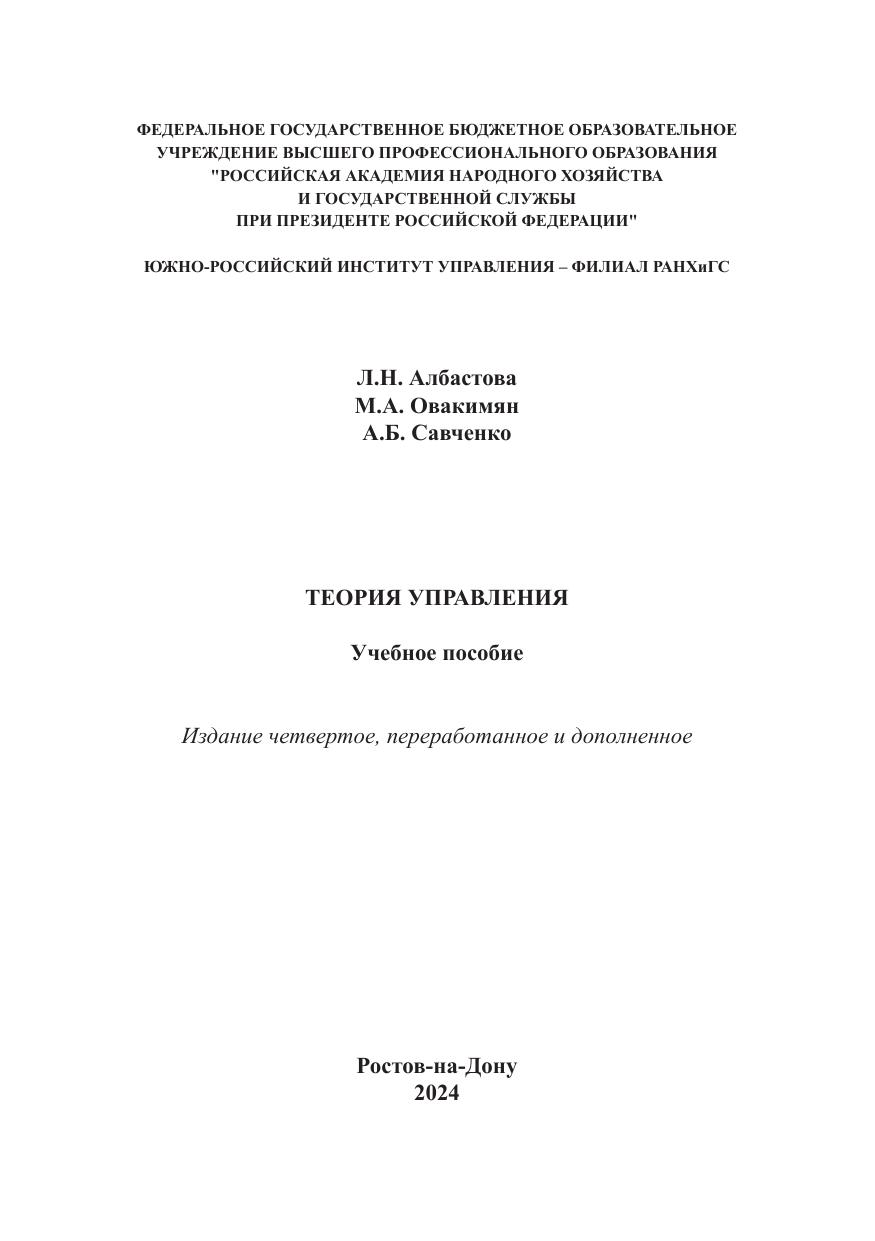 В учебном пособии ученых ЮРИУ РАНХиГС рассматриваются актуальные аспекты становления и развития теории и практики управления. Авторами делается попытка обосновать тезис об основном социальном отношении в организации, об основном противоречии в системе управленческих отношений и формах его развития. Современная управленческая парадигма исследуется посредством характеристики новых принципов, функций и технологий управления. Учебное пособие соответствует федеральному государственному образовательному стандарту высшего образования по направлению подготовки «Государственное и муниципальное управление» (уровни бакалавриата, магистратуры, аспирантуры, докторантуры), реализует авторскую концепцию и предназначено для студентов, аспирантов, докторантов, слушателей и практиков, обучающихся по экономическим и управленческим специальностям (направлениям подготовки, программам).
