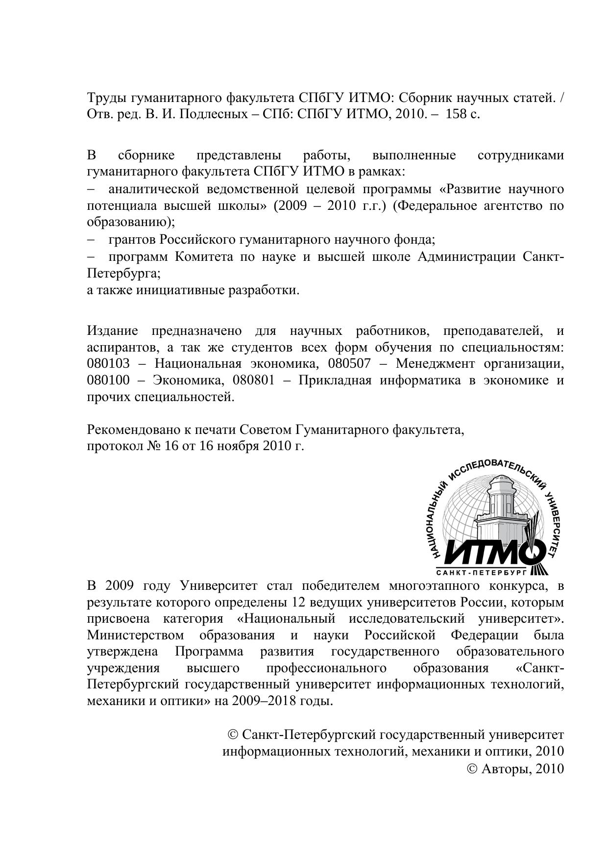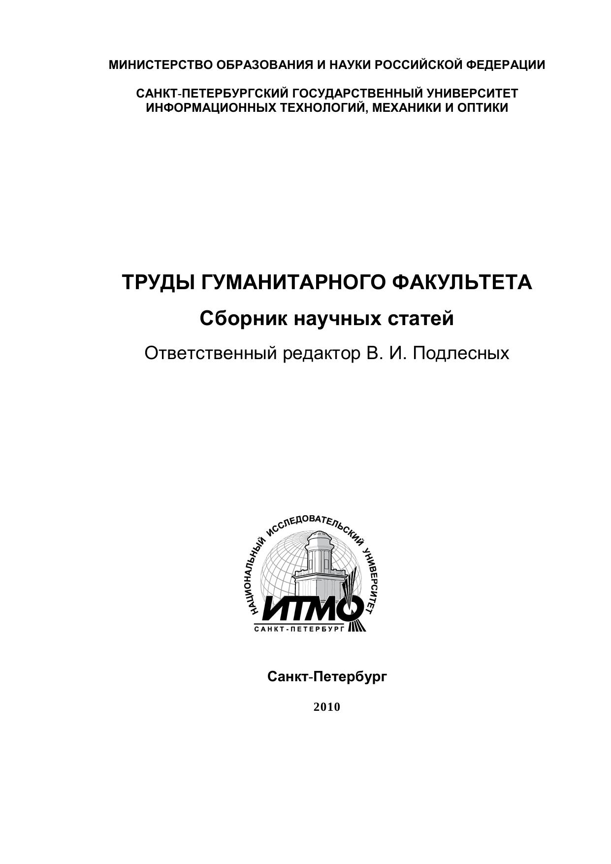 В сборнике представлены работы, выполненные сотрудниками гуманитарного факультета СПбГУ ИТМО в рамках: