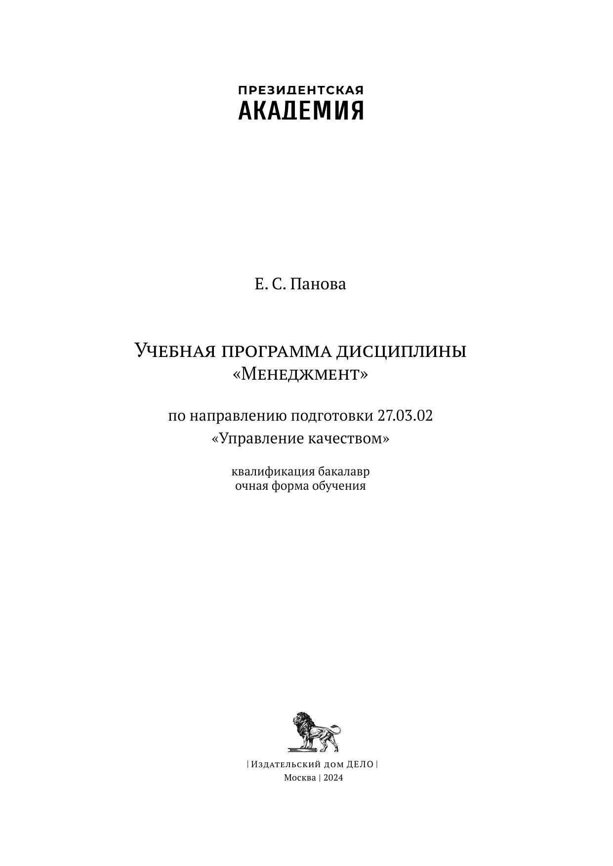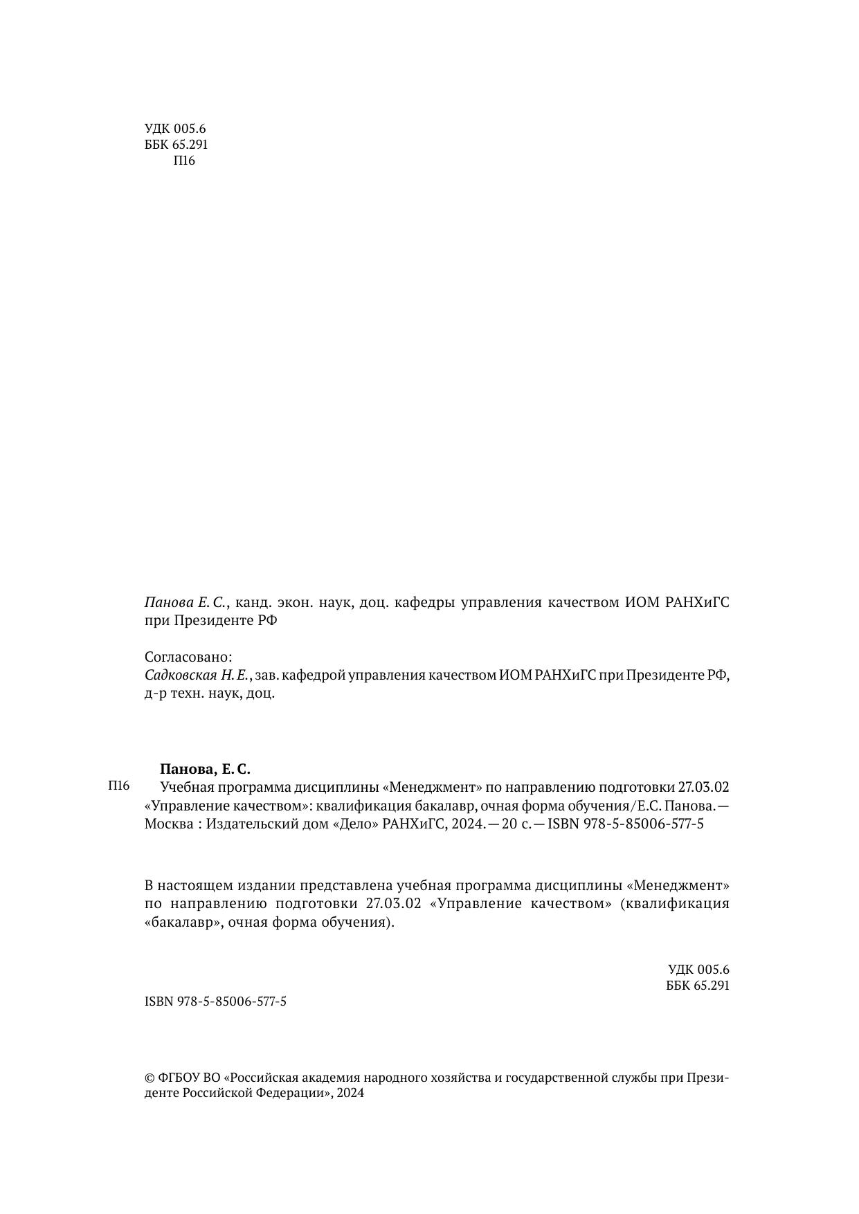 В настоящем издании представлена учебная программа дисциплины «Менеджмент» по направлению подготовки 27.03.02 «Управление качеством» (квалификация «бакалавр», очная форма обучения).