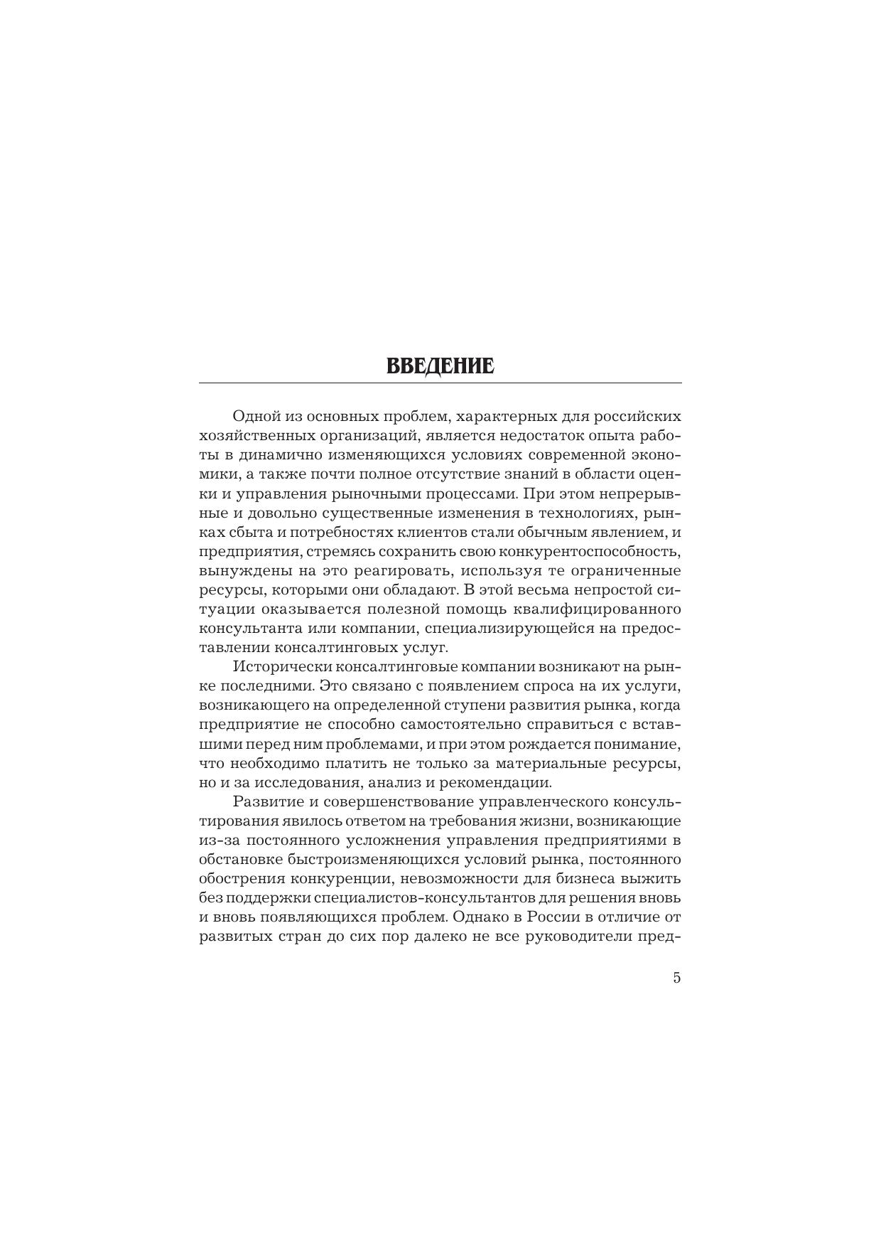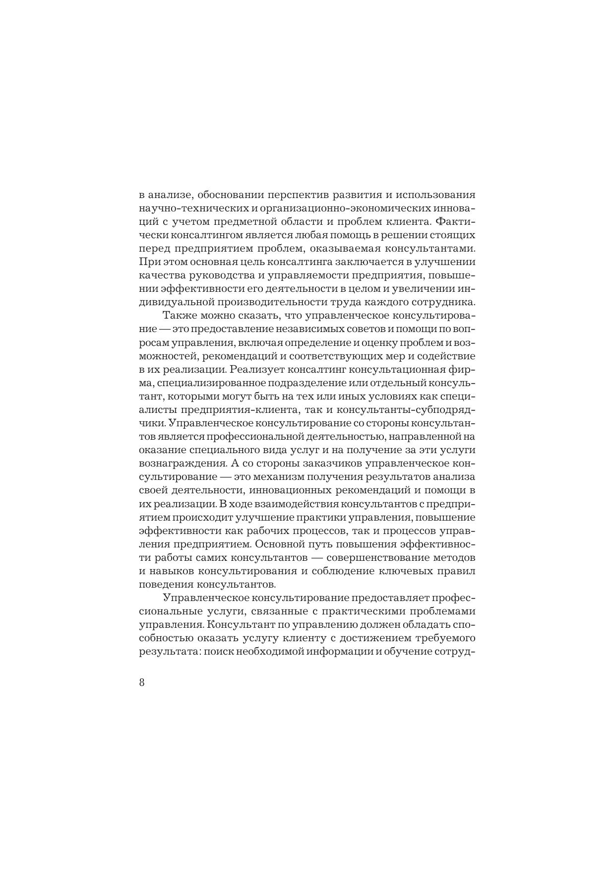 Представлены отношения между консультантом и клиентом, процесс их взаимодействия. Рассматриваются особенности внутреннего и внешнего, экспертного, процессного, проектного, обучающего консалтинга, а также его различных специфических видов. Отражено консультирование по управлению информацией, знаниями, интеллектуальным капиталом организации. Для студентов магистратуры, бакалавриата и специалитета, руководителей и специалистов предприятий, предпринимателей, начинающих и практикующих консультантов, а также для всех тех, кому интересны вопросы, связанные с консультированием.