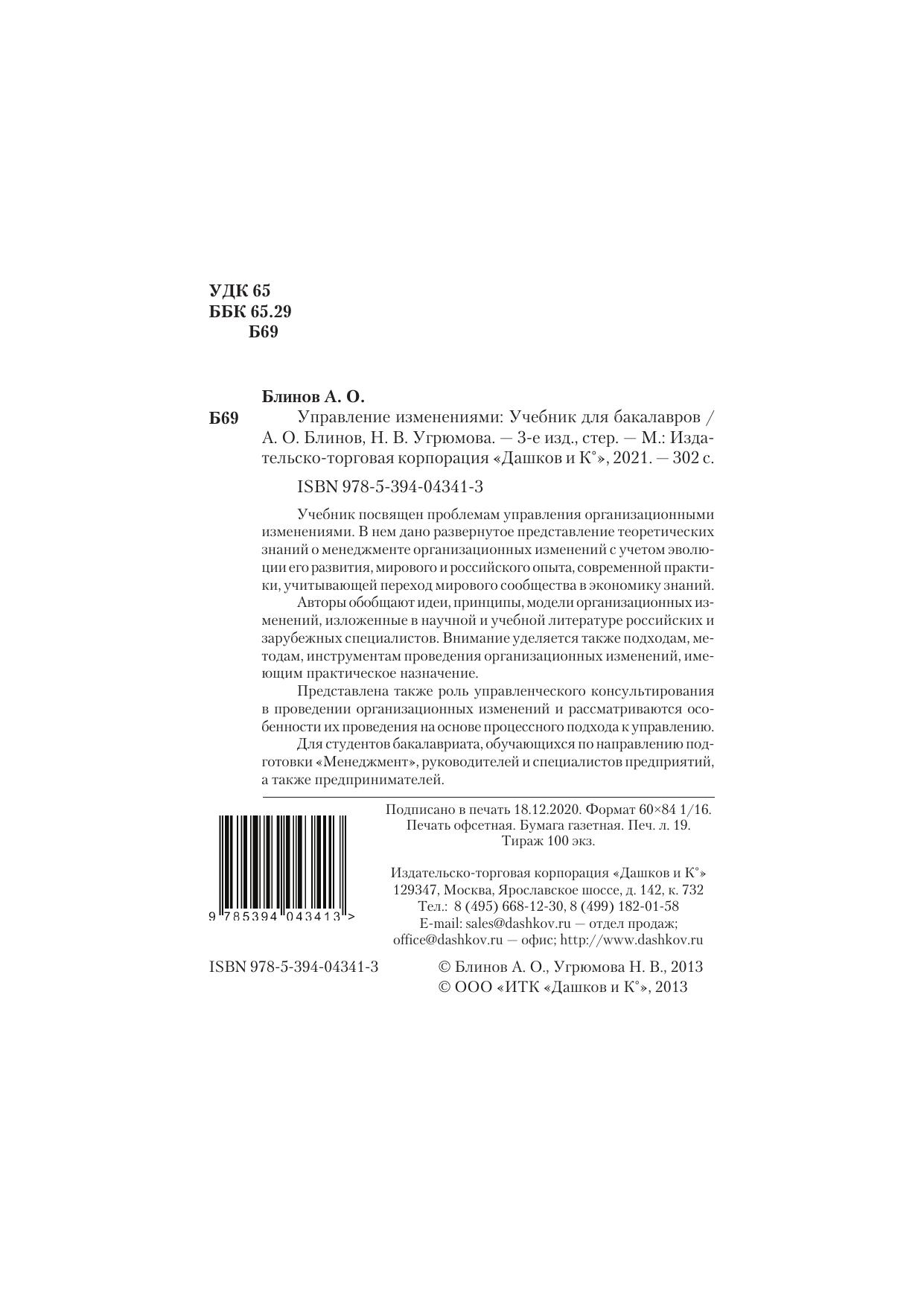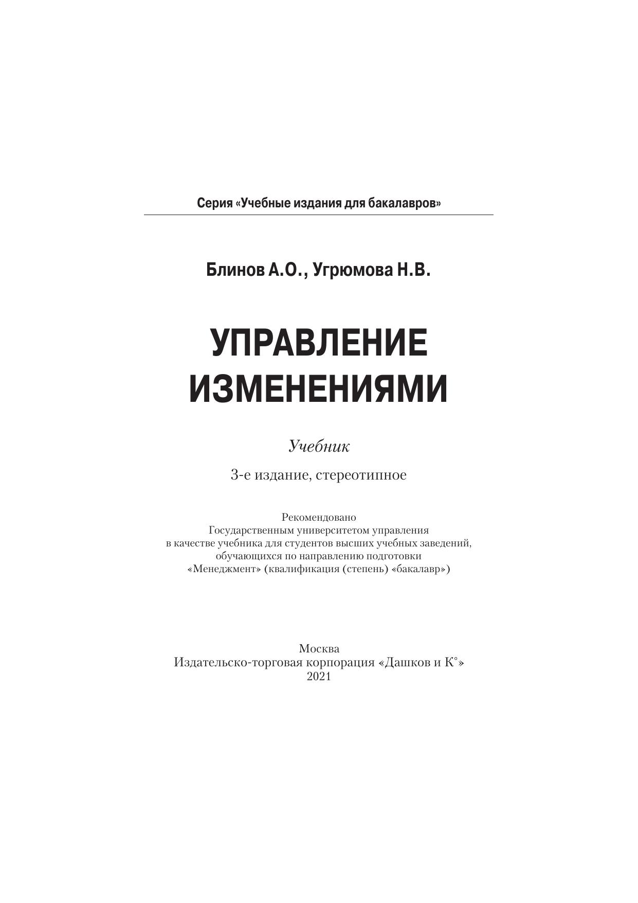 Учебник посвящен проблемам управления организационными изменениями. В нем дано развернутое представление теоретических знаний о менеджменте организационных изменений с учетом эволюции его развития, мирового и российского опыта, современной практики, учитывающей переход мирового сообщества в экономику знаний. Авторы обобщают идеи, принципы, модели организационных изменений, изложенные в научной и учебной литературе российских и зарубежных специалистов. Внимание уделяется также подходам, методам, инструментам проведения организационных изменений, имеющим практическое назначение. Представлена также роль управленческого консультирования в проведении организационных изменений и рассматриваются особенности их проведения на основе процессного подхода к управлению. Для студентов бакалавриата, обучающихся по направлению подготовки "Менеджмент", руководителей и специалистов предприятий, а также предпринимателей. Гриф