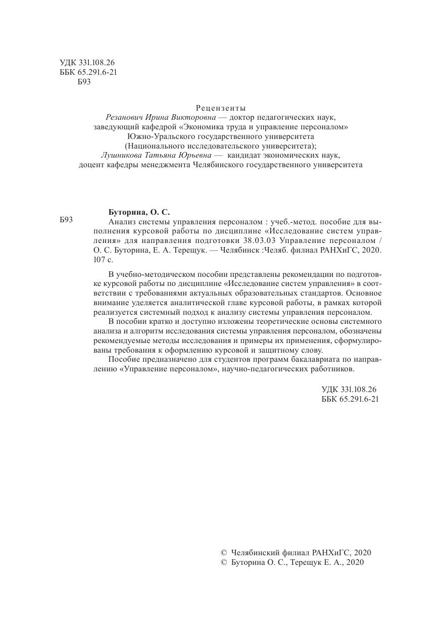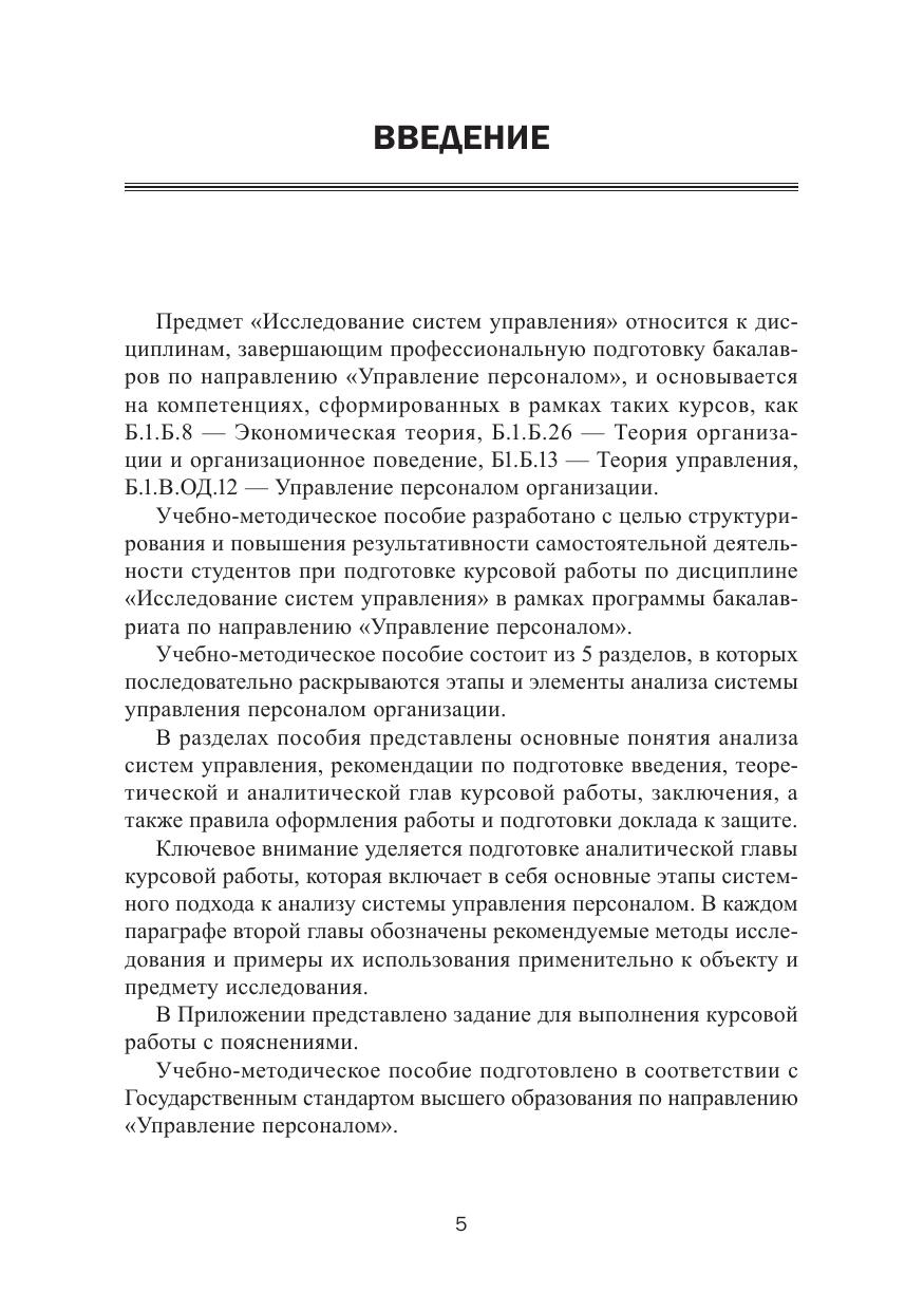 В учебно-методическом пособии представлены рекомендации по подготовке курсовой работы по дисциплине «Исследование систем управления» в соответствии с требованиями актуальных образовательных стандартов. Основное внимание уделяется аналитической главе курсовой работы, в рамках которой реализуется системный подход к анализу системы управления персоналом. В пособии кратко и доступно изложены теоретические основы системного анализа и алгоритм исследования системы управления персоналом, обозначены рекомендуемые методы исследования и примеры их применения, сформулированы требования к оформлению курсовой и защитному слову. Пособие предназначено для студентов программ бакалавриата по направлению «Управление персоналом», научно-педагогических работников.