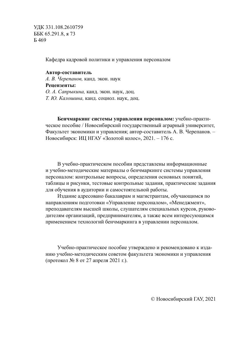 В учебно-практическом пособии представлены информационные и учебно-методические материалы о бенчмаркинге системы управления персоналом: контрольные вопросы, определения основных понятий, таблицы и рисунки, тестовые контрольные задания, практические задания для обучения в аудитории и самостоятельной работы. Издание адресовано бакалаврам и магистрантам, обучающимся по направлениям подготовки «Управление персоналом», «Менеджмент», преподавателям высшей школы, слушателям специальных курсов, руководителям организаций, предпринимателям, а также всем интересующимся применением технологий бенчмаркинга в управлении персоналом.