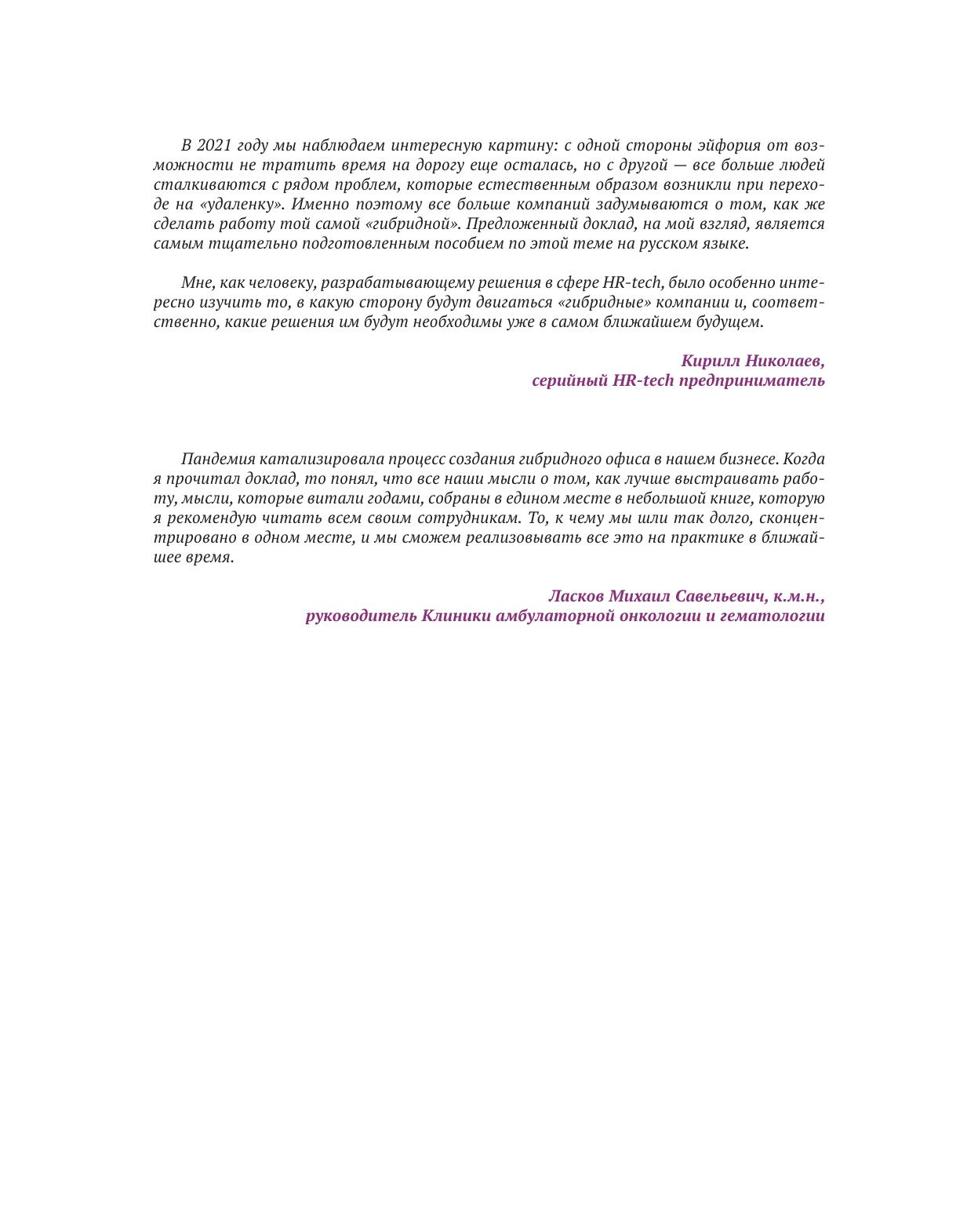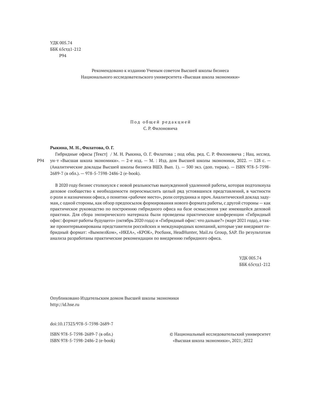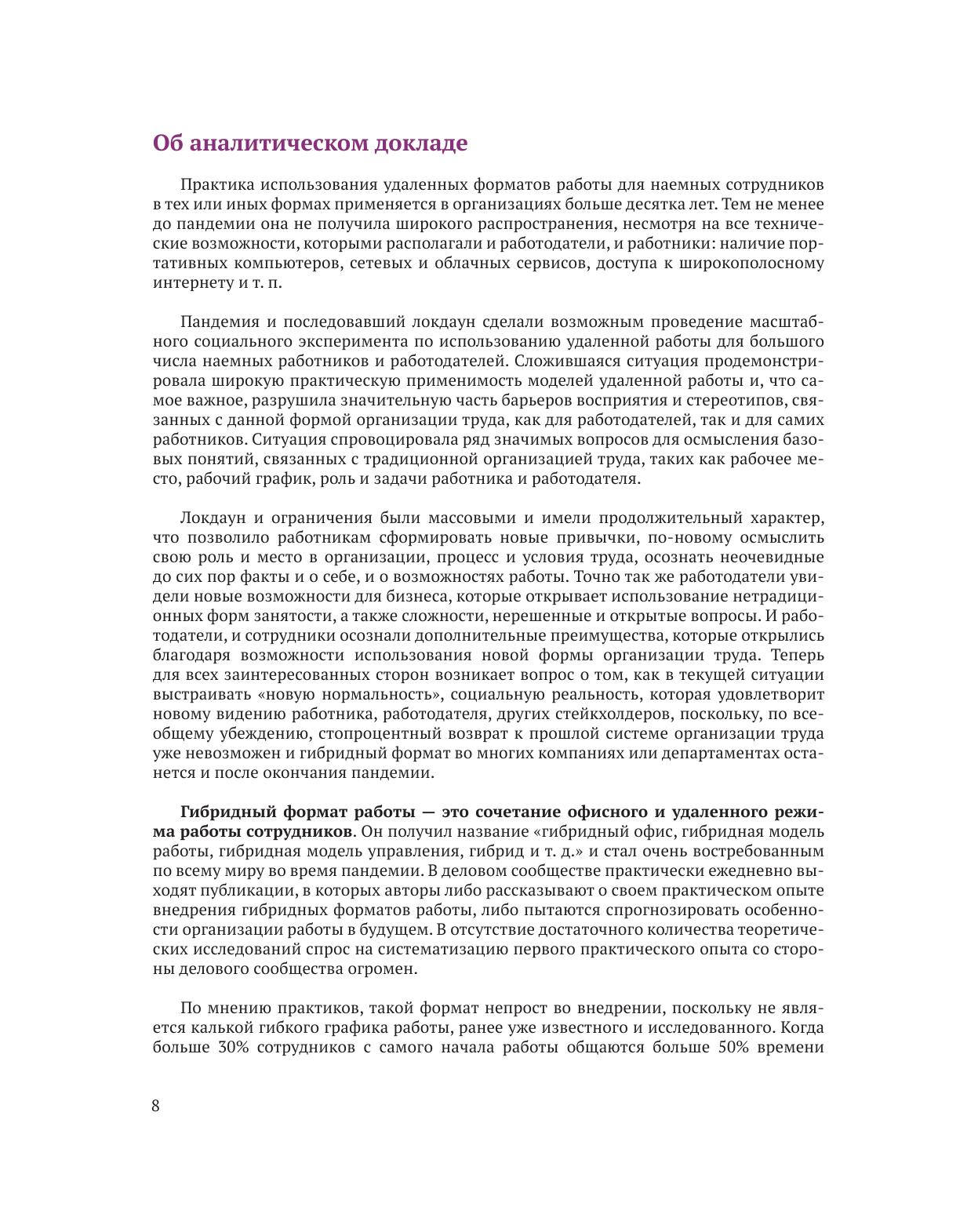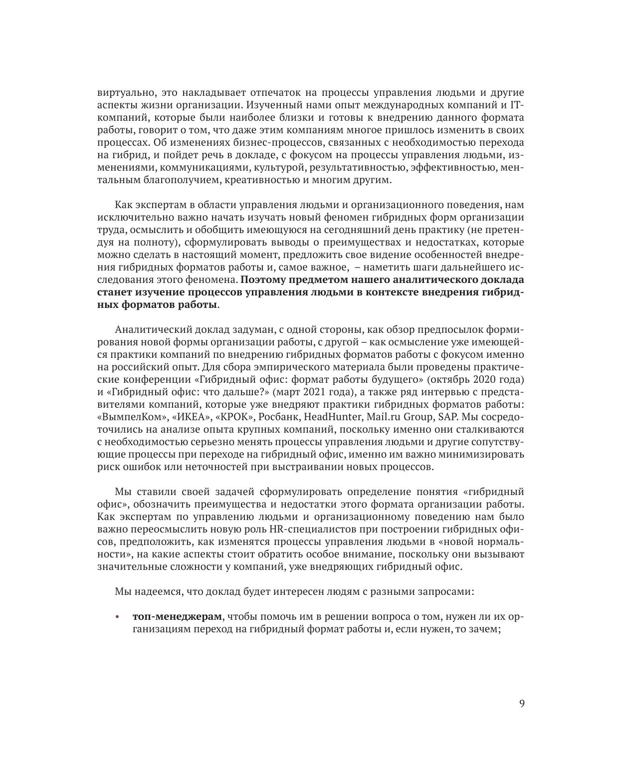 В 2020 году бизнес столкнулся с новой реальностью вынужденной удаленной работы, которая подтолкнула деловое сообщество к необходимости переосмыслить целый ряд устоявшихся представлений, в частности о роли и назначении офиса, о понятии "рабочее место", роли сотрудника и проч. Аналитический доклад задуман, с одной стороны, как обзор предпосылок формирования нового формата работы, с другой стороны — как практическое руководство по построению гибридного офиса на базе осмысления уже имеющейся деловой практики. Для сбора эмпирического материала были проведены практические конференции "Гибридный офис: формат работы будущего" (октябрь 2020 года) и "Гибридный офис: что дальше?" (март 2021 года), а также проинтервьюированы представители российских и международных компаний, которые уже внедряют гибридный формат: "ВымпелКом", "ИКЕА", "КРОК", Росбанк, HeadHunter, Mail.ru Group, SAP. По результатам анализа разработаны практические рекомендации по внедрению гибридного офиса.