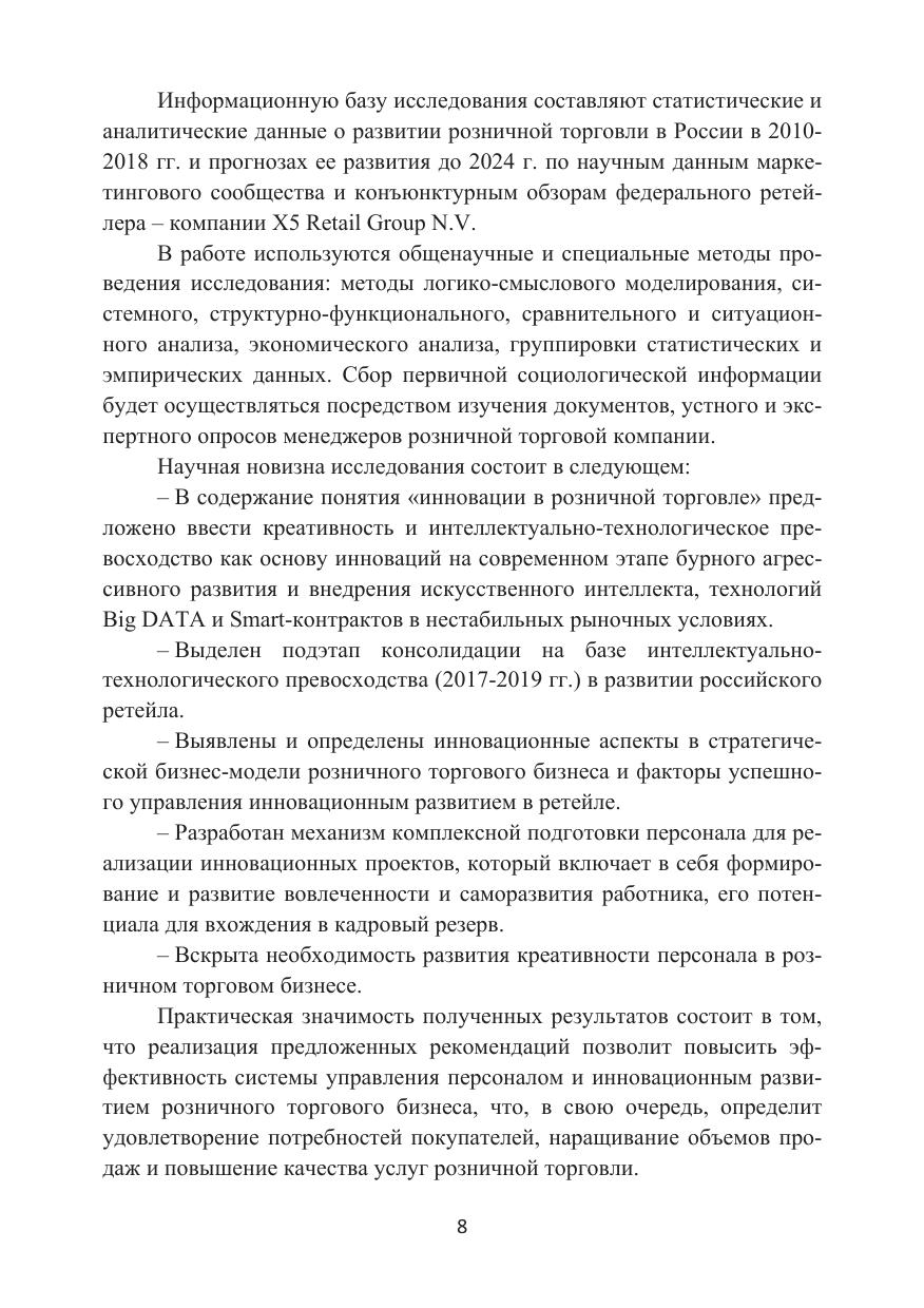 В монографии исследуется инновационная активность розничного торгового бизнеса: инновационные технологии, основные направления развития инноваций, механизм комплексной подготовки персонала к инновационному развитию, модель развития креативности управления и сотрудников.