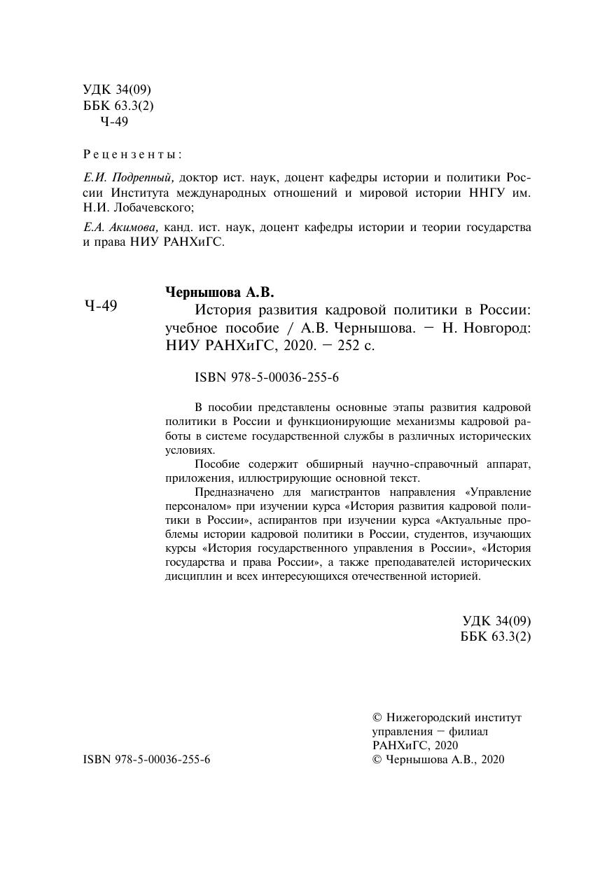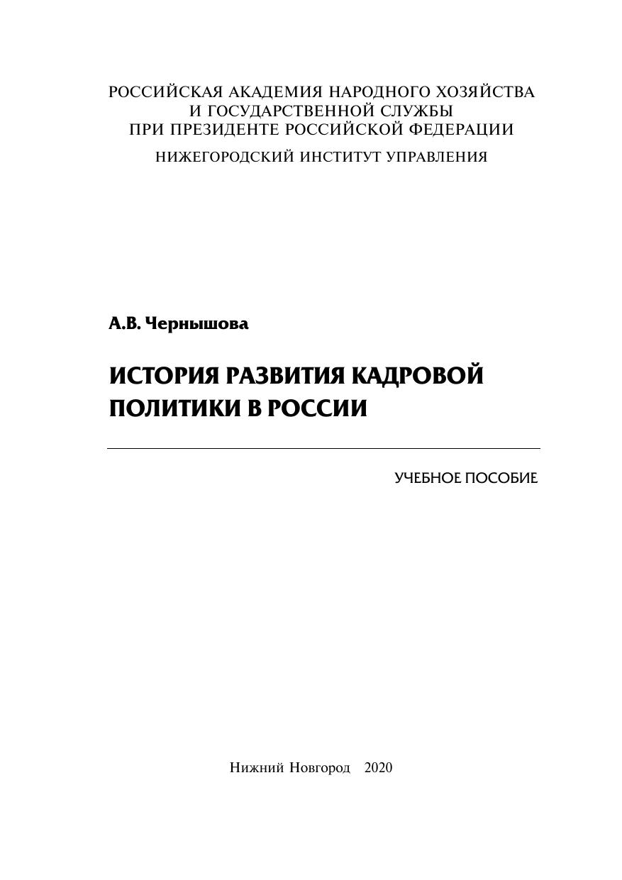 В пособии представлены основные этапы развития кадровой политики в России и функционирующие механизмы кадровой работы в системе государственной службы в различных исторических условиях. Пособие содержит обширный научно-справочный аппарат, приложения, иллюстрирующие основной текст. Предназначено для магистрантов направления «Управление персоналом» при изучении курса «История развития кадровой политики в России», аспирантов при изучении курса «Актуальные проблемы истории кадровой политики в России, студентов, изучающих курсы «История государственного управления в России», «История государства и права России», а также преподавателей исторических дисциплин и всех интересующихся отечественной историей.