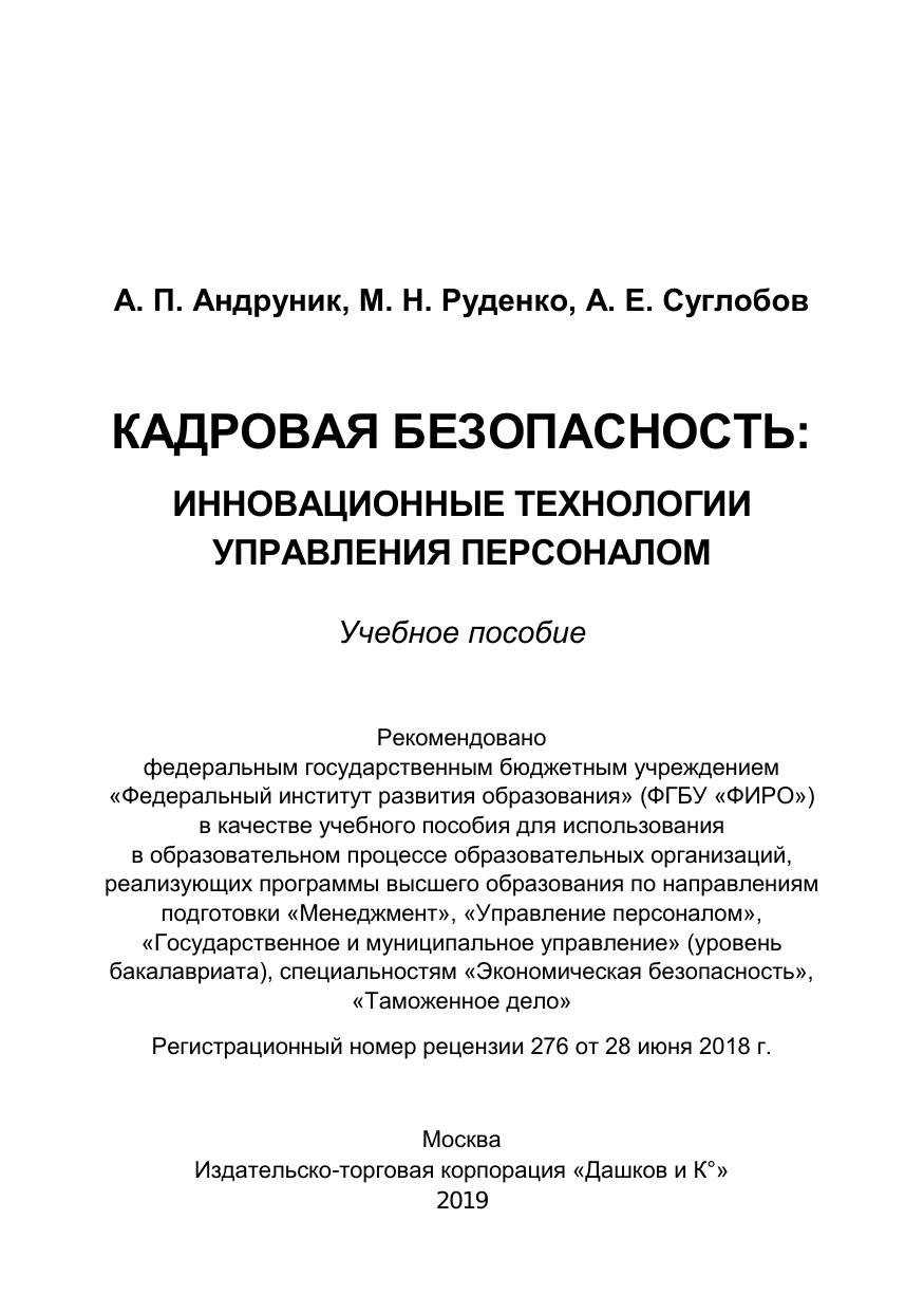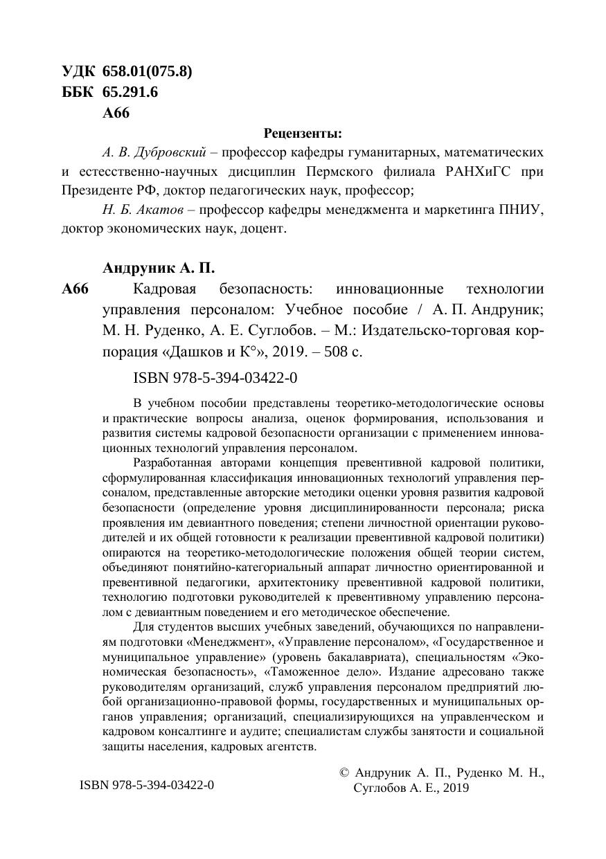 В учебном пособии представлены теоретико-методологические основы и практические вопросы анализа, оценок формирования, использования и развития системы кадровой безопасности организации с применением инновационных технологий управления персоналом. Разработанная авторами концепция превентивной кадровой политики, сформулированная классификация инновационных технологий управления персоналом, представленные авторские методики оценки уровня развития кадровой безопасности (определение уровня дисциплинированности персонала; риска проявления им девиантного поведения; степени личностной ориентации руководителей и их общей готовности к реализации превентивной кадровой политики) опираются на теоретико-методологические положения общей теории систем, объединяют понятийно-категориальный аппарат личностно ориентированной и превентивной педагогики, архитектонику превентивной кадровой политики, технологию подготовки руководителей к превентивному управлению персоналом с девиантным поведением и его методическое обеспечение. Для студентов высших учебных заведений, обучающихся по направлениям подготовки «Менеджмент», «Управление персоналом», «Государственное и муниципальное управление» (уровень бакалавриата), специальностям «Экономическая безопасность», «Таможенное дело». Издание адресовано также руководителям организаций, служб управления персоналом предприятий любой организационно-правовой формы, государственных и муниципальных органов управления; организаций, специализирующихся на управленческом и кадровом консалтинге и аудите; специалистам службы занятости и социальной защиты населения, кадровых агентств.