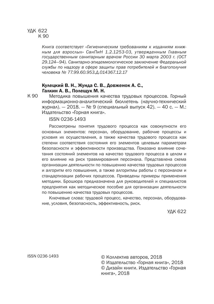 Методика повышения качества трудовых процессов. Горный информационно-аналитический бюллетень (научно-технический журнал). № 9