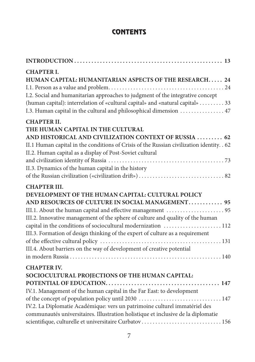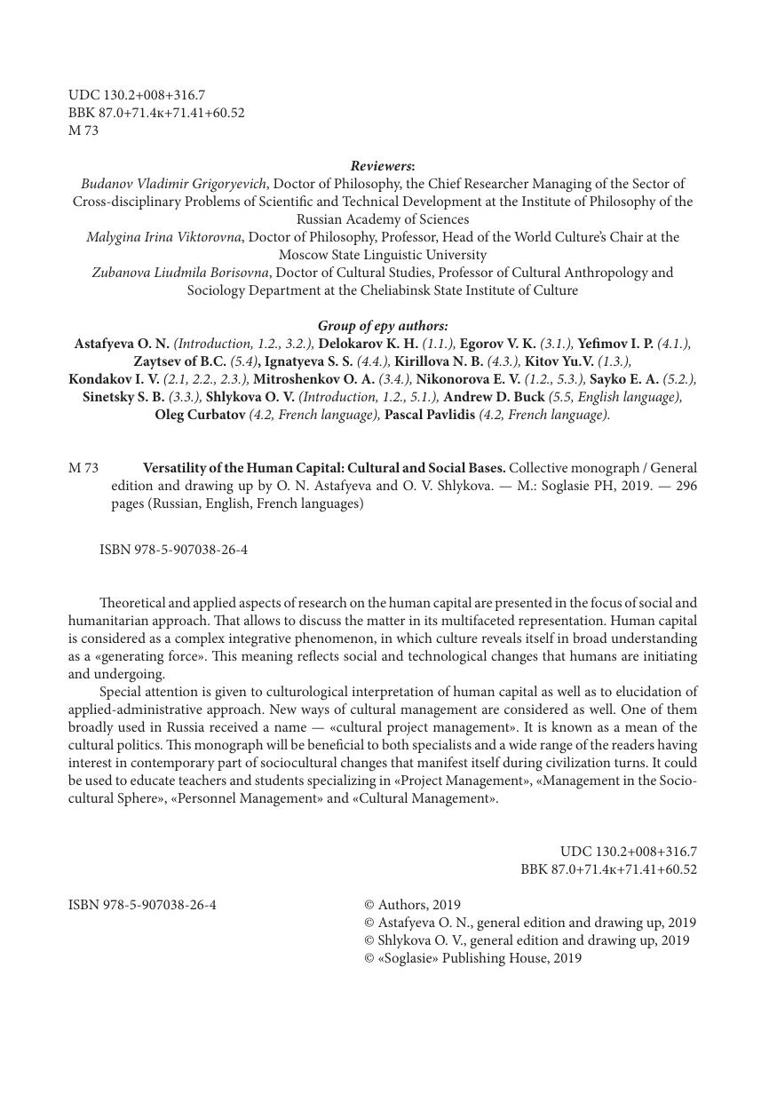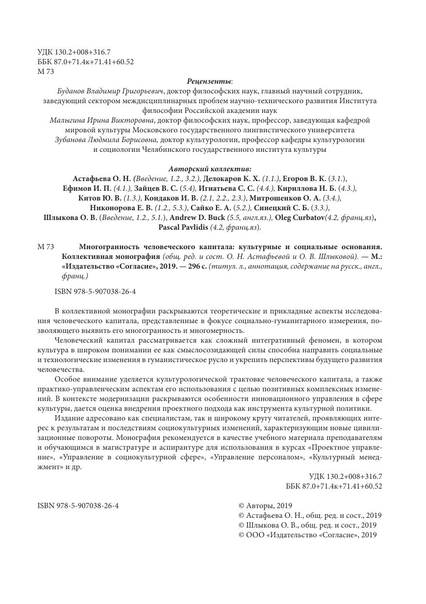 В коллективной монографии раскрываются теоретические и прикладные аспекты исследования человеческого капитала, представленные в фокусе социально-гуманитарного измерения, позволяющего выявить его многогранность и многомерность. Человеческий капитал рассматривается как сложный интегративный феномен, в котором культура в широком понимании ее как смыслосозидающей силы способна направить социальные и технологические изменения в гуманистическое русло и укрепить перспективы будущего развития человечества. Особое внимание уделяется культурологической трактовке человеческого капитала, а также практико-управленческим аспектам его использования с целью позитивных комплексных изменений. В контексте модернизации раскрываются особенности инновационного управления в сфере культуры, дается оценка внедрения проектного подхода как инструмента культурной политики. Издание адресовано как специалистам, так и широкому кругу читателей, проявляющих интерес к результатам и последствиям социокультурных изменений, характеризующим новые цивилизационные повороты. Монография рекомендуется в качестве учебного материала преподавателям и обучающимся в магистратуре и аспирантуре для использования в курсах «Проектное управление», «Управление в социокультурной сфере», «Управление персоналом», «Культурный менеджмент» и др.