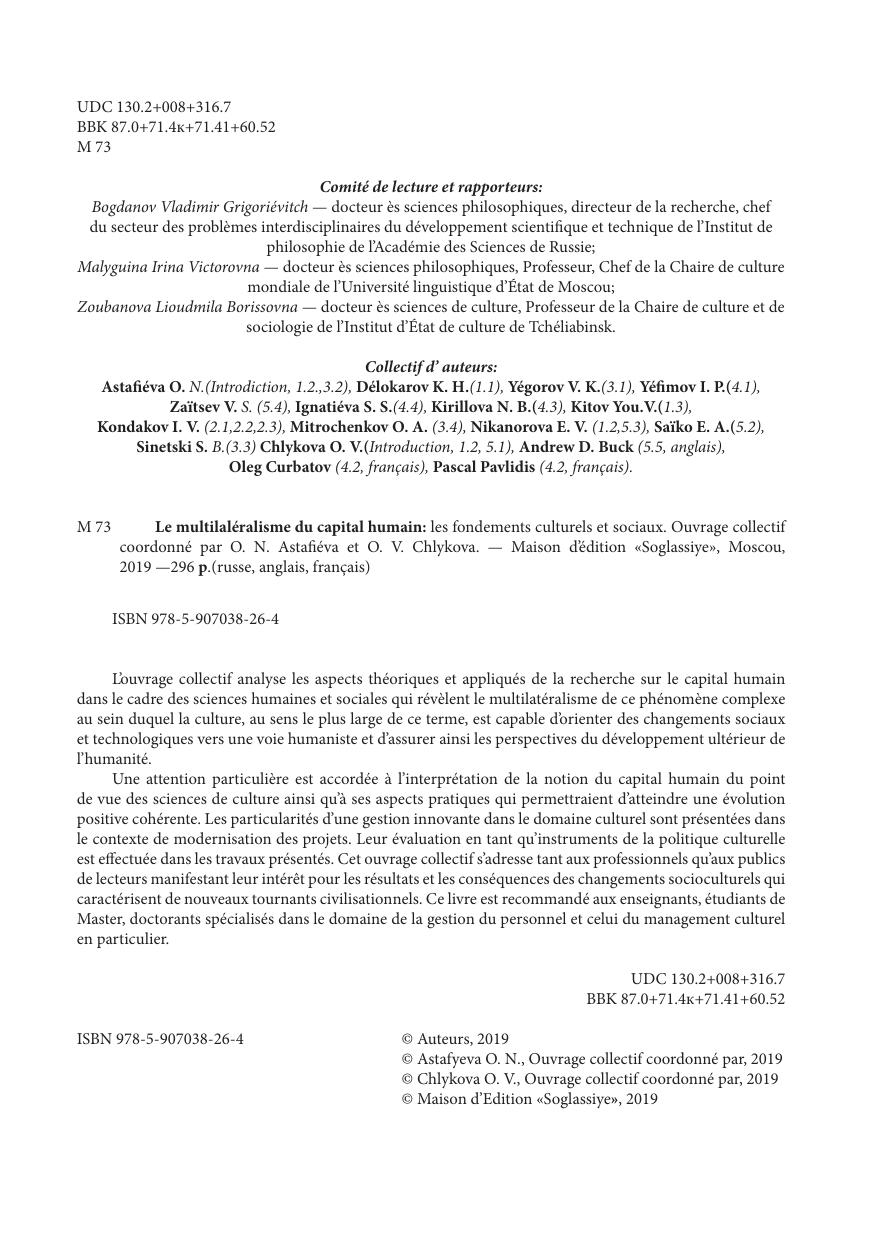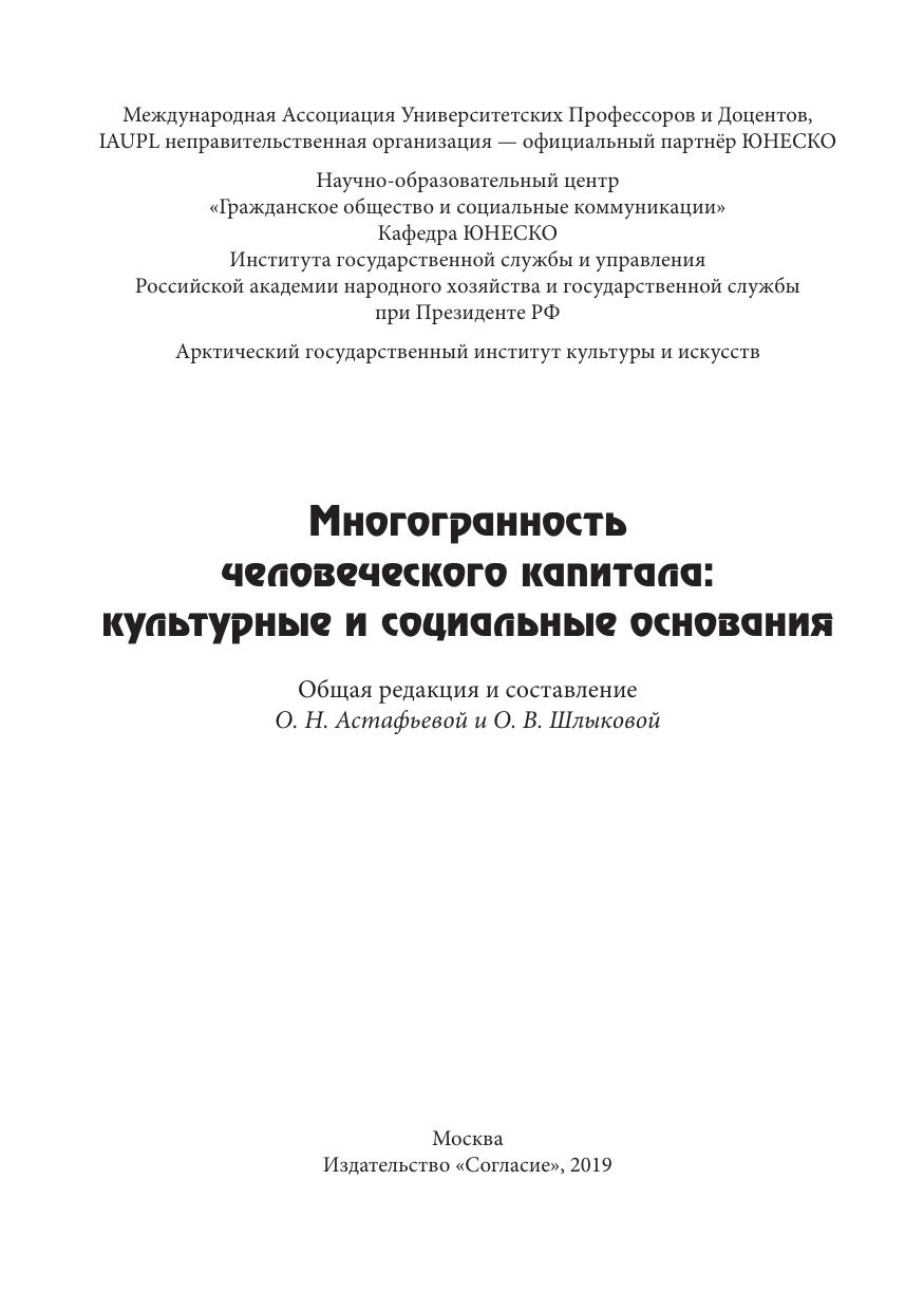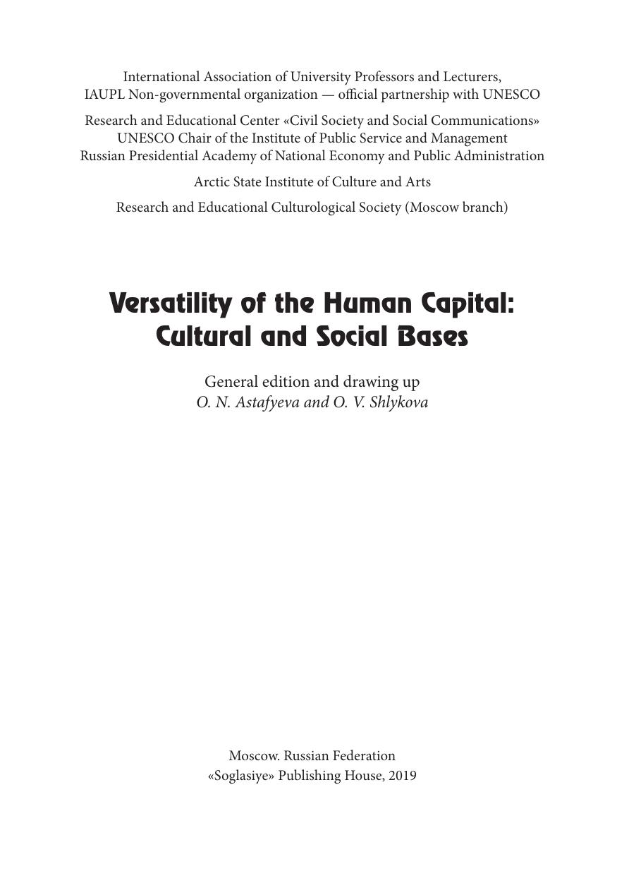 В коллективной монографии раскрываются теоретические и прикладные аспекты исследования человеческого капитала, представленные в фокусе социально-гуманитарного измерения, позволяющего выявить его многогранность и многомерность. Человеческий капитал рассматривается как сложный интегративный феномен, в котором культура в широком понимании ее как смыслосозидающей силы способна направить социальные и технологические изменения в гуманистическое русло и укрепить перспективы будущего развития человечества. Особое внимание уделяется культурологической трактовке человеческого капитала, а также практико-управленческим аспектам его использования с целью позитивных комплексных изменений. В контексте модернизации раскрываются особенности инновационного управления в сфере культуры, дается оценка внедрения проектного подхода как инструмента культурной политики. Издание адресовано как специалистам, так и широкому кругу читателей, проявляющих интерес к результатам и последствиям социокультурных изменений, характеризующим новые цивилизационные повороты. Монография рекомендуется в качестве учебного материала преподавателям и обучающимся в магистратуре и аспирантуре для использования в курсах «Проектное управление», «Управление в социокультурной сфере», «Управление персоналом», «Культурный менеджмент» и др.