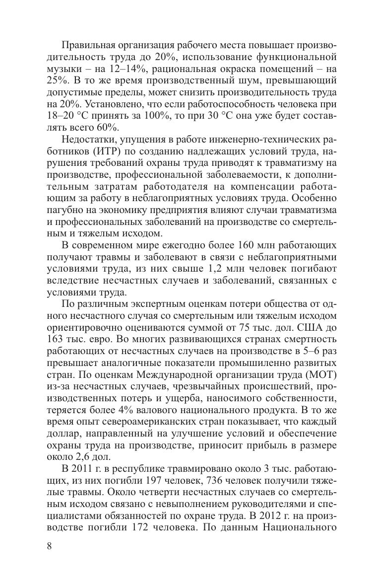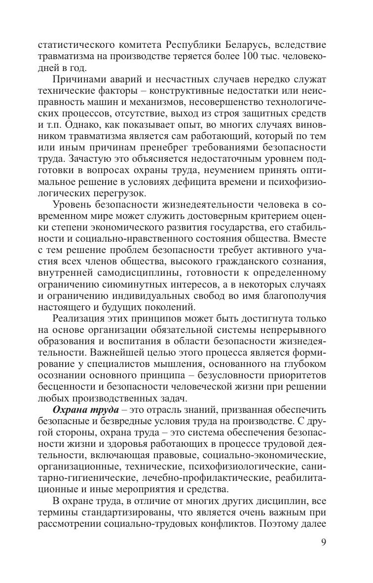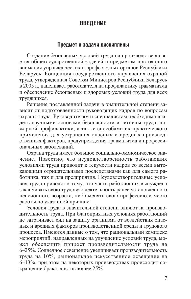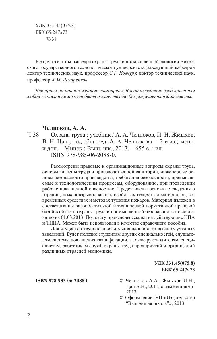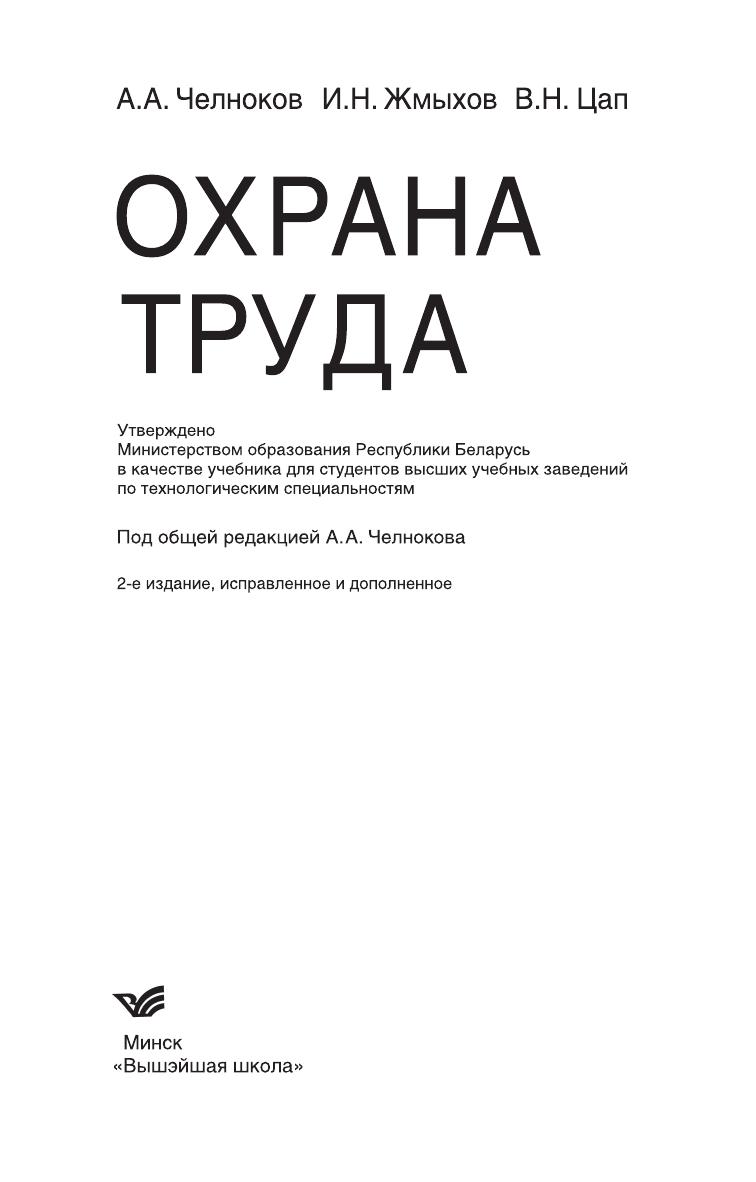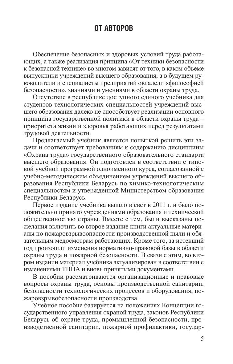 Рассмотрены правовые и организационные вопросы охраны труда, основы гигиены труда и производственной санитарии, инженерные основы безопасности производства. Рассмотрены требования безопасности, предъявляемые к технологическим процессам, оборудованию, при проведении работ с повышенной опасностью. Представлены основные сведения о горении, пожаровзрывоопасных свойствах веществ и материалов, современных средствах и методах тушения пожаров. Материал изложен в соответствии с законодательными и техническими нормативными правовыми актами в области охраны труда и промышленной безопасности по состоянию на 01.03.2013 г. По тексту приведены ссылки на действующие НПА и ТНПА. Может быть использован в качестве справочного пособия. Для студентов технологических специальностей высших учебных заведений. Будет полезен студентам других специальностей, слушателям системы повышения квалификации, а также руководителям, специалистам.