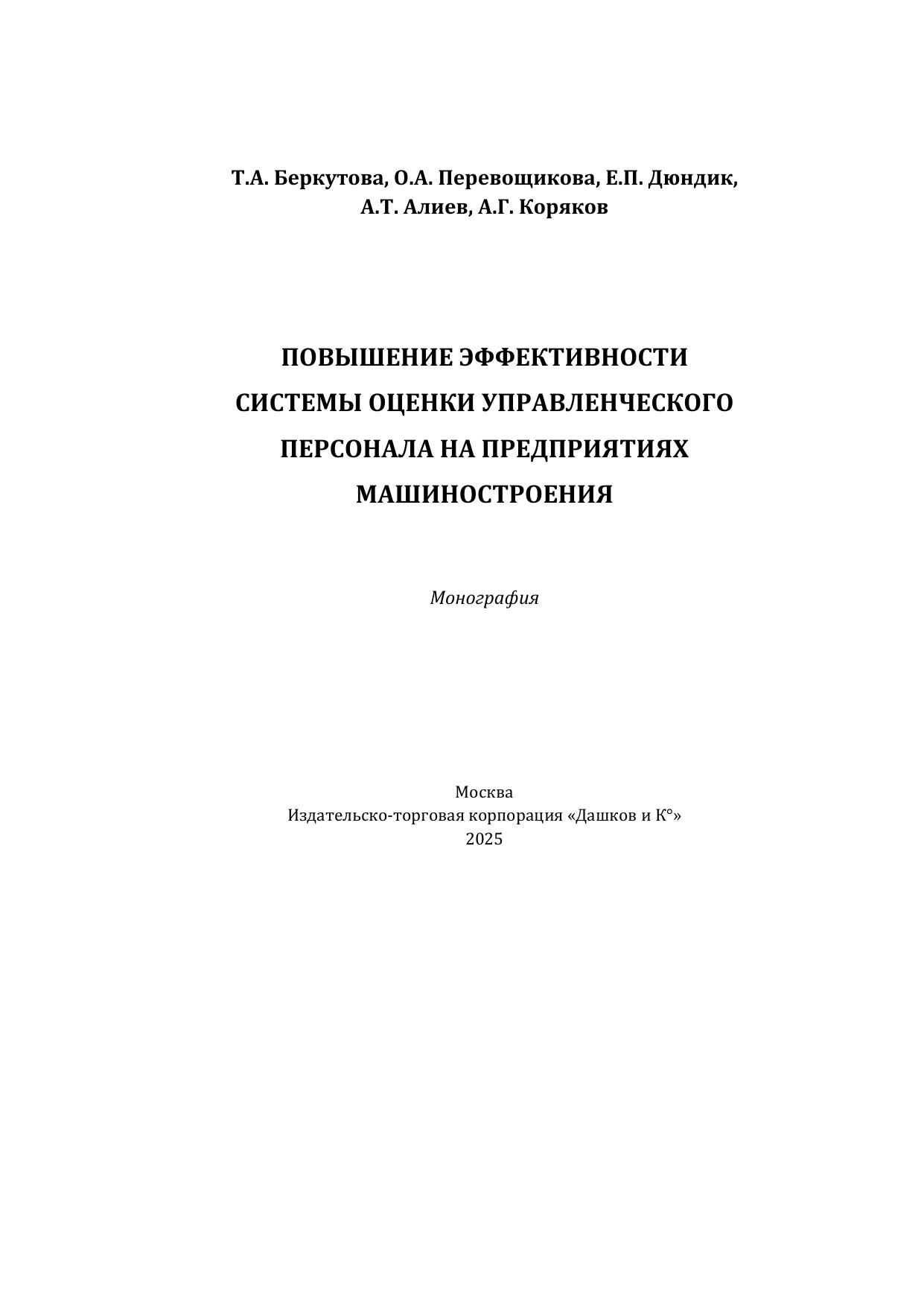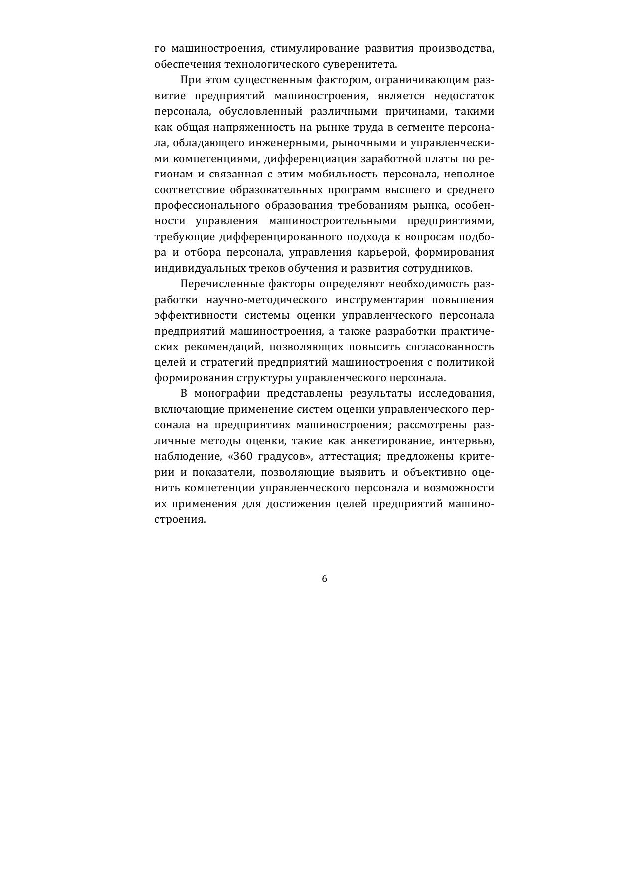 Работа посвящена обоснованию методического аппарата для проведения оценки управленческого персонала на предприятиях машиностроения. В монографии проведен анализ систем, методов и методик оценки управленческого персонала, рассмотрены условия их применения. На основании результатов теоретического анализа предложена уточненная методика оценки управленческого персонала по методу «360 градусов», адаптированная к условиям функционирования предприятий машиностроения, представлены практические примеры использования методики, а также полученные в ходе оценки выводы и рекомендации. Монография рассчитана на руководителей и специалистов по управлению персоналом различных типов организаций машиностроения.