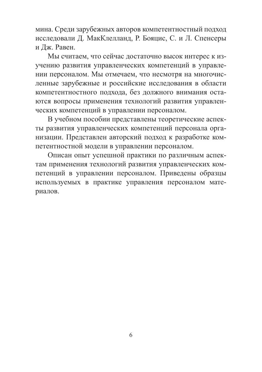 В учебном пособии представлены теоретические аспекты развития управленческих компетенций персонала организации. Представлен авторский подход к разработке компетентностной модели в управлении персоналом. Описан опыт успешной практики по различным аспектам применения технологий развития управленческих компетенций в управлении персоналом. Приведены образцы используемых в практике управления персоналом материалов. Учебное пособие может быть интересно научным работникам, занимающимся исследованиями по данной проблеме, преподавателям. Данное издание может быть полезно аспирантам, магистрантам, студентам бакалаврам, осваивающим образовательные программы по управлению персоналом. Учебное пособие может представлять интерес для руководителей и специалистов в области кадрового менеджмента, интересующихся проблемами развития управленческих компетенций в управлении персоналом.