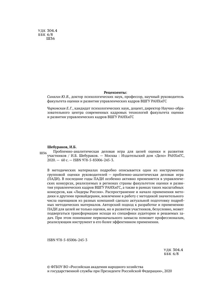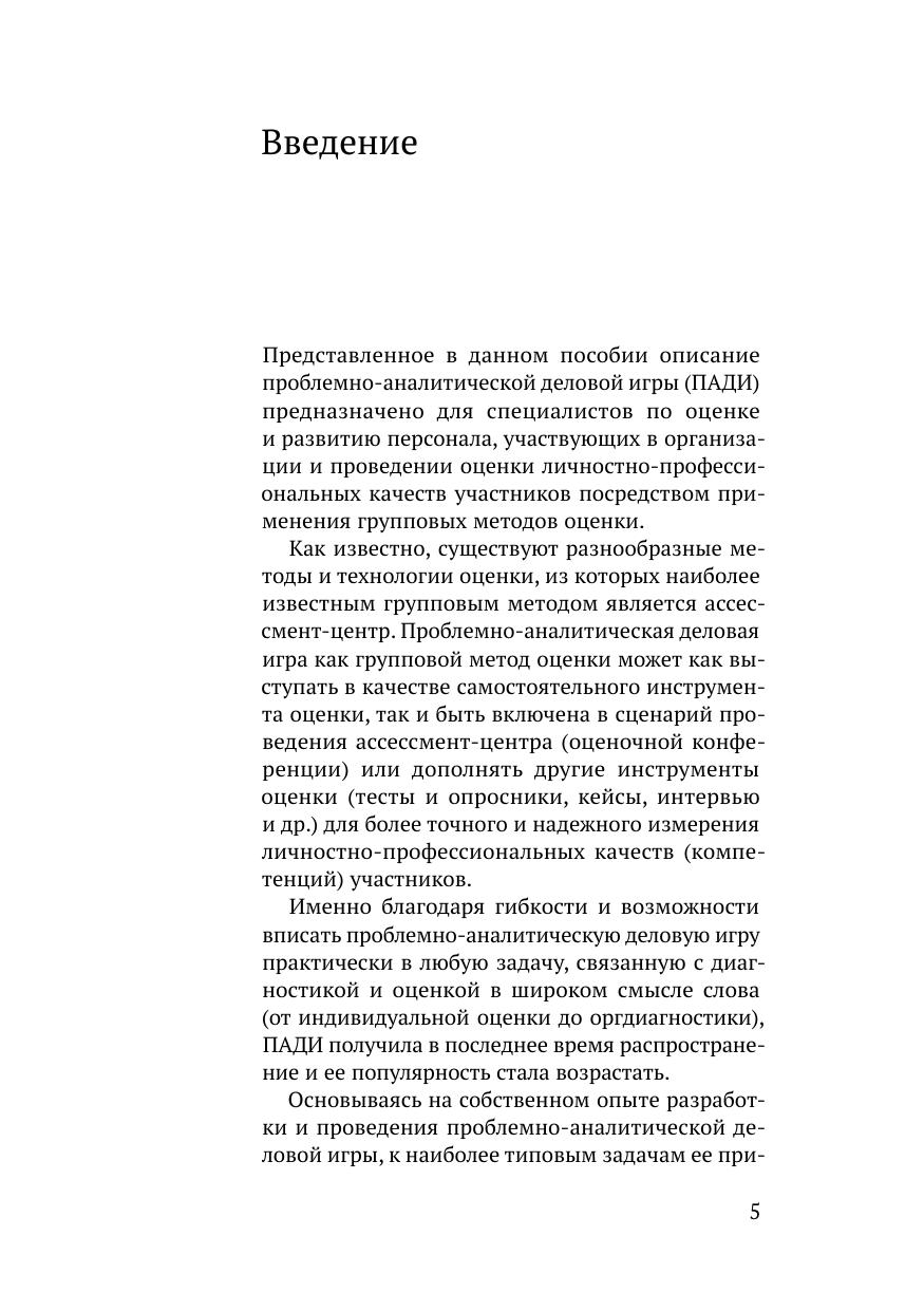В методических материалах подробно описывается один из инструментов групповой оценки руководителей — проблемно-аналитическая деловая игра (ПАДИ). В последние годы ПАДИ особенно активно применяется в управленческих конкурсах, реализуемых в регионах страны факультетом оценки и развития управленческих кадров ВШГУ РАНХиГС, а также в рамках таких масштабных конкурсов, как «Лидеры России». Распространение и начало применения методики и другими провайдерами, вовлечение в работу с методикой значительного числа оценщиков из разных компаний сделало актуальной подготовку подробных методических материалов. Авторский подход к разработке и применению ПАДИ для целей не только оценки, но и развития участников, безусловно, может подвергаться трансформации исходя из специфики аудитории и решаемых задач. При этом понимание первоначального замысла поможет профессионалам, реализующим инструмент в его более эффективном применении.