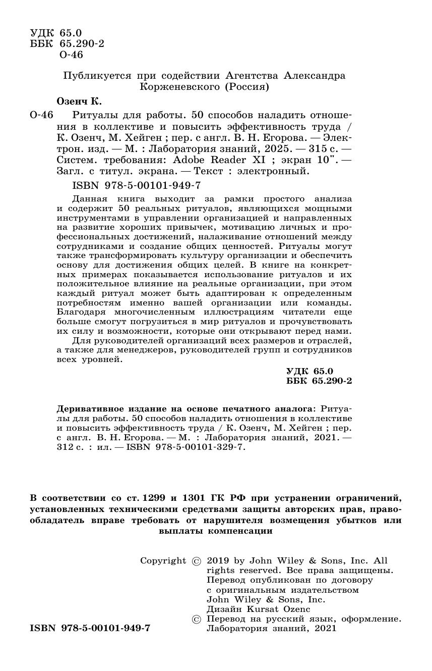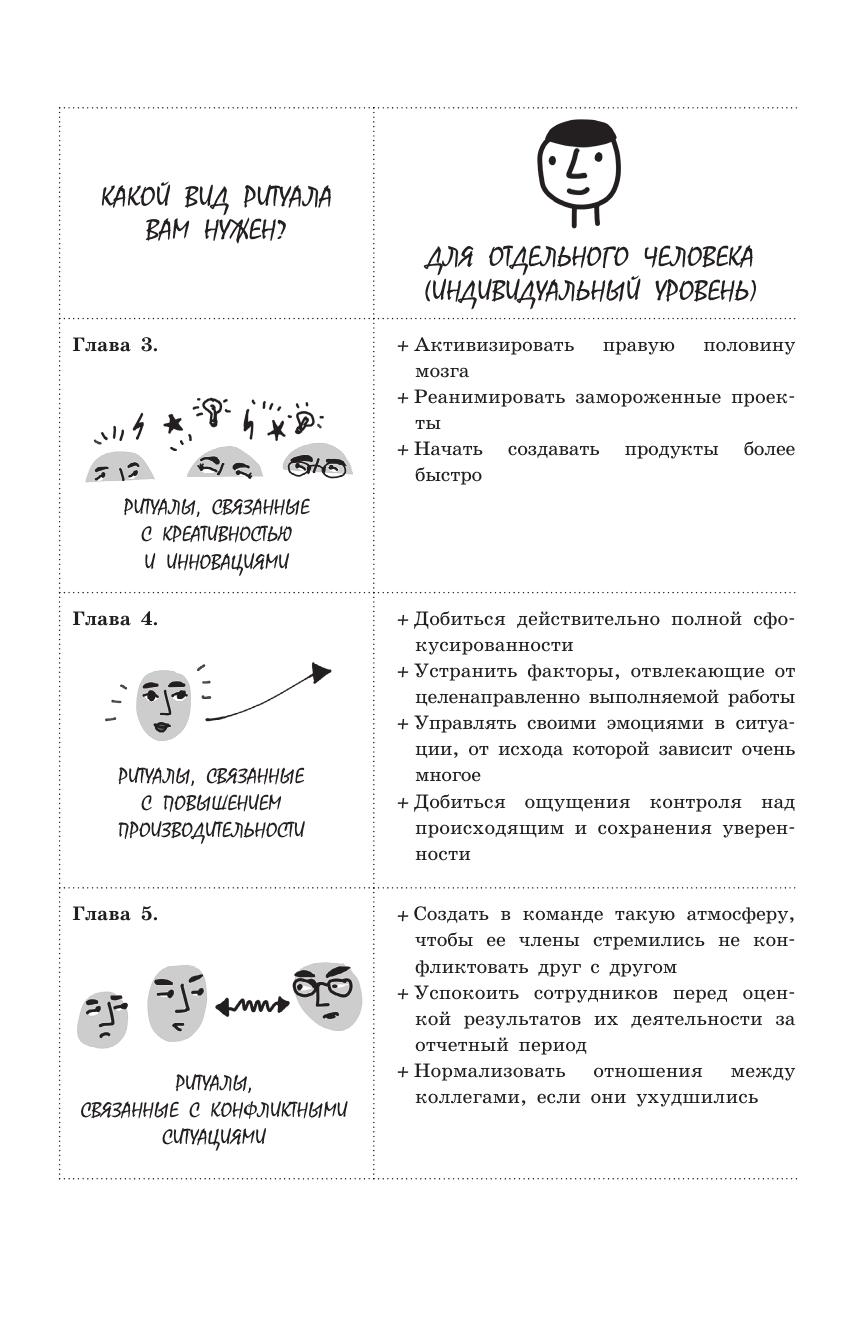 Данная книга выходит за рамки простого анализа и содержит 50 реальных ритуалов, являющихся мощными инструментами в управлении организацией и направленных на развитие хороших привычек, мотивацию личных и профессиональных достижений, налаживание отношений между сотрудниками и создание общих ценностей. Ритуалы могут также трансформировать культуру организации и обеспечить основу для достижения общих целей. В книге на конкретных примерах показывается использование ритуалов и их положительное влияние на реальные организации, при этом каждый ритуал может быть адаптирован к определенным потребностям именно вашей организации или команды. Благодаря многочисленным иллюстрациям читатели еще больше смогут погрузиться в мир ритуалов и прочувствовать их силу и возможности, которые они открывают перед нами. Для руководителей организаций всех размеров и отраслей, а также для менеджеров, руководителей групп и сотрудников всех уровней.