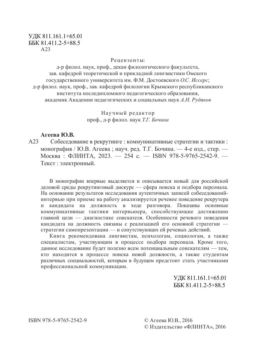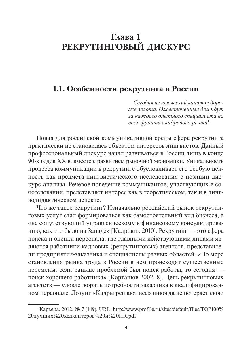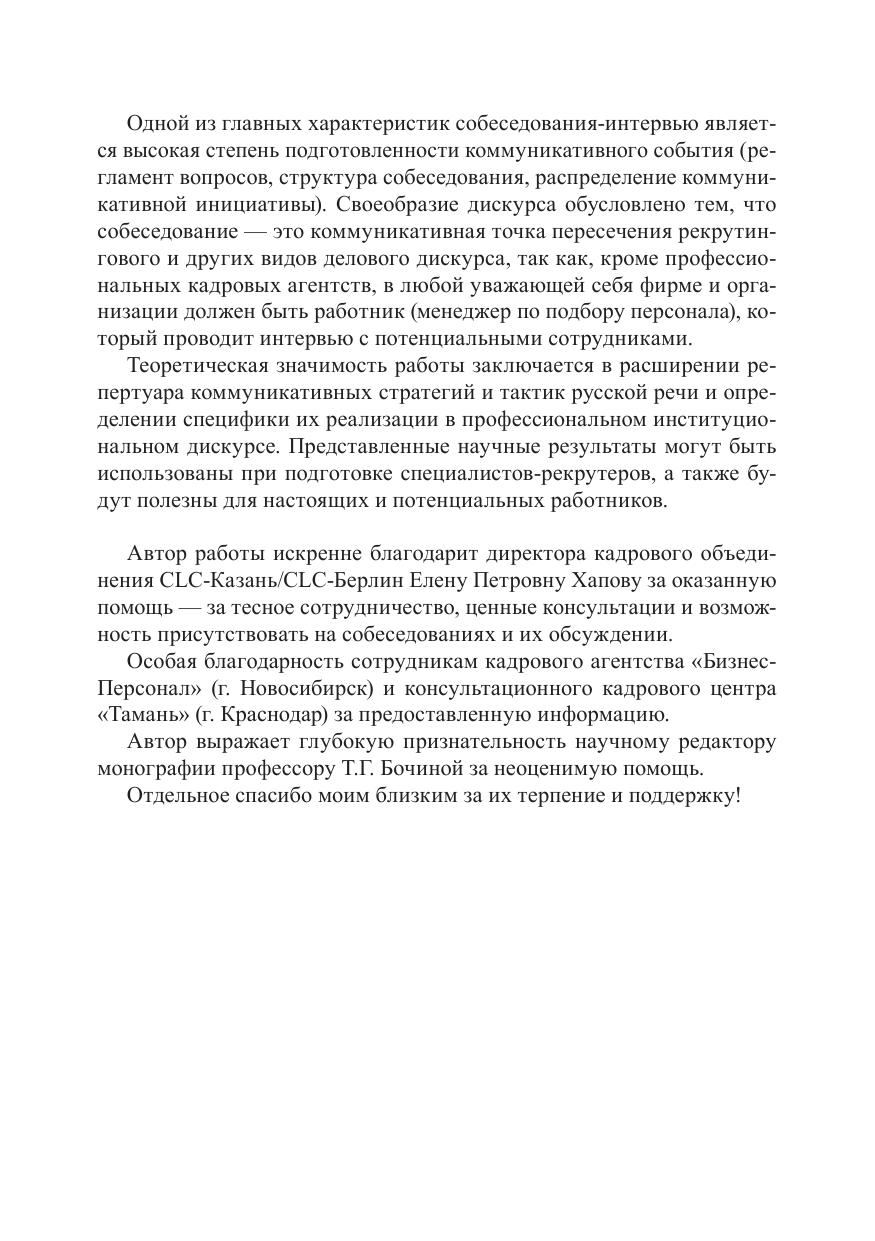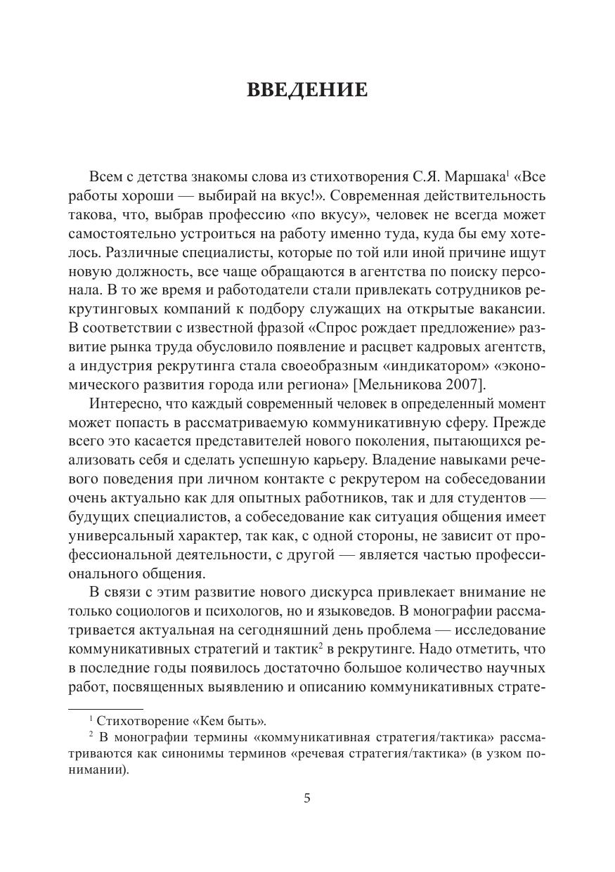 В монографии впервые выделяется и описывается новый для российской деловой среды рекрутинговый дискурс — сфера поиска и подбора персонала. На основании результатов исследования аутентичных записей собеседованийинтервью при приеме на работу анализируется речевое поведение рекрутера и кандидата на должность в ходе разговора. Показаны основные коммуникативные тактики интервьюера, способствующие достижению главной цели — диагностике соискателя. Особенности речевого поведения кандидата на должность связаны с реализацией его основной стратегии — стратегии самопрезентации — и сопутствующих ей речевых действий. Книга рекомендована лингвистам, психологам, социологам, а также специалистам, участвующим в процессе подбора персонала. Кроме того, данное исследование будет полезно всем потенциальным соискателям — тем, кто находится в процессе поиска новой должности, а также студентам различных специальностей, которым в будущем предстоит стать участниками профессиональной коммуникации.