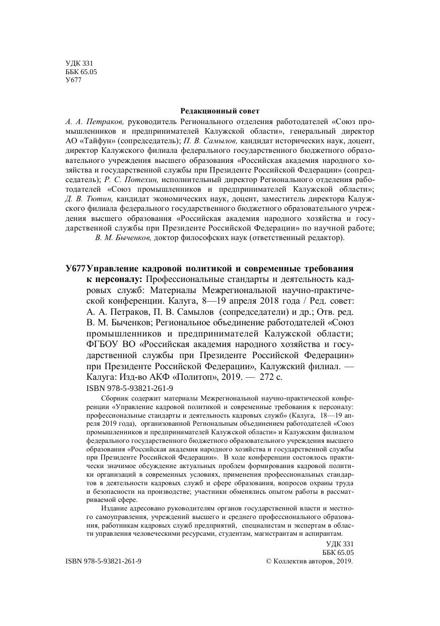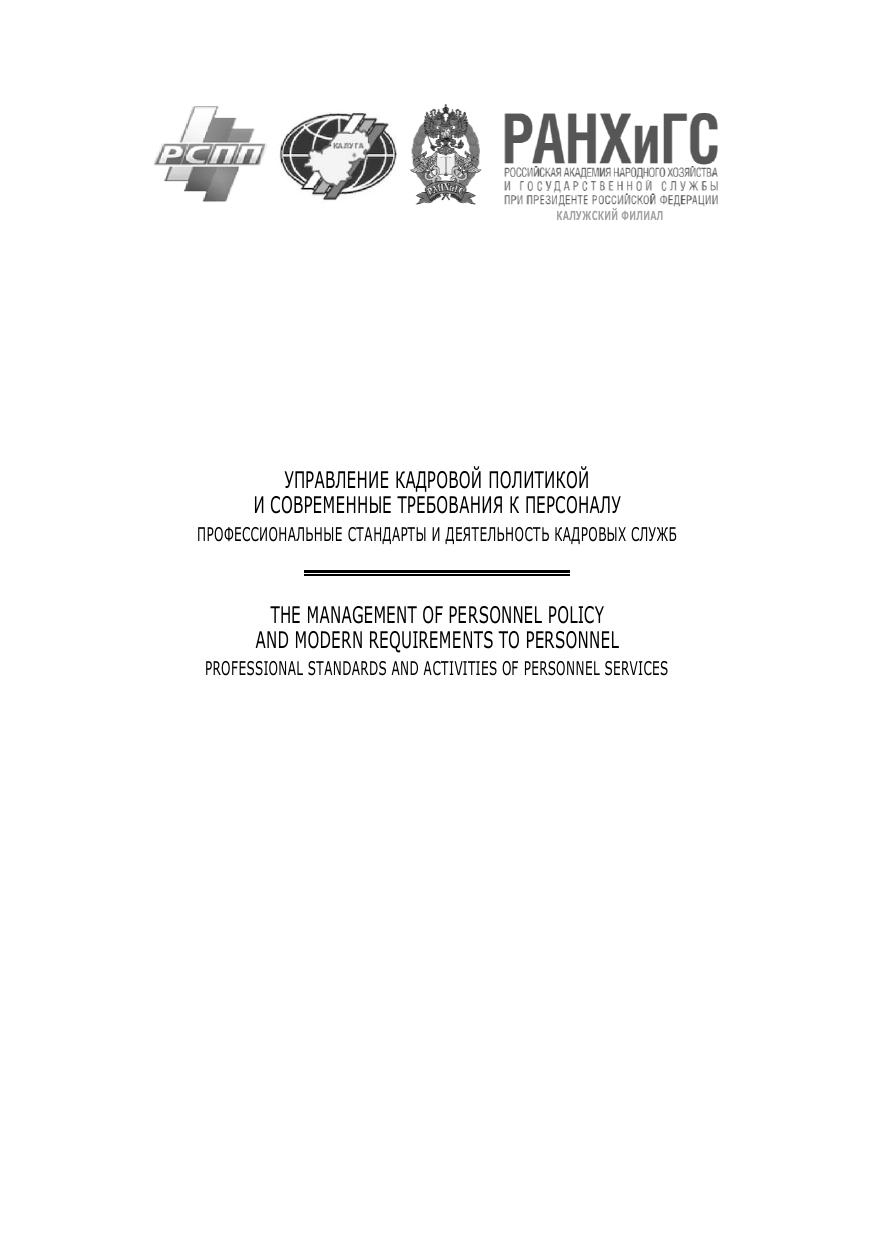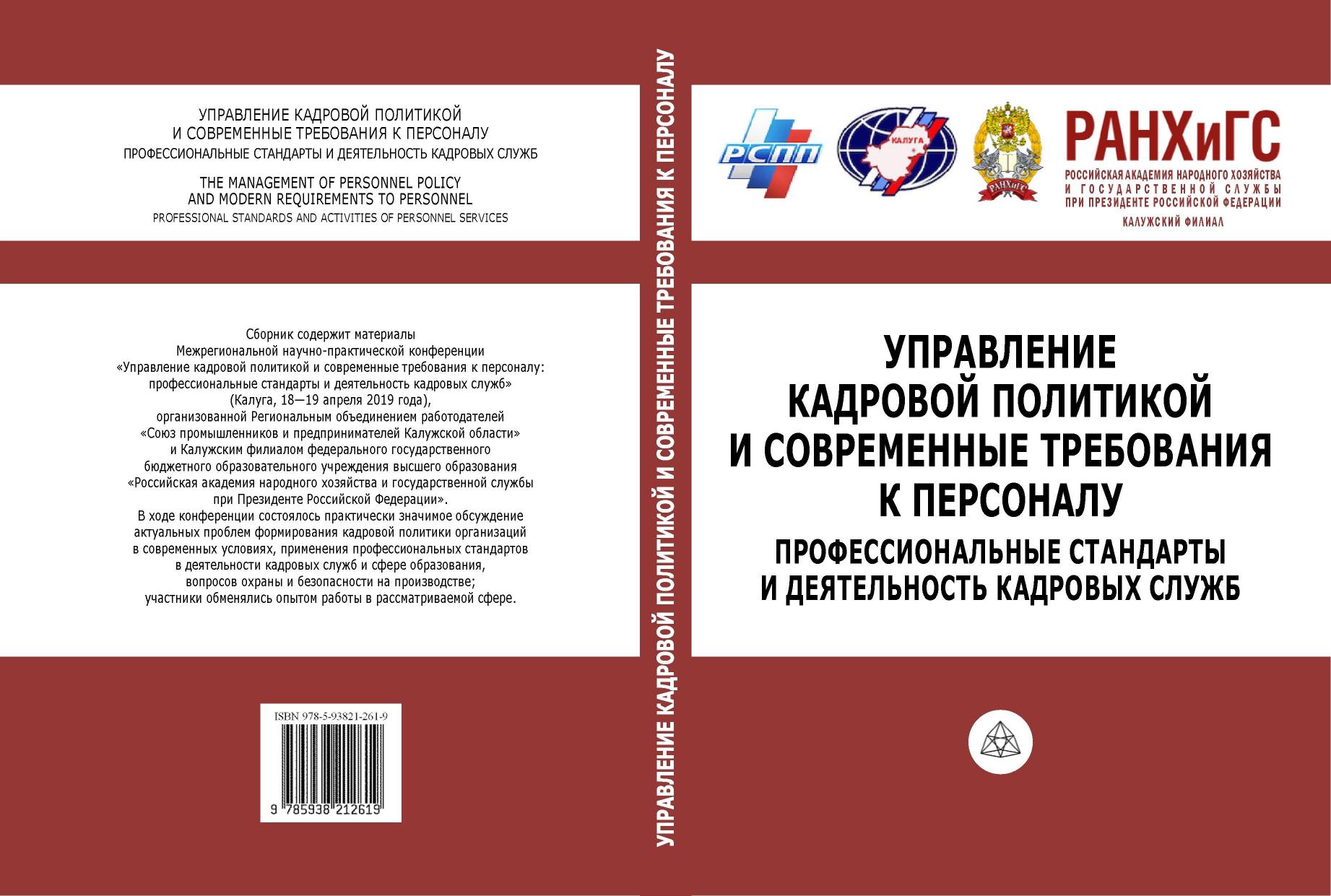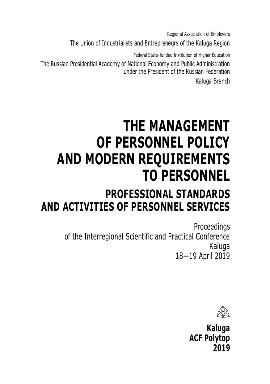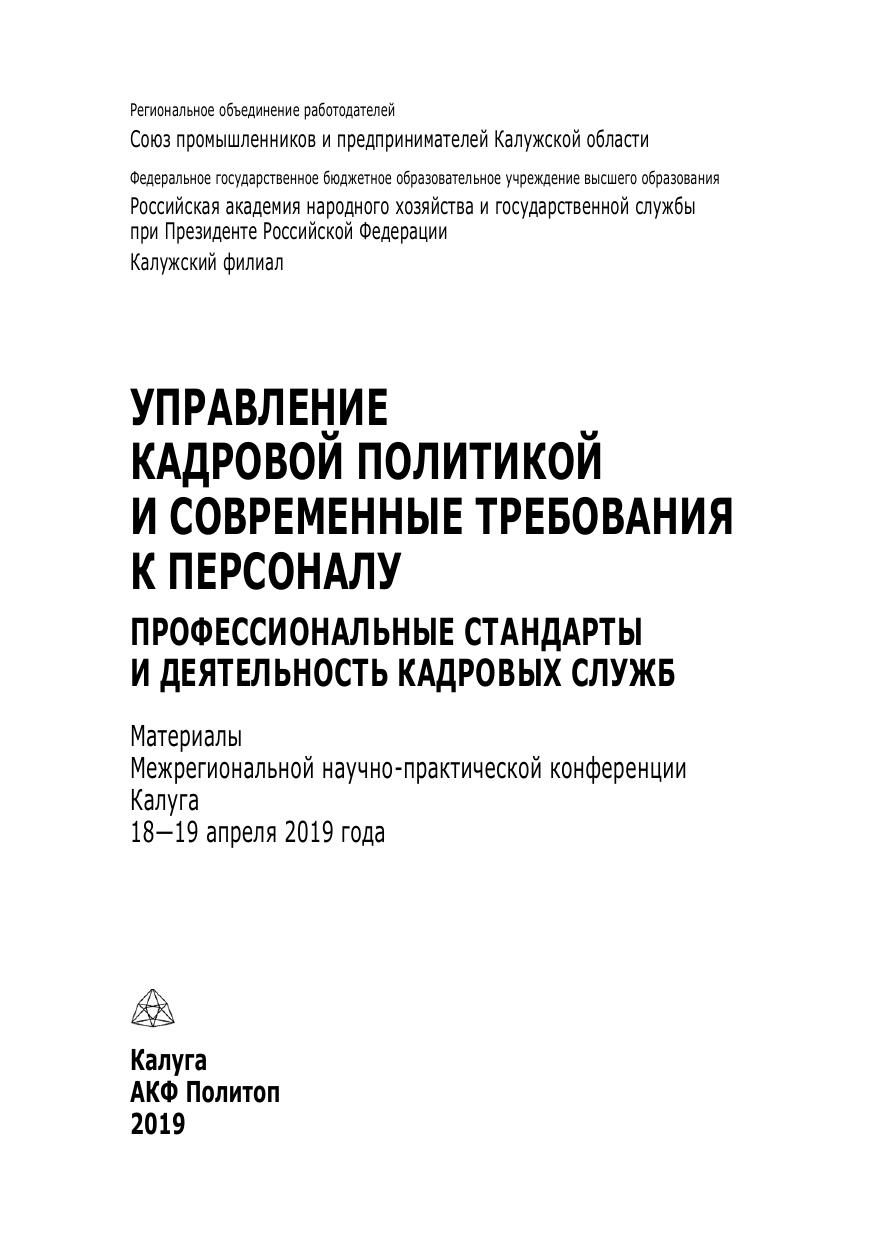 Управление кадровой политикой и современные требования к персоналу: Профессиональные стандарты и деятельность кадровых служб: Материалы Межрегиональной научно-практической конференции. Калуга, 8—19 апреля 2018 года