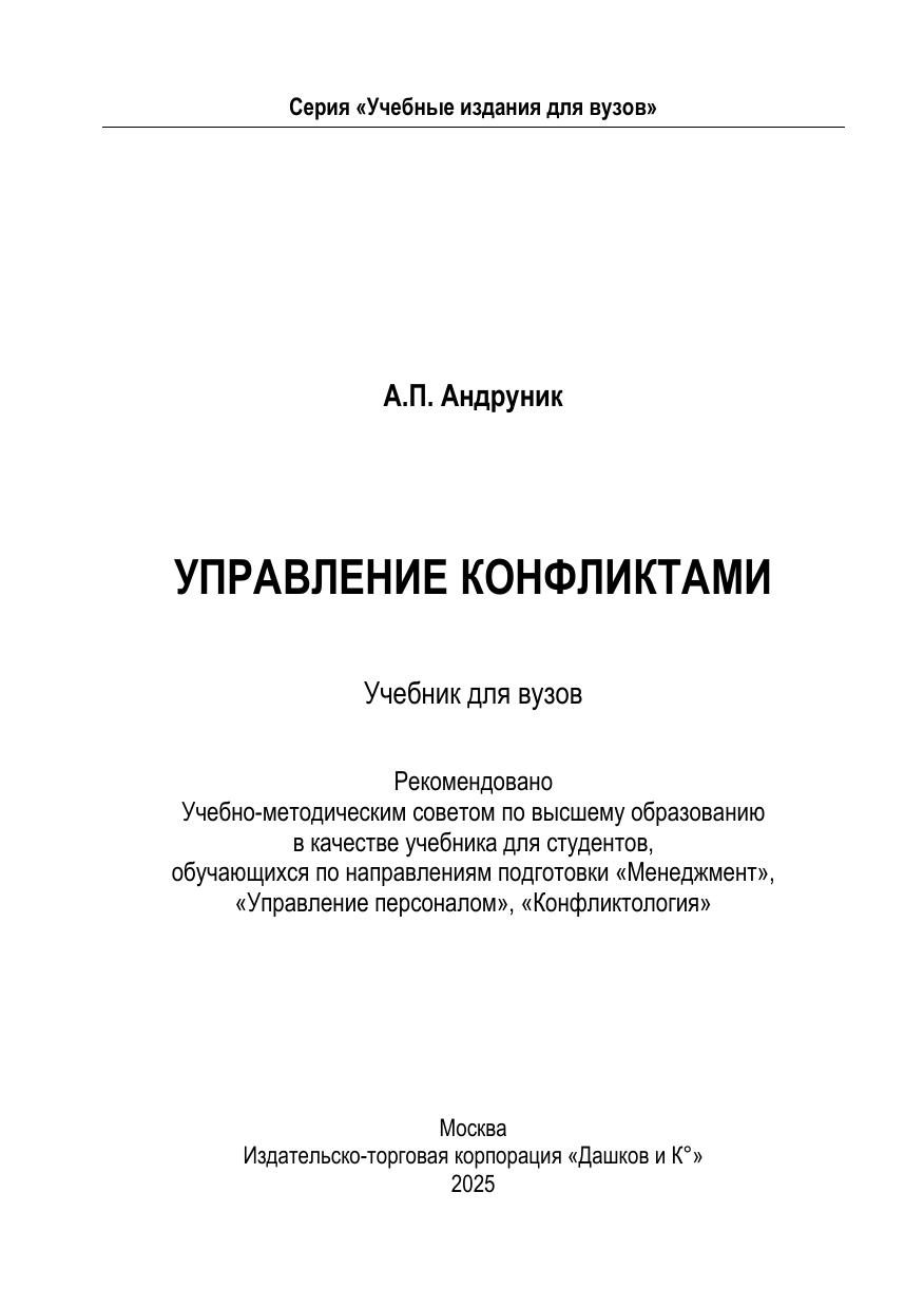 В учебнике объединены основополагающие принципы и технологии кадрового менеджмента и конфликтологии с целью создания системного представления о социальных конфликтах и возможностях управления ими, в том числе в профессиональной деятельности; представлен систематизированный очерк основных проблем конфликтологии; рассматривается понятие конфликта, приводится его этимологический анализ и история становления и развития конфликтологических идей; характеризуются различные типы конфликтов, причины их возникновения, варианты развития конфликтных ситуаций; приводятся различные стратегии управления поведением персонала в конфликте. Для студентов вузов, обучающихся по направлениям подготовки «Менеджмент», «Управление персоналом», «Конфликтология», а также всех, кто интересуется психологическими аспектами управления поведением и взаимоотношений в коллективе и желает получить практически полезные знания о том, как разрешать конфликты.
