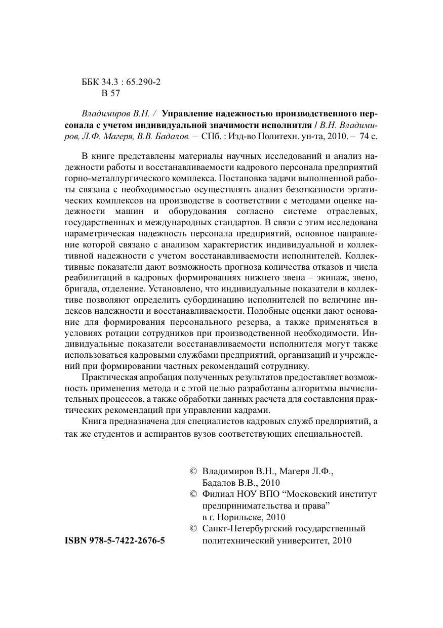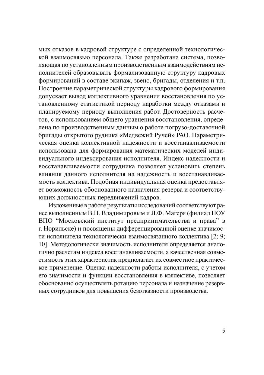В книге представлены материалы научных исследований и анализ надежности работы и восстанавливаемости кадрового персонала предприятий горно-металлургического комплекса. Постановка задачи выполненной работы связана с необходимостью осуществлять анализ безотказности эргати-ческих комплексов на производстве в соответствии с методами оценке надежности машин и оборудования согласно системе отраслевых, государственных и международных стандартов. В связи с этим исследована параметрическая надежность персонала предприятий, основное направление которой связано с анализом характеристик индивидуальной и коллективной надежности с учетом восстанавливаемости исполнителей. Коллективные показатели дают возможность прогноза количества отказов и числа реабилитаций в кадровых формированиях нижнего звена - экипаж, звено, бригада, отделение. Установлено, что индивидуальные показатели в коллективе позволяют определить субординацию исполнителей по величине индексов надежности и восстанавливаемости. Подобные оценки дают основание для формирования персонального резерва, а также применяться в условиях ротации сотрудников при производственной необходимости. Индивидуальные показатели восстанавливаемости исполнителя могут также использоваться кадровыми службами предприятий, организаций и учреждений при формировании частных рекомендаций сотруднику.Практическая апробация полученных результатов предоставляет возможность применения метода и с этой целью разработаны алгоритмы вычислительных процессов, а также обработки данных расчета для составления практических рекомендаций при управлении кадрами.Книга предназначена для специалистов кадровых служб предприятий, а так же студентов и аспирантов вузов соответствующих специальностей.