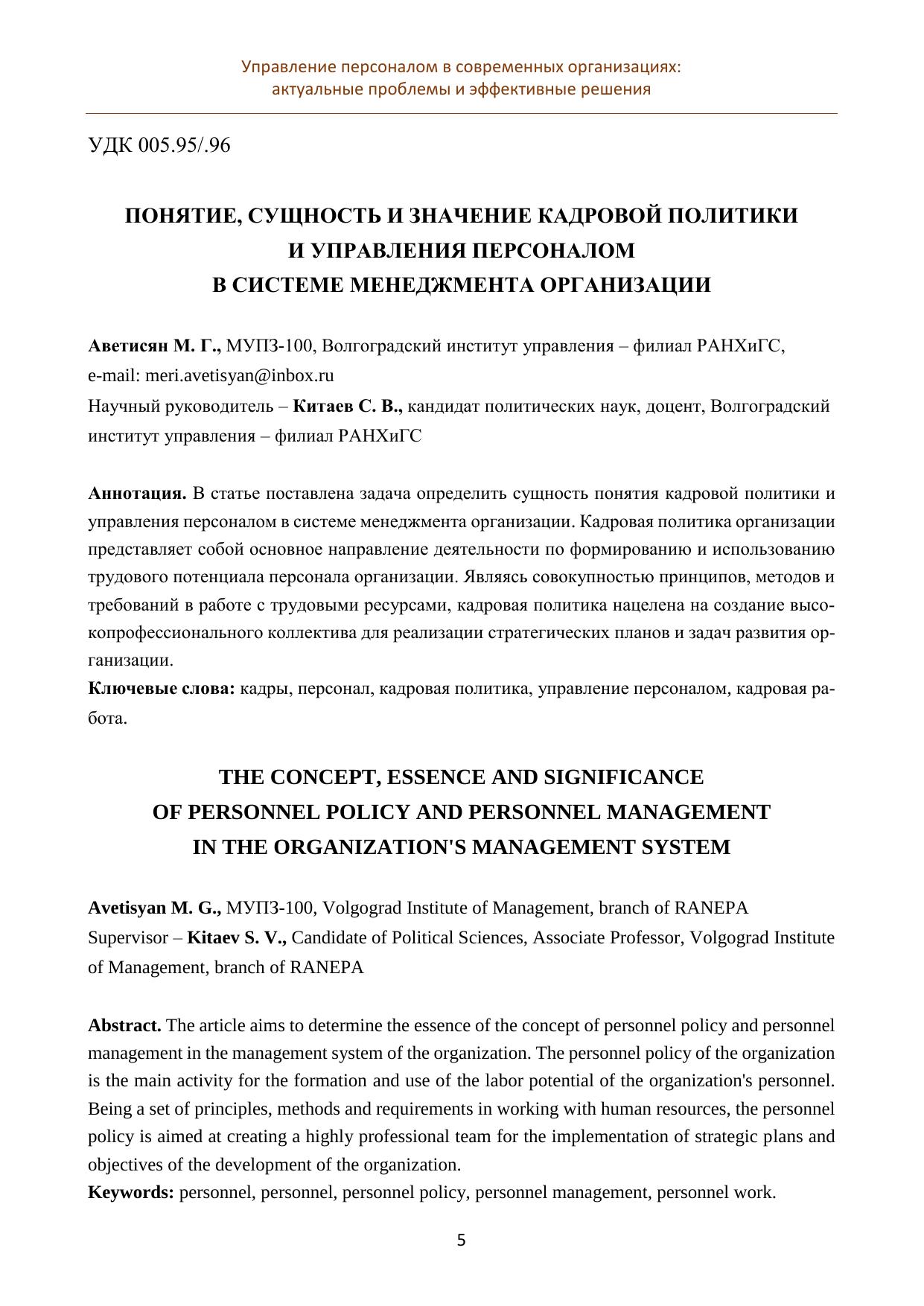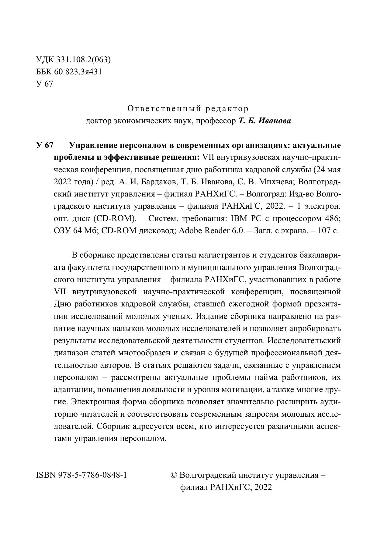 В сборнике представлены статьи магистрантов и студентов бакалавриата факультета государственного и муниципального управления Волгоградского института управления – филиала РАНХиГС, участвовавших в работе VII внутривузовской научно-практической конференции, посвященной Дню работников кадровой службы, ставшей ежегодной формой презентации исследований молодых ученых. Издание сборника направлено на развитие научных навыков молодых исследователей и позволяет апробировать результаты исследовательской деятельности студентов. Исследовательский диапазон статей многообразен и связан с будущей профессиональной деятельностью авторов. В статьях решаются задачи, связанные с управлением персоналом – рассмотрены актуальные проблемы найма работников, их адаптации, повышения лояльности и уровня мотивации, а также многие другие. Электронная форма сборника позволяет значительно расширить аудиторию читателей и соответствовать современным запросам молодых исследователей. Сборник адресуется всем, кто интересуется различными аспектами управления персоналом.