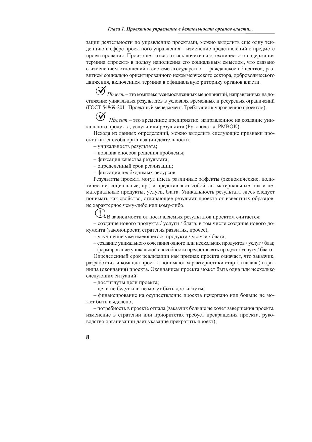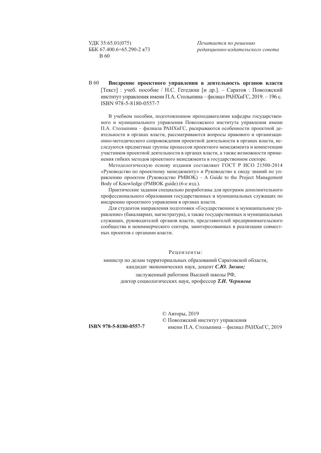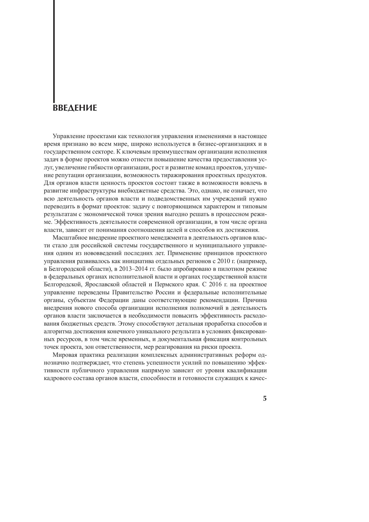 В учебном пособии, подготовленном преподавателями кафедры государственного и муниципального управления Поволжского института управления имени П.А. Столыпина – филиала РАНХиГС, раскрываются особенности проектной деятельности в органах власти, рассматриваются вопросы правового и организационно-методического сопровождения проектной деятельности в органах власти, исследуются предметные группы процессов проектного менеджмента и компетенции участников проектной деятельности в органах власти, а также возможности применения гибких методов проектного менеджмента в государственном секторе. Методологическую основу издания составляют ГОСТ Р ИСО 21500-2014 «Руководство по проектному менеджменту» и Руководство к своду знаний по управлению проектом (Руководство PMBOK) – A Guide to the Project Management Body of Knowledge (PMBOK guide) (6-е изд.). Практические задания специально разработаны для программ дополнительного профессионального образования государственных и муниципальных служащих по внедрению проектного управления в органах власти. Для студентов направления подготовки «Государственное и муниципальное управление» (бакалавриат, магистратура), а также государственных и муниципальных служащих, руководителей органов власти, представителей предпринимательского сообщества и некоммерческого сектора, заинтересованных в реализации совместных проектов с органами власти.
