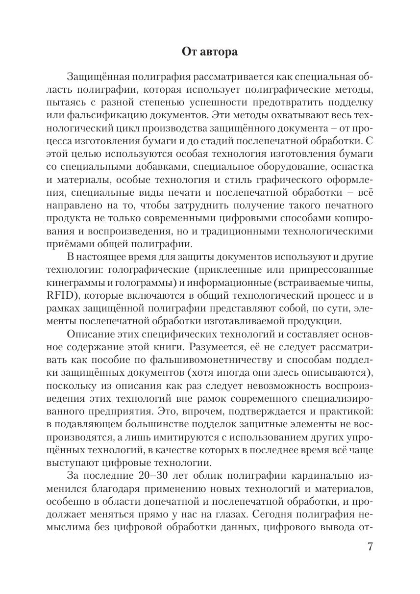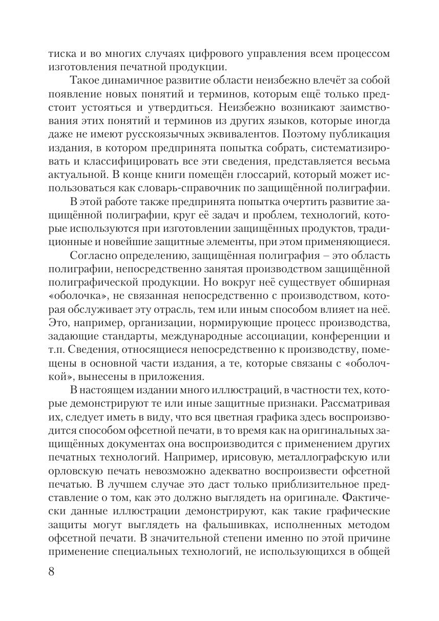 Книга посвящена специальной области полиграфии, которую принято называть защищённой полиграфией и которая использует полиграфические методы для предотвращения возможности подделки или фальсификации защищённой полиграфической продукции. К защищённой полиграфической продукции относят банкноты, ценные бумаги, документы, удостоверяющие личность, имущественные и иные права (паспорта, удостоверения, дипломы, различного рода свидетельства и т.п.), дорожные чеки, лотерейные билеты и другую полиграфическую продукцию, которая по тем или иным причинам нуждается в мерах по