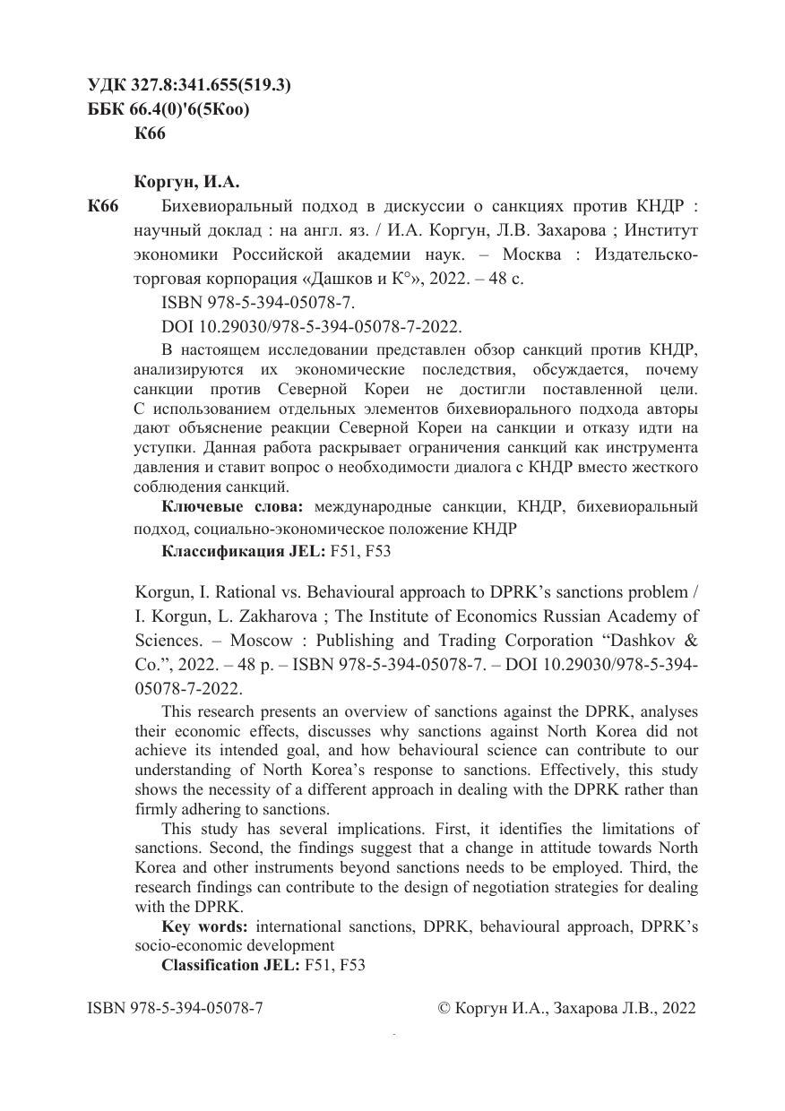 С использованием отдельных элементов бихевиорального подхода авторы дают объяснение реакции Северной Кореи на санкции и отказу идти на уступки. Данная работа раскрывает ограничения санкций как инструмента давления и ставит вопрос о необходимости диалога с КНДР вместо жесткого соблюдения санкций.