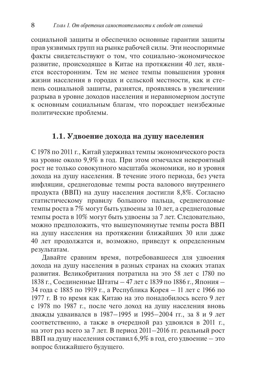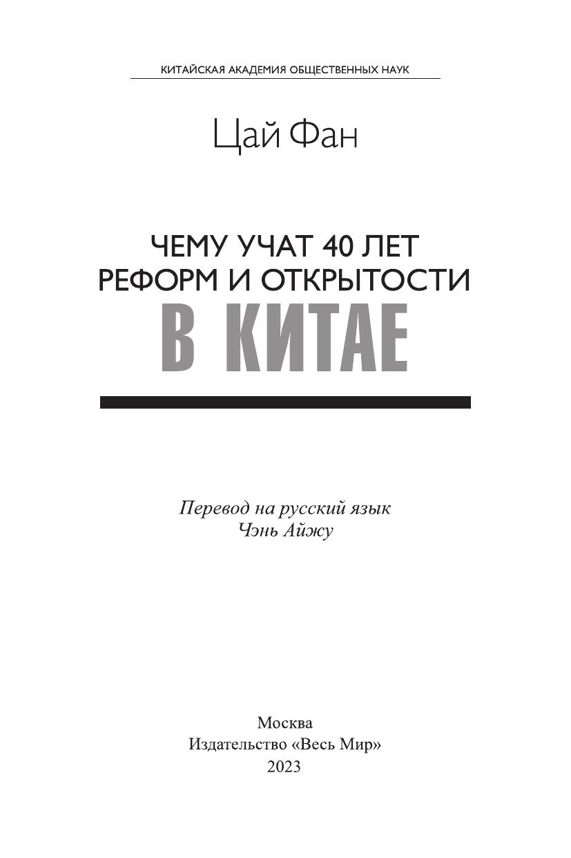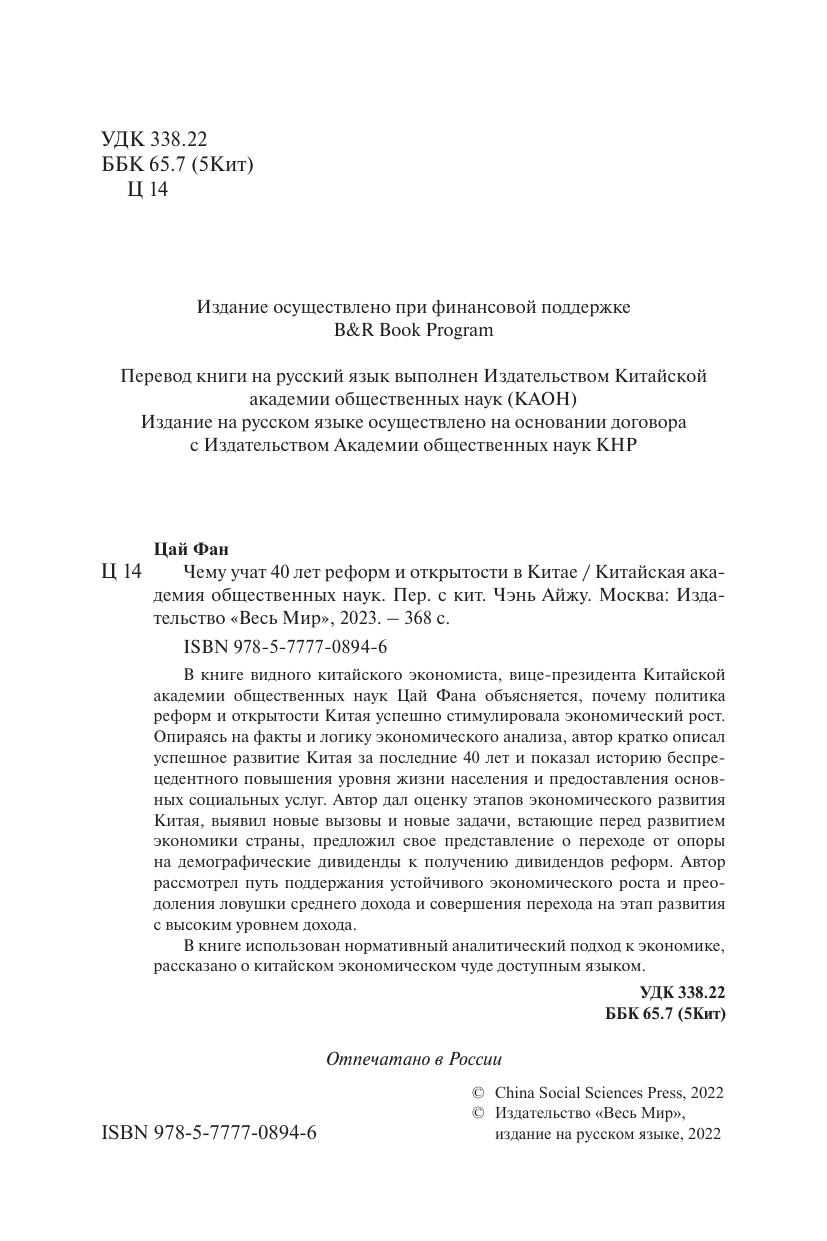 В книге видного китайского экономиста, вице-президента Китайской академии общественных наук Цай Фана объясняется, почему политика реформ и открытости Китая успешно стимулировала экономический рост. Опираясь на факты и логику экономического анализа, автор кратко описал успешное развитие Китая за последние 40 лет и показал историю беспрецедентного повышения уровня жизни населения и предоставления основных социальных услуг. Автор дал оценку этапов экономического развития Китая, выявил новые вызовы и новые задачи, встающие перед развитием экономики страны, предложил свое представление о переходе от опоры на демографические дивиденды к получению дивидендов реформ. Автор рассмотрел путь поддержания устойчивого экономического роста и преодоления ловушки среднего дохода и совершения перехода на этап развития с высоким уровнем дохода. В книге использован нормативный аналитический подход к экономике, рассказано о китайском экономическом чуде доступным языком.