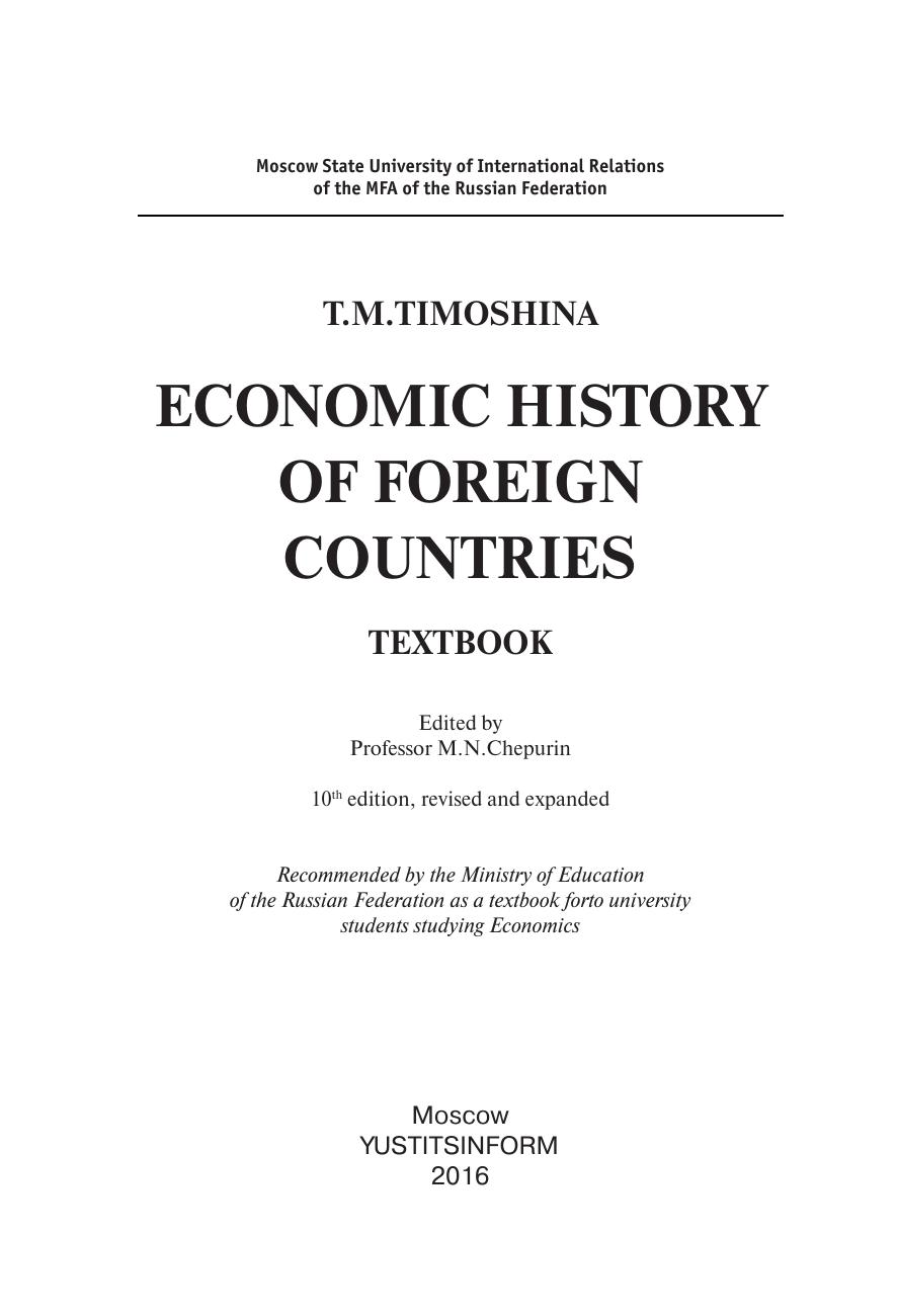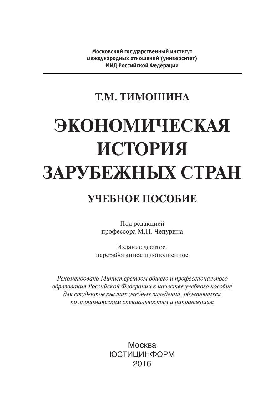 Настоящее учебное пособие подготовлено профессором кафедры экономической теории МГиМо(У) т.М. тимошиной, в течение многих лет читающей курс истории экономики. Автор излагает экономическую историю зарубежных стран начиная с древних цивилизаций (Древнего Египта, Древней Греции, Древнего рима) до настоящего времени. В работе рассматривается средневековое хозяйство стран Западной Европы, процесс становления в Европе рыночной экономики в XVI–XVII веках.