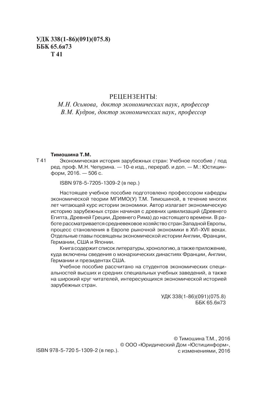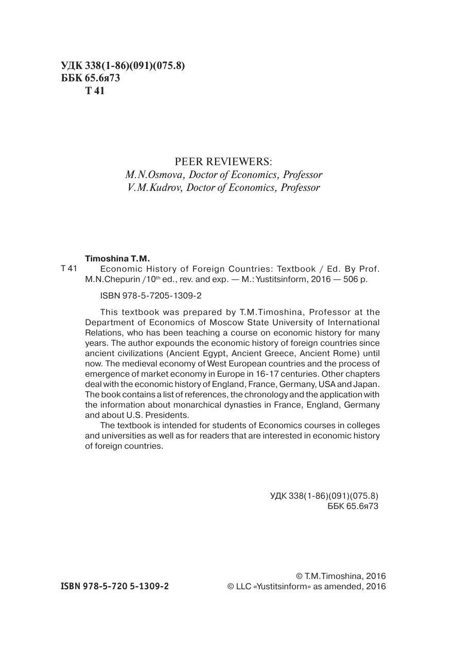 Отдельные главы посвящены экономической истории Англии, франции, Германии, сША и Японии. Книга содержит список литературы, хронологию, а также приложение, куда включены сведения о монархических династиях франции, Англии, Германии и президентах США. Учебное пособие рассчитано на студентов экономических специальностей высших и средних специальных учебных заведений, а также на широкий круг читателей, интересующихся экономической историей зарубежных стран.