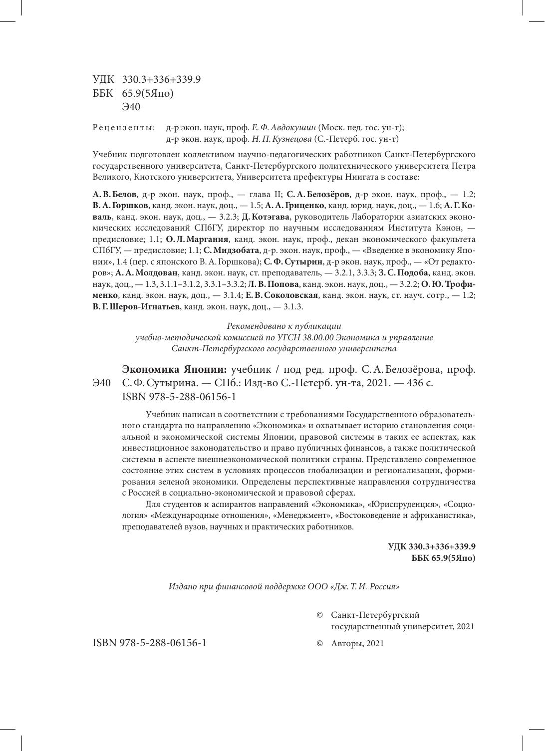 Учебник написан в соответствии с требованиями Государственного образовательного стандарта по направлению "Экономика" и охватывает историю становления социальной и экономической системы Японии, правовой системы в таких ее аспектах, как инвестиционное законодательство и право публичных финансов, а также политической системы в аспекте внешнеэкономической политики страны. Представлено современное состояние этих систем в условиях процессов глобализации и регионализации, формирования зеленой экономики. Определены перспективные направления сотрудничества с Россией в социально-экономической и правовых сферах.
