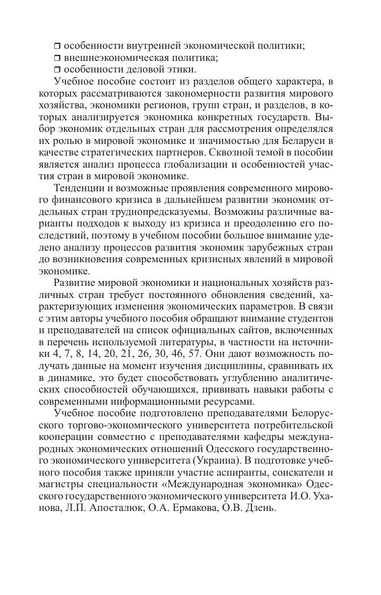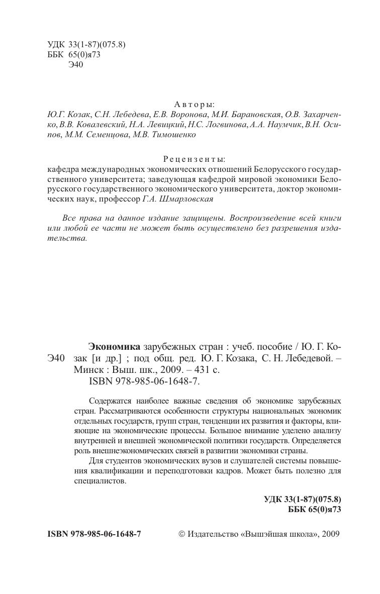 Содержатся наиболее важные сведения об экономике зарубежных стран. Рассматриваются особенности структуры национальных экономик отдельных государств, групп стран, тенденции их развития и факторы, влияющие на экономические процессы. Большое внимание уделено анализу внутренней и внешней экономической политики государств. Определяется роль внешнеэкономических связей в развитии экономики страны.