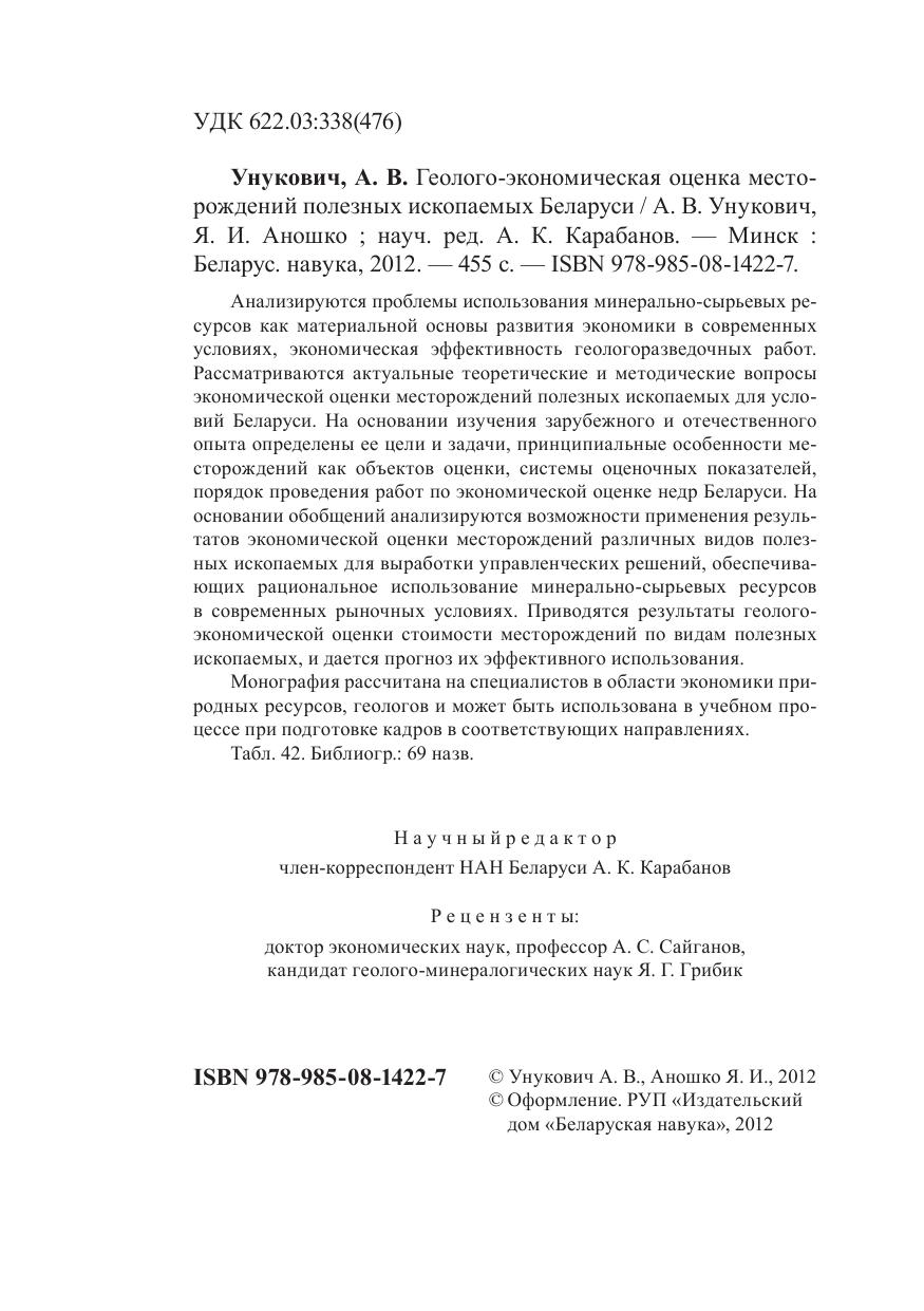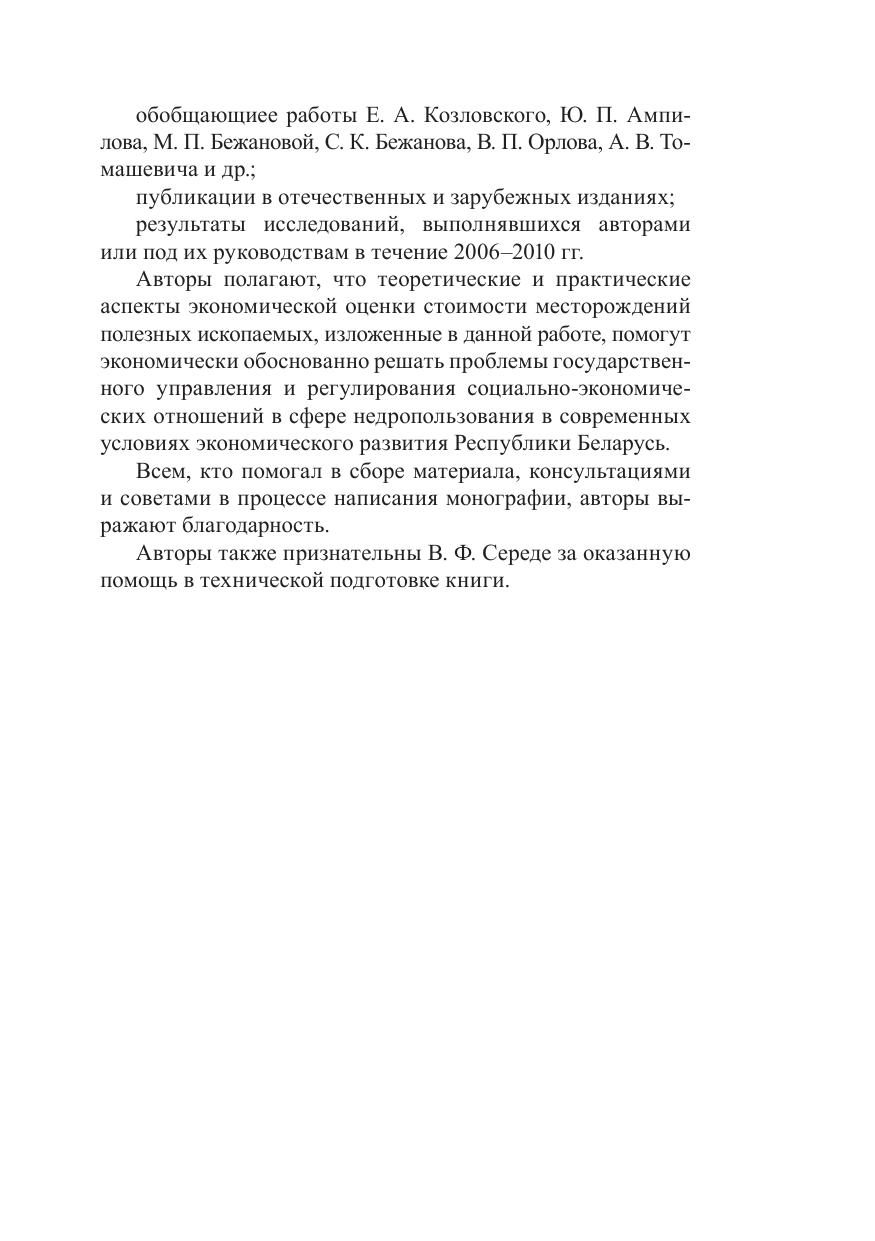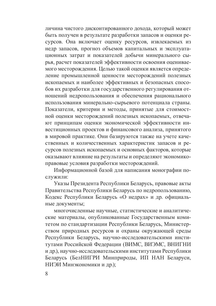 Анализируются проблемы использования минерально-сырьевых ресурсов как материальной основы развития экономики в современных условиях, экономическая эффективность геологоразведочных работ. Рассматриваются актуальные теоретические и методические вопросы экономической оценки месторождений полезных ископаемых для условий Беларуси. На основании изучения зарубежного и отечественного опыта определены ее цели и задачи, принципиальные особенности месторождений как объектов оценки, системы оценочных показателей, порядок проведения работ по экономической оценке недр Беларуси. На основании обобщений анализируются возможности применения результатов экономической оценки месторождений различных видов полезных ископаемых для выработки управленческих решений, обеспечивающих рациональное использование минерально-сырьевых ресурсов в современных рыночных условиях. Приводятся результаты геолого-экономической оценки стоимости месторождений по видам полезных ископаемых, и дается прогноз их эффективного использования. Монография рассчитана на специалистов в области экономики природных ресурсов, геологов и может быть использована в учебном процессе при подготовке кадров в соответствующих направлениях.