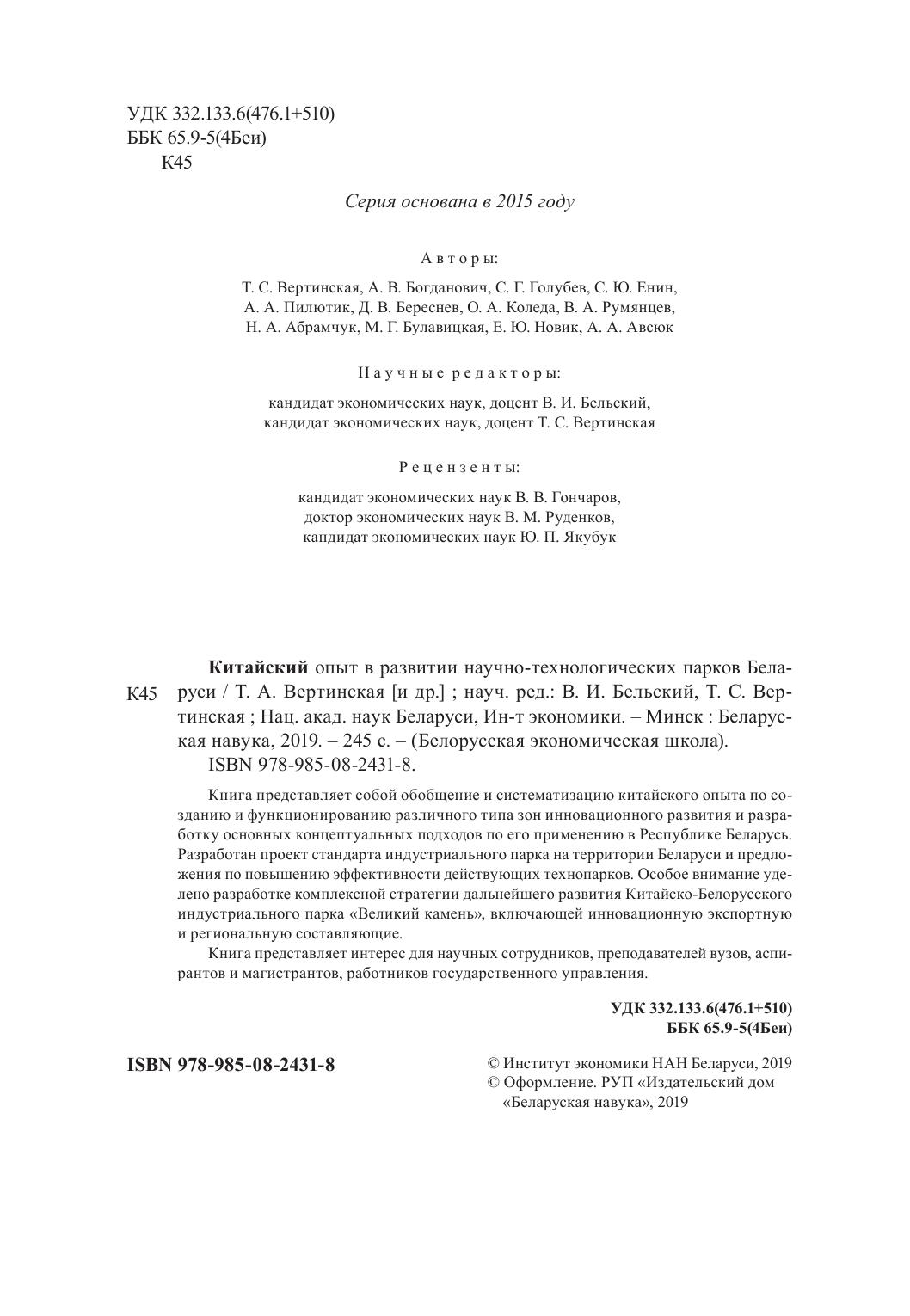 Книга представляет собой обобщение и систематизацию китайского опыта по созданию и функционированию различного типа зон инновационного развития и разработку основных концептуальных подходов по его применению в Республике Беларусь. Разработан проект стандарта индустриального парка на территории Беларуси и предложения по повышению эффективности действующих технопарков. Особое внимание уделено разработке комплексной стратегии дальнейшего развития Китайско-Белорусского индустриального парка «Великий камень», включающей инновационную экспортную и региональную составляющие. Книга представляет интерес для научных сотрудников, преподавателей вузов, аспирантов и магистрантов, работников государственного управления.