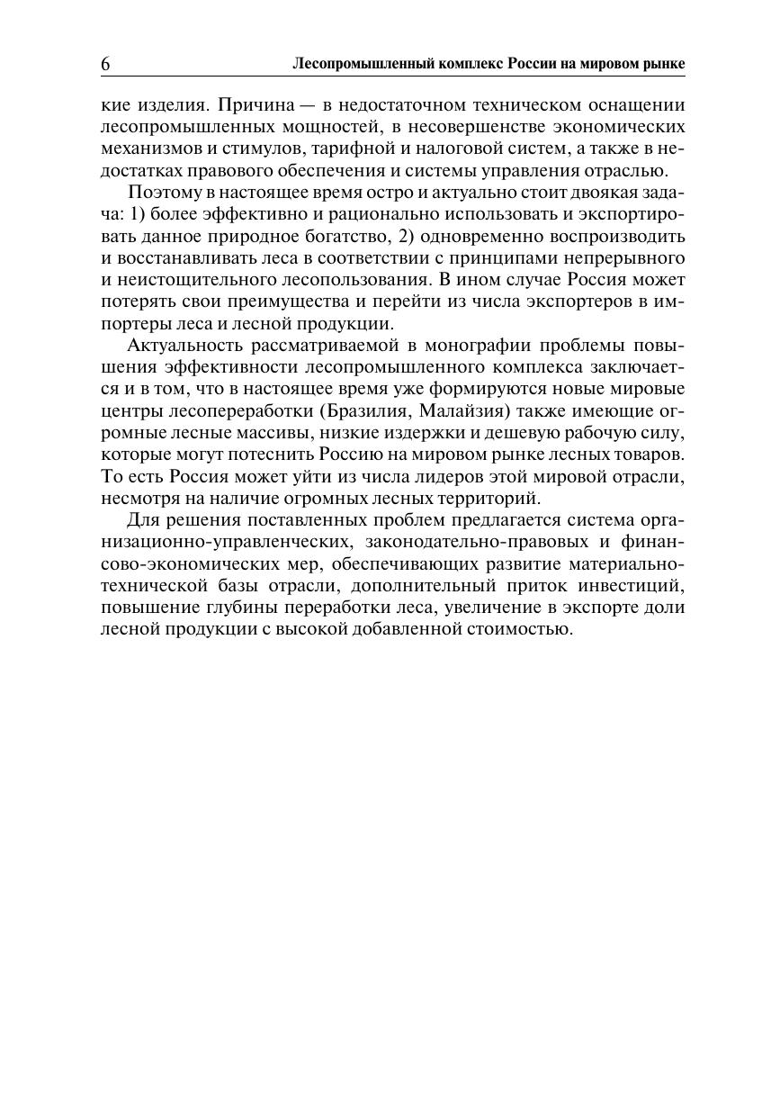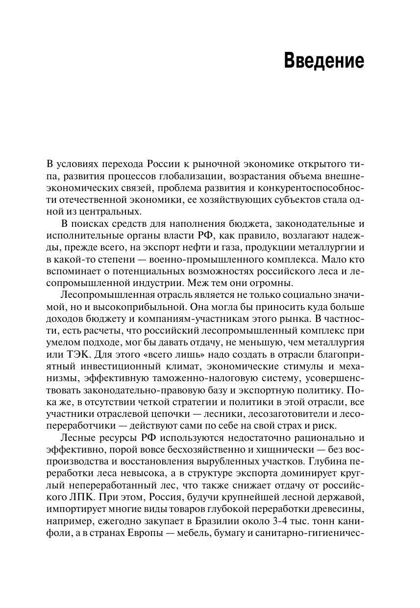 В данной монографии исследовано современное состояние России на мировом лесопромышленном рынке, рассмотрены тенденции развития мирового лесопромышленного комплекса, дана оценка сырьевой базы российского лесопромышленного комплекса (ЛПК), сформулированы пути повышения конкуренто-способности ЛПК РФ на мировом рынке. Материалы и выводы, содержащиеся в монографии могут быть использованы в качестве теоретического и практического материала при разработке внешнеэкономической стратегии России и ее субъектов, исследование также может представлять интерес для преподавателей при разработке соответствующих разделов учебных курсов в институтах экономического профиля.