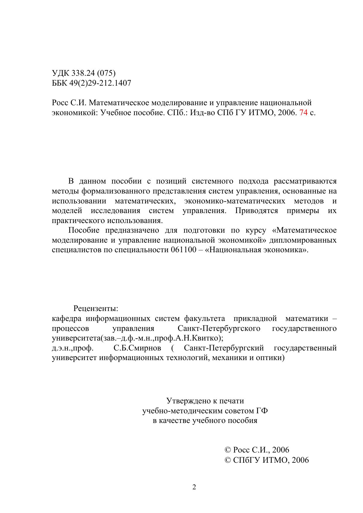 В данном пособии с позиций системного подхода рассматриваются методы формализованного представления систем управления, основанные на использовании математических, экономико-математических методов и моделей исследования систем управления. Приводятся примеры их практического использования. Пособие предназначено для подготовки по курсу «Математическое моделирование и управление национальной экономикой» дипломированных специалистов по специальности 061100 – «Национальная экономика».
