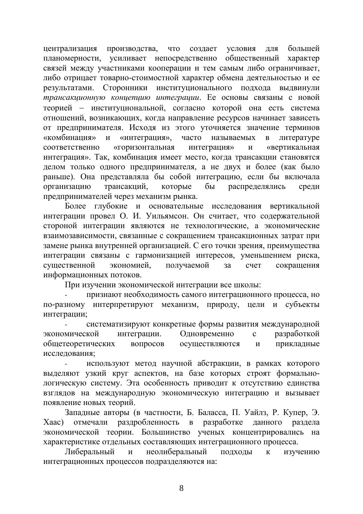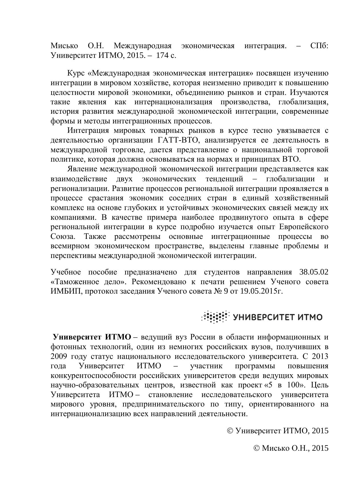 Курс «Международная экономическая интеграция» посвящен изучению интеграции в мировом хозяйстве, которая неизменно приводит к повышению целостности мировой экономики, объединению рынков и стран. Изучаются такие явления как интернационализация производства, глобализация, история развития международной экономической интеграции, современные формы и методы интеграционных процессов. Интеграция мировых товарных рынков в курсе тесно увязывается сдеятельностью организации ГАТТ-ВТО, анализируется ее деятельность в международной торговле, дается представление о национальной торговой политике, которая должна основываться на нормах и принципах ВТО. Явление международной экономической интеграции представляется как взаимодействие двух экономических тенденций - глобализации и регионализации. Развитие процессов региональной интеграции проявляется в процессе срастания экономик соседних стран в единый хозяйственный комплекс на основе глубоких и устойчивых экономических связей между их компаниями. В качестве примера наиболее продвинутого опыта в сфере региональной интеграции в курсе подробно изучается опыт Европейского Союза. Также рассмотрены основные интеграционные процессы во всемирном экономическом пространстве, выделены главные проблемы и перспективы международной экономической интеграции.