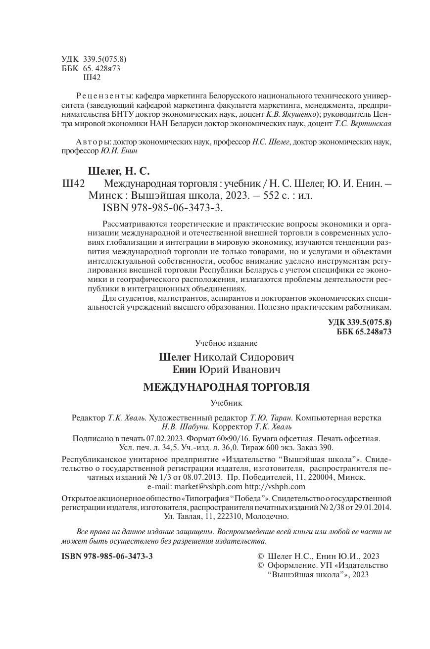 Рассматриваются теоретические и практические вопросы экономики и организации международной и отечественной внешней торговли в современных условиях глобализации и интеграции в мировую экономику, изучаются тенденции развития международной торговли не только товарами, но и услугами и объектами интеллектуальной собственности, особое внимание уделено инструментам регулирования внешней торговли Республики Беларусь с учетом специфики ее экономики и географического расположения, излагаются проблемы деятельности республики в интеграционных объединениях. Для студентов, магистрантов, аспирантов и докторантов экономических специальностей учреждений высшего образования. Полезно практическим работникам.