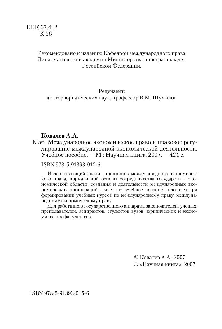 Исчерпывающий анализ принципов международного экономического права, нормативной основы сотрудничества государств в экономической области, создания и деятельности международных экономических организаций делает это учебное пособие полезным при формировании учебных курсов по международному праву, международному экономическому праву. Для работников государственного аппарата, законодателей, ученых, преподавателей, аспирантов, студентов вузов, юридических и экономических факультетов.