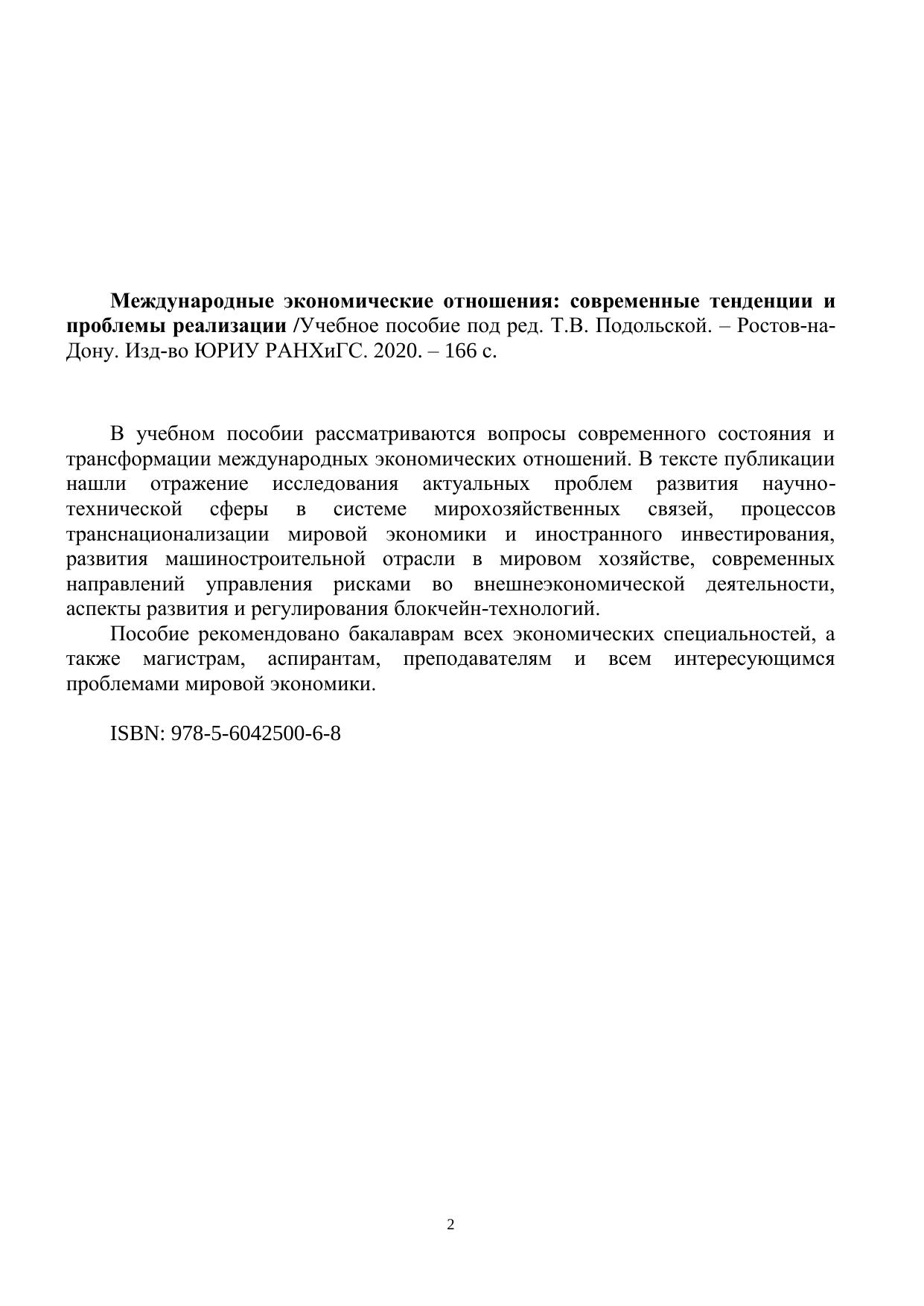 В учебном пособии рассматриваются вопросы современного состояния и трансформации международных экономических отношений. В тексте публикации нашли отражение исследования актуальных проблем развития научно-технической сферы в системе мирохозяйственных связей, процессов транснационализации мировой экономики и иностранного инвестирования, развития машиностроительной отрасли в мировом хозяйстве, современных направлений управления рисками во внешнеэкономической деятельности, аспекты развития и регулирования блокчейн-технологий. Пособие рекомендовано бакалаврам всех экономических специальностей, а также магистрам, аспирантам, преподавателям и всем интересующимся проблемами мировой экономики.